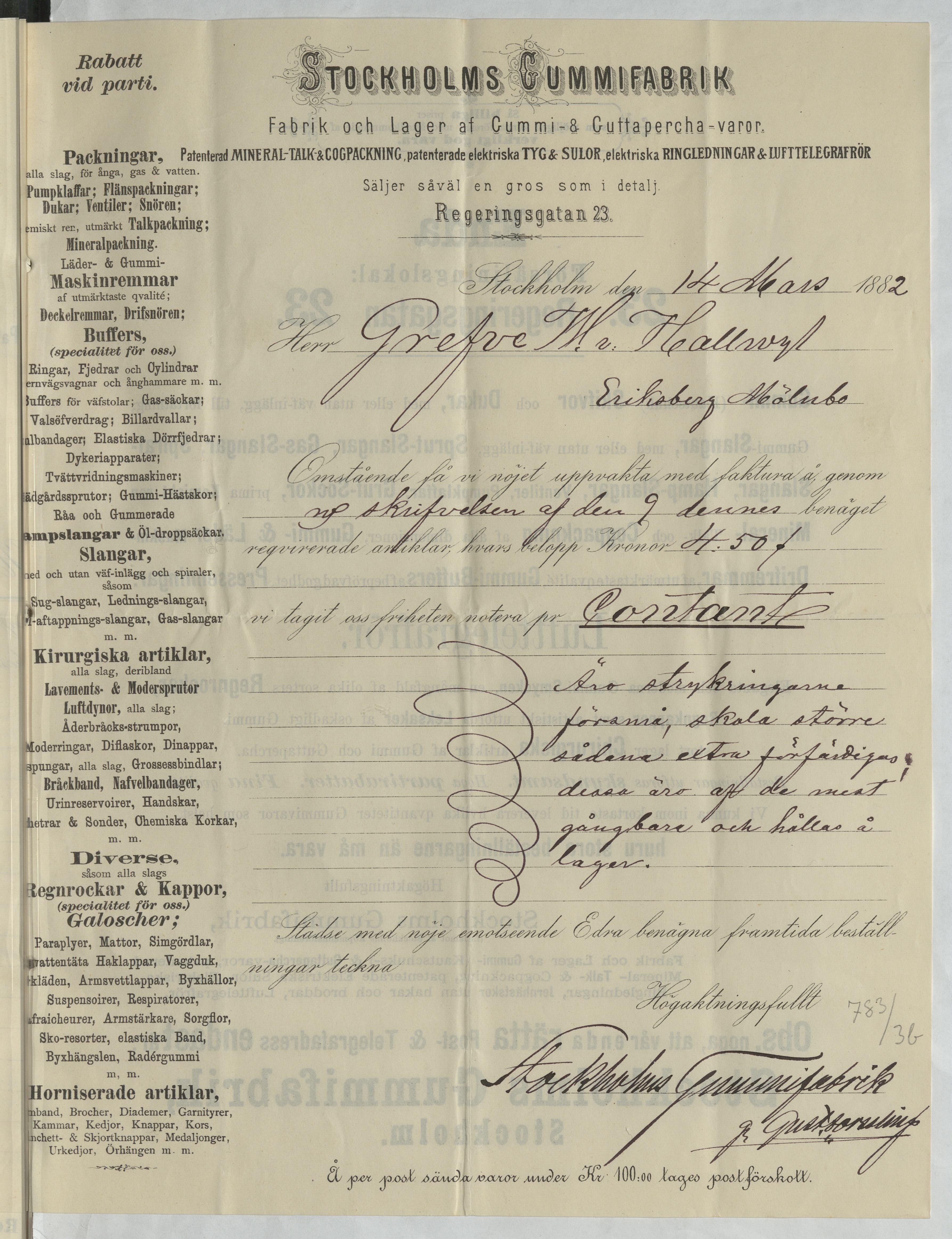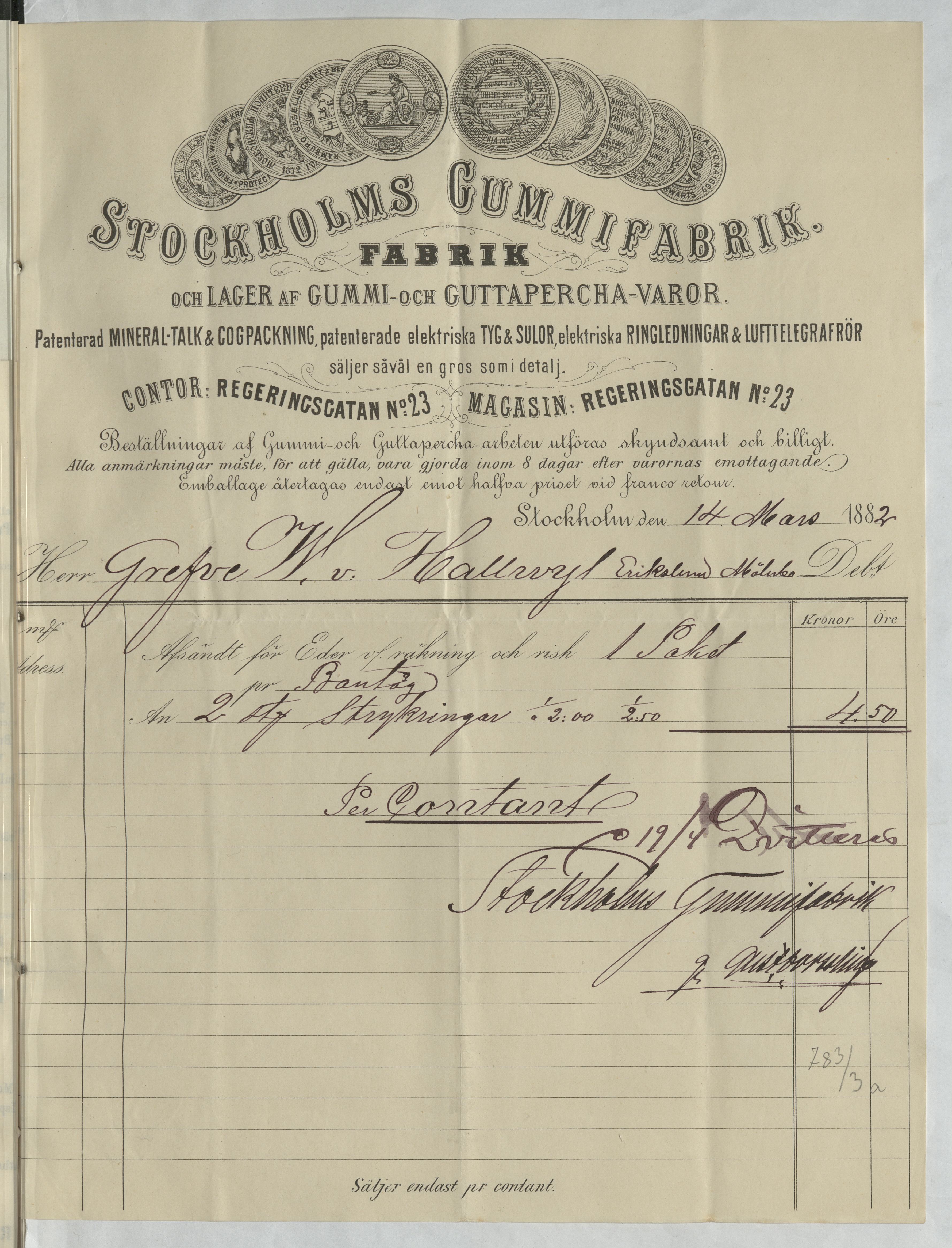 Kvitto från Stockholms Gummifabrik. Stockholm, 1882.