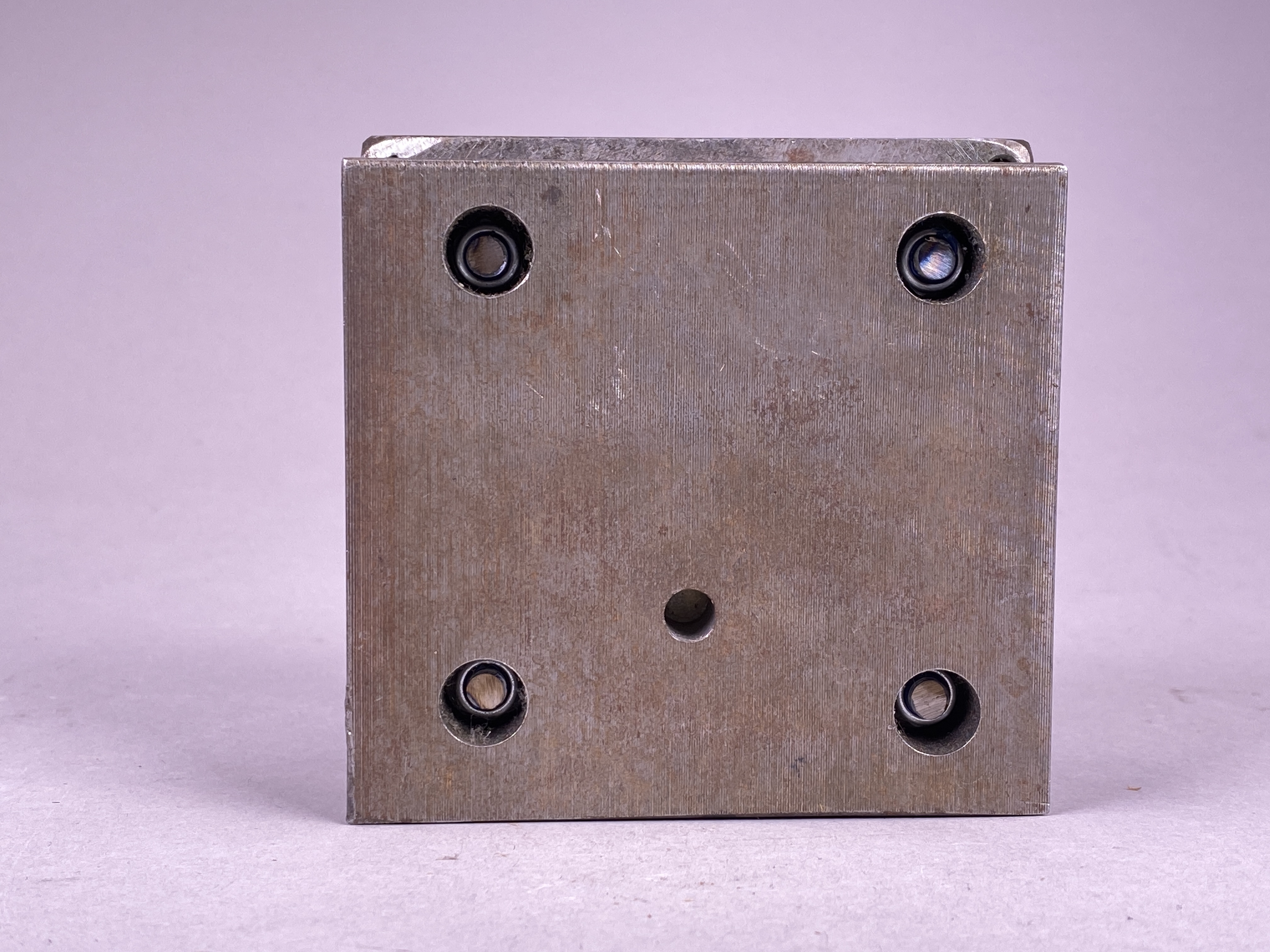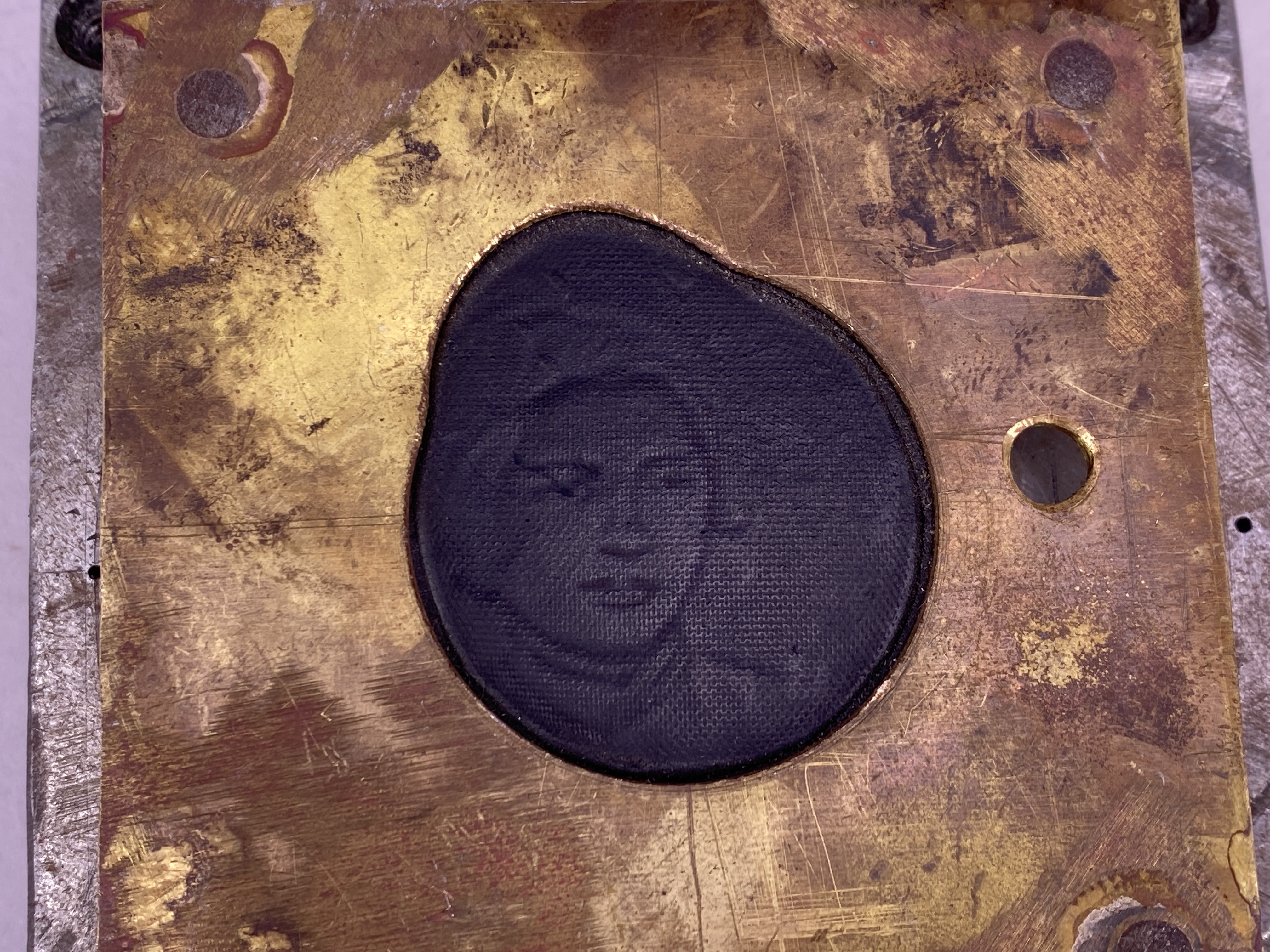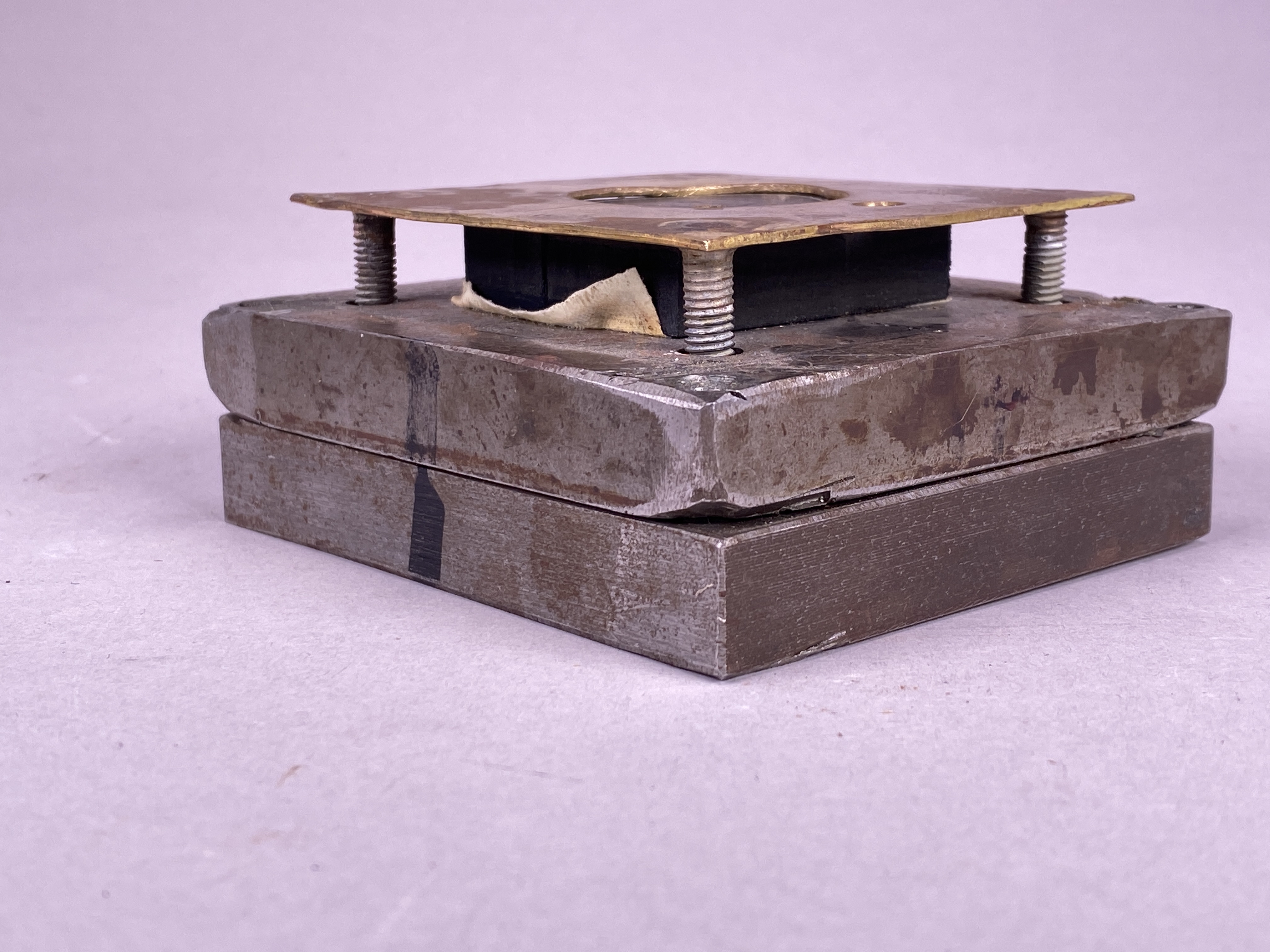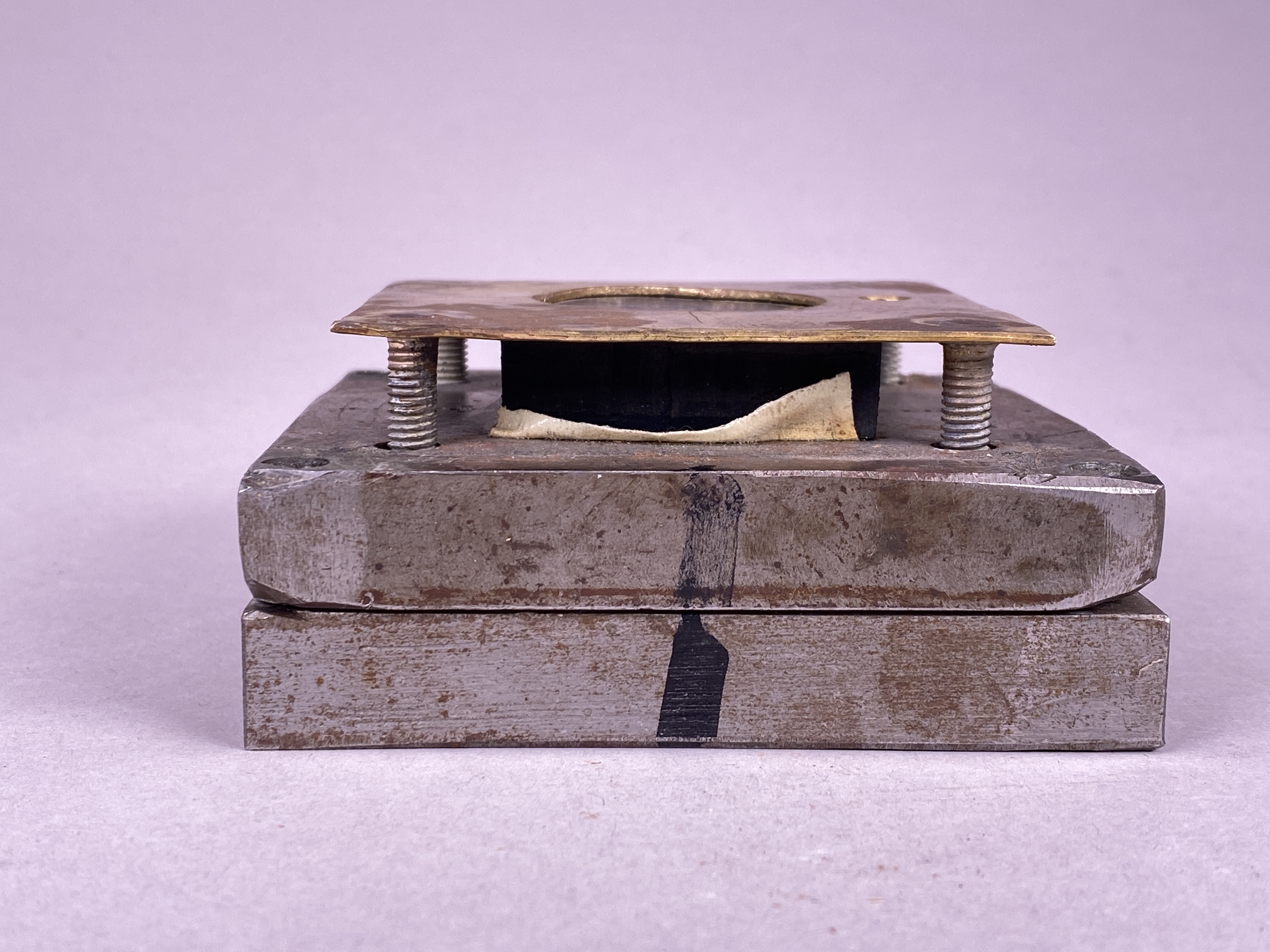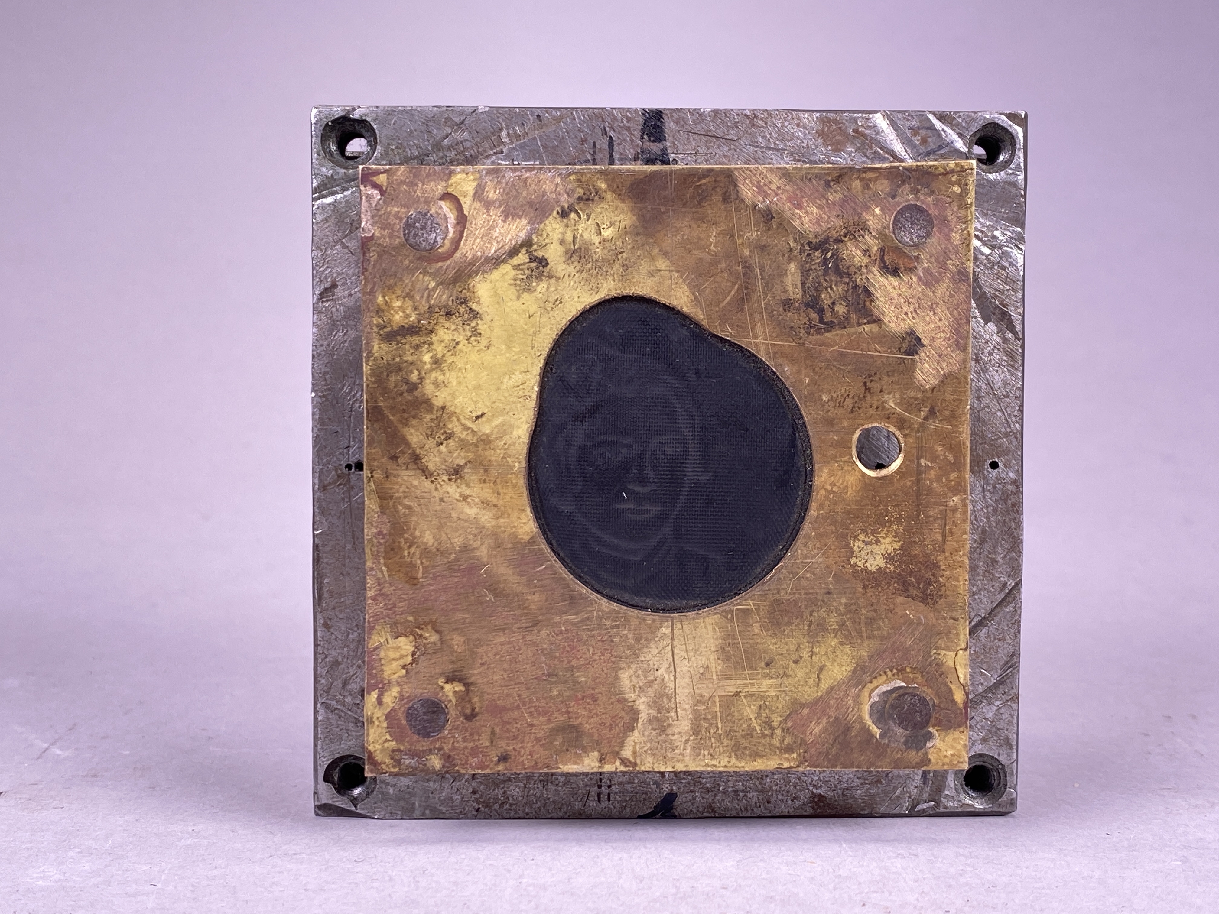 Föremål med okänt användningsområde, tillverkad i järn, mässing och gummi. Föremålet består av två kvadratiska plattor i järn, den ena placerad ovanpå den andra samt fästa i varandra. Ovanpå den övre plattan sitter ytterligare en kvadratisk platta, denna tillverkad i mässing. Mässingplattan är mindre och tunnare än järnplattorna och sitter lätt upphöjd från dessa med hjälp av fyra stavar med gängor. I mellanrummet mellan mässingplattan och järnplattorna sitter en svart kvadratisk bit gummi fastklämd. Gummits ovansida bär ett motiv av ett kvinnoansikte, vilket syns genom en rund urskärning i mässingplattan. Föremålet kan möjligtvis ha fungerat som en form av stämpel, där motivet från gummit överförs till ett nytt material genom högt tryck mot mässingplattan.