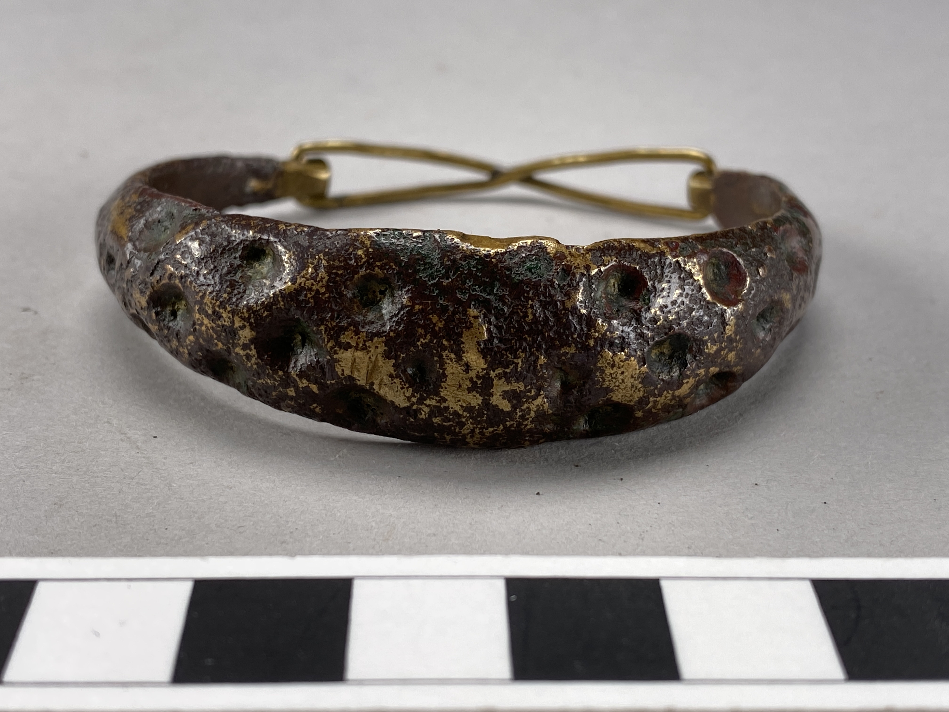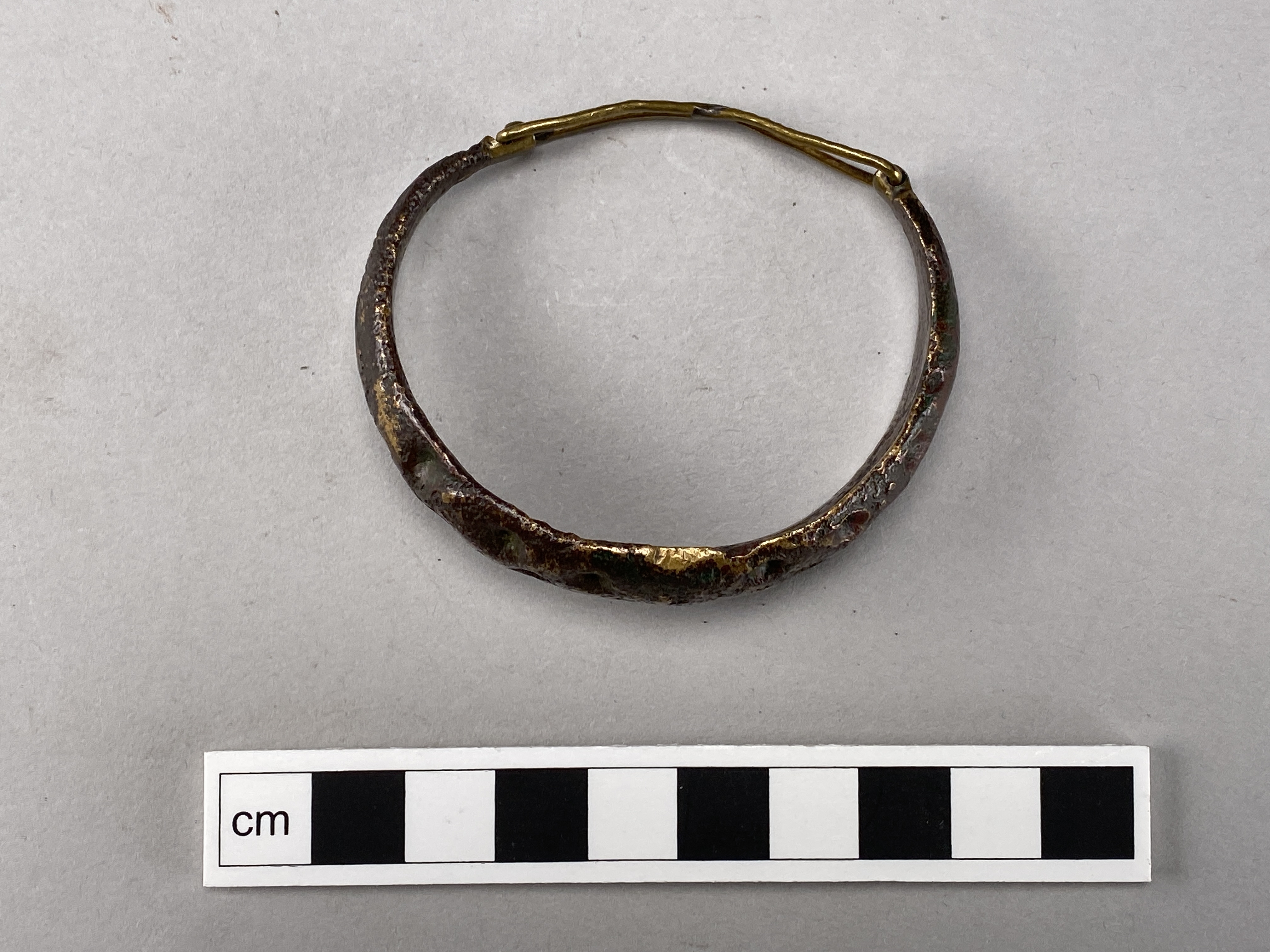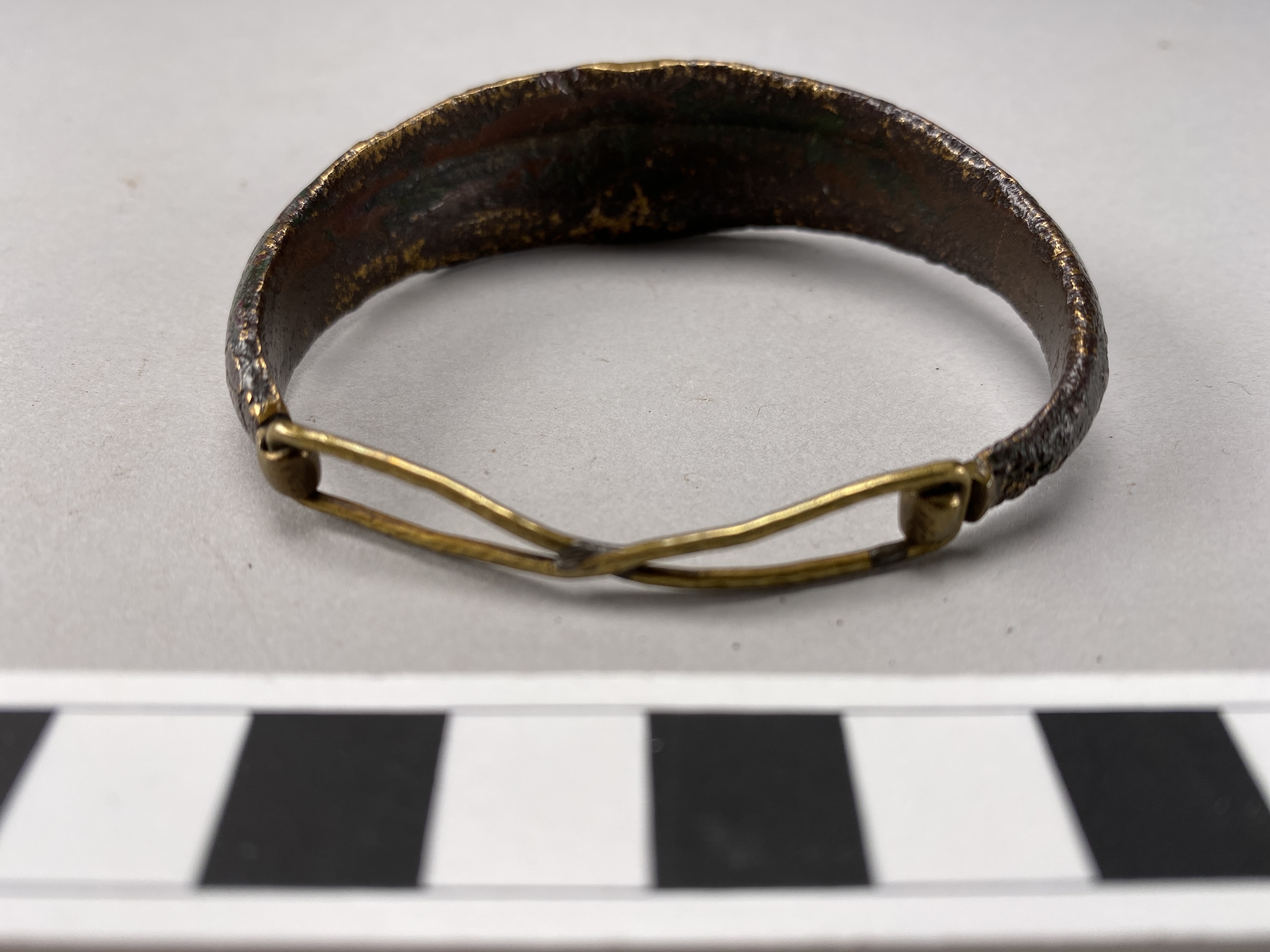 armbygel av brons, öppen, med konkav-konvext tvärsnitt och starkt sliten ornering av flätband på båda sidor om en vertikal mittvulst. Modern försedd med låsanordning.