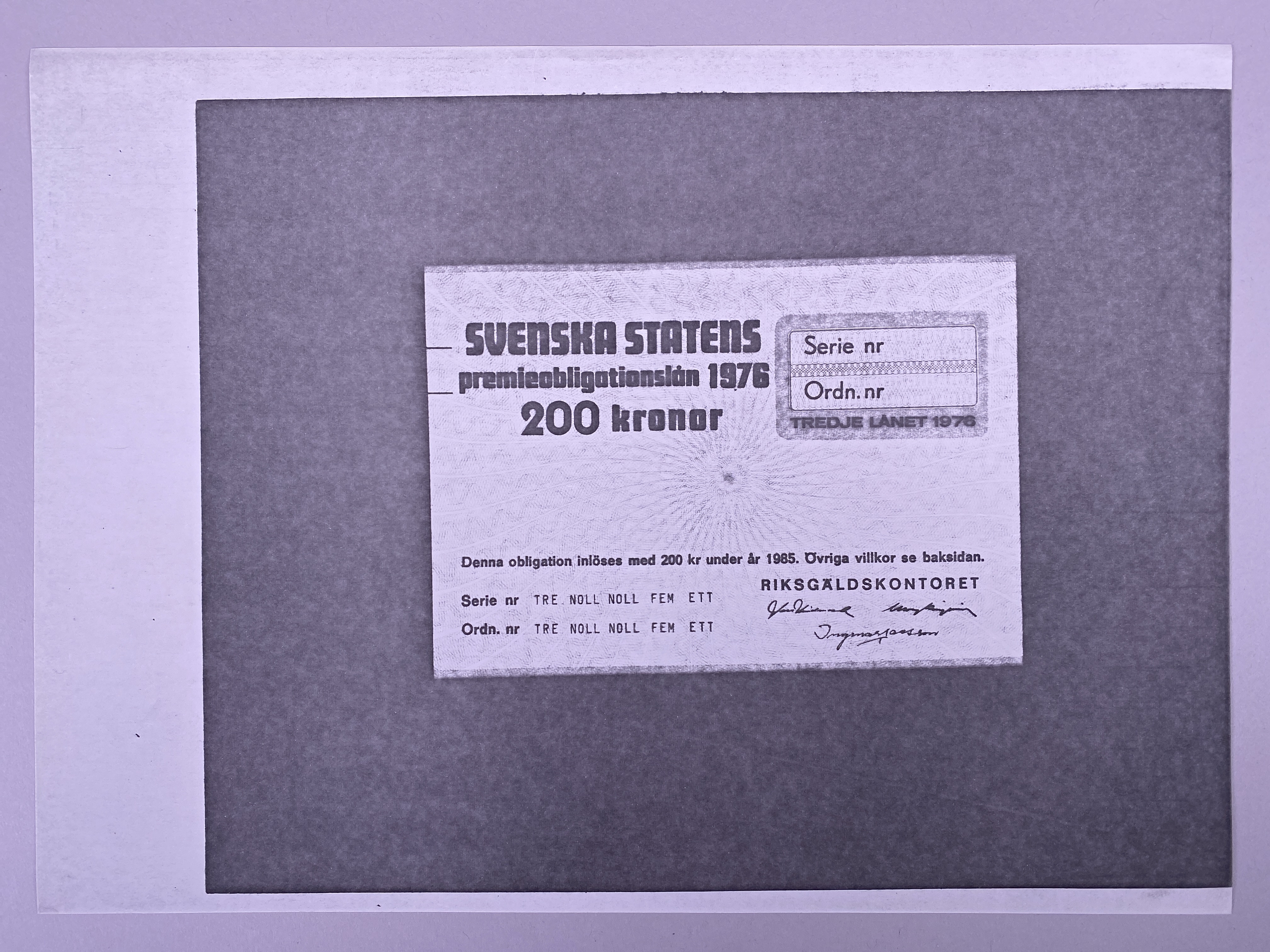 Fotostatkopia på obligation som "inlöses med 200 kr under år 1985". Tredje lånet 1976. Serie nr /, ord. nr /. Designförslag.
