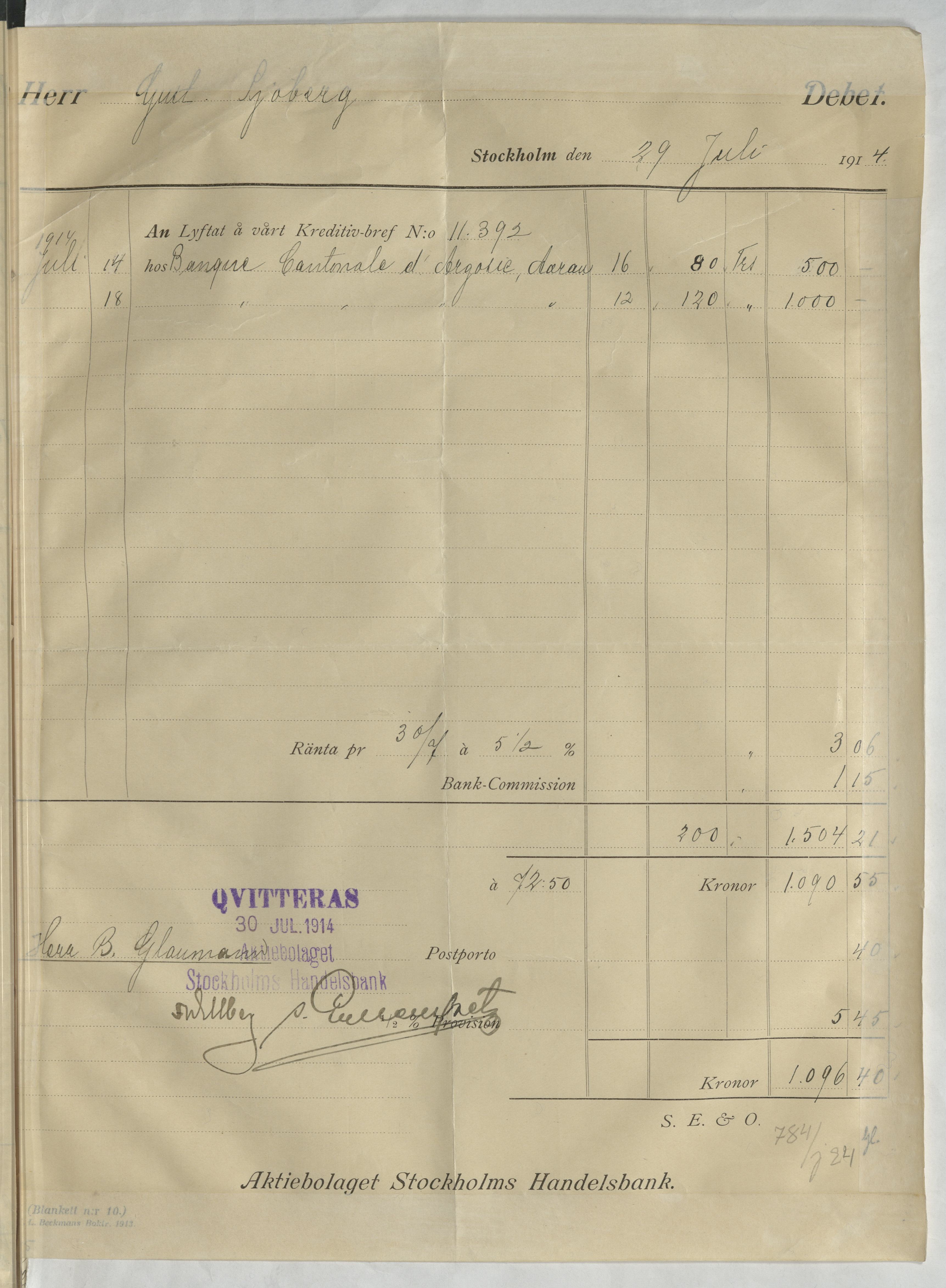 Kvitto från Aktiebolaget Stockholms Handelsbank rörande Sjöberg, Gustaf