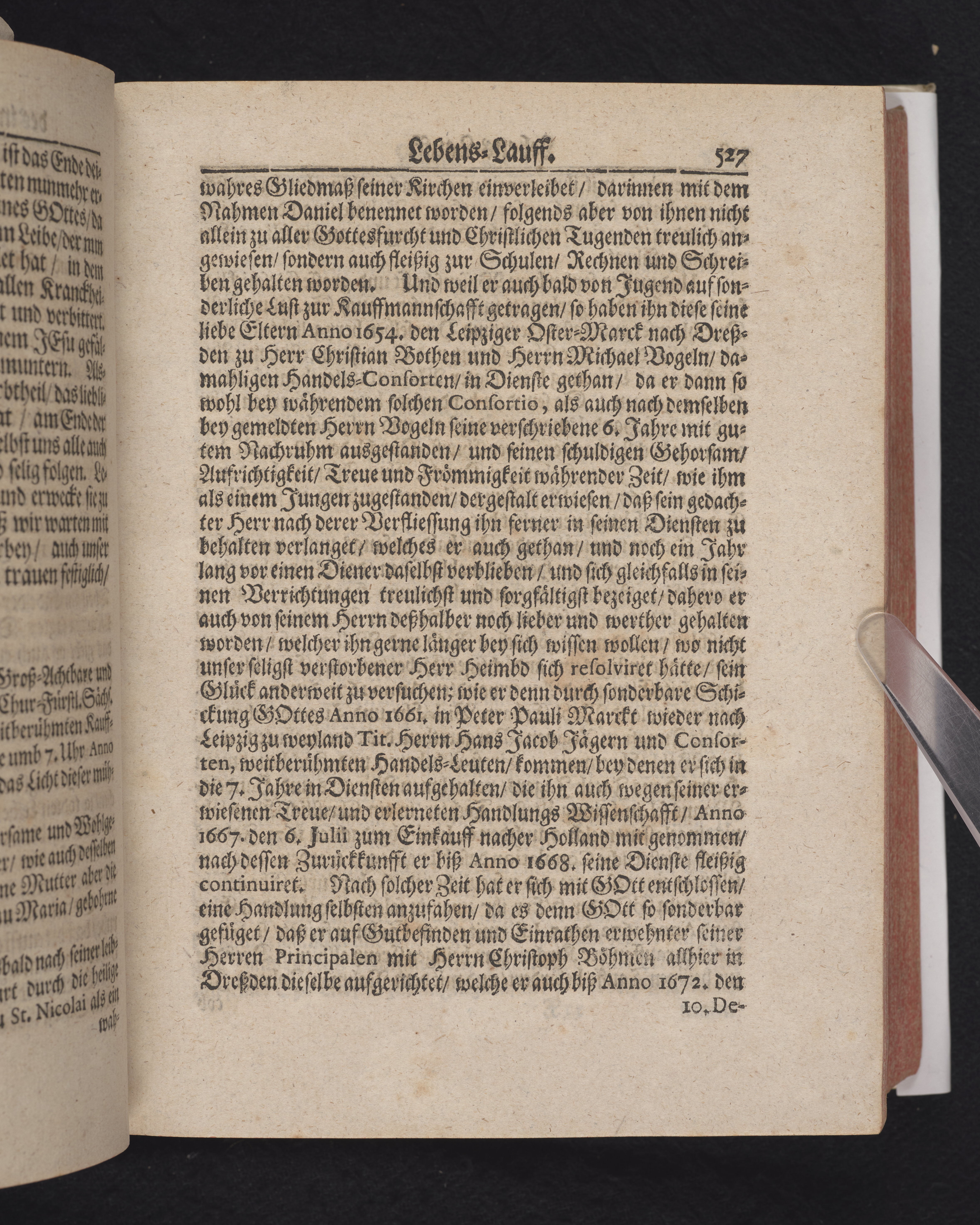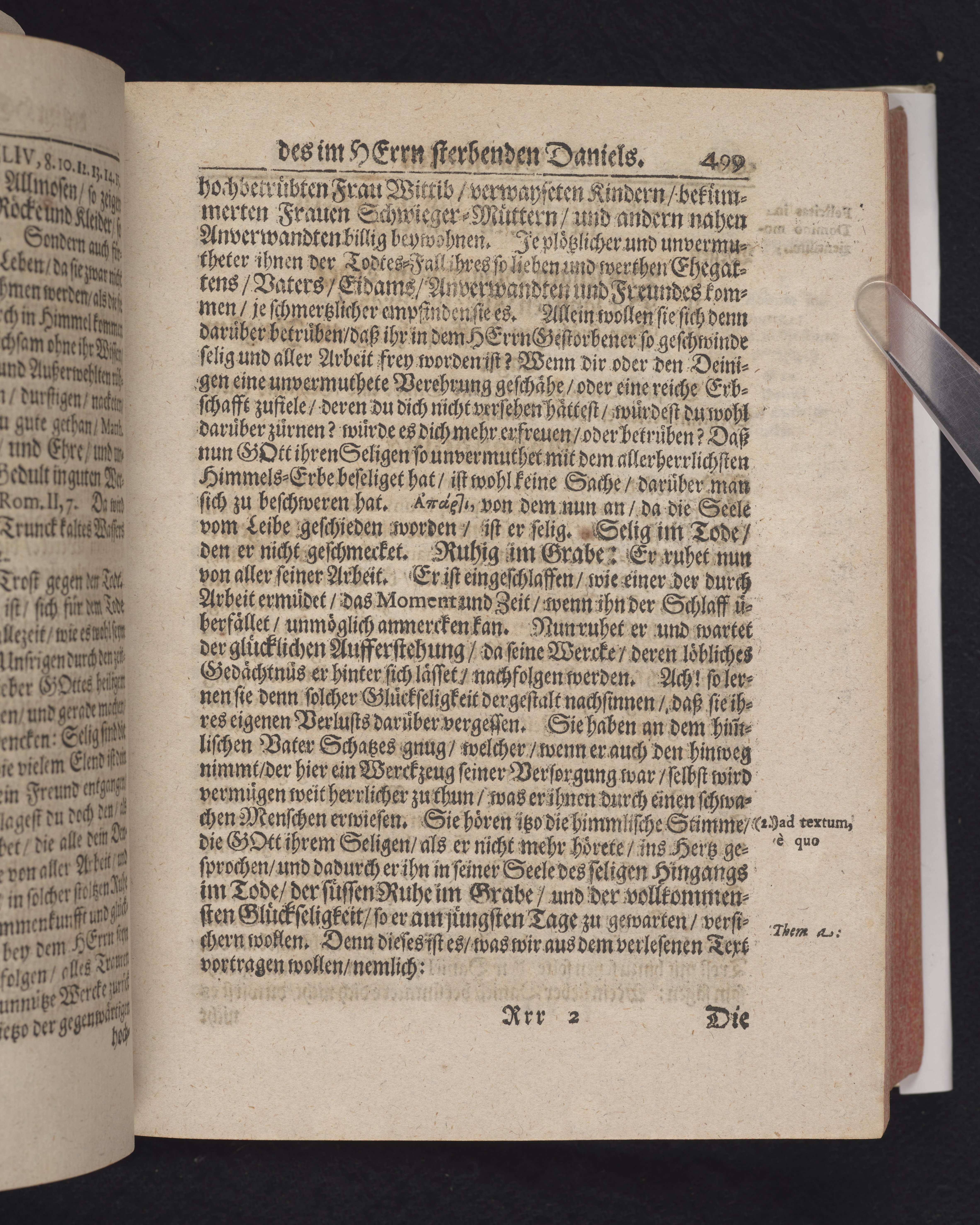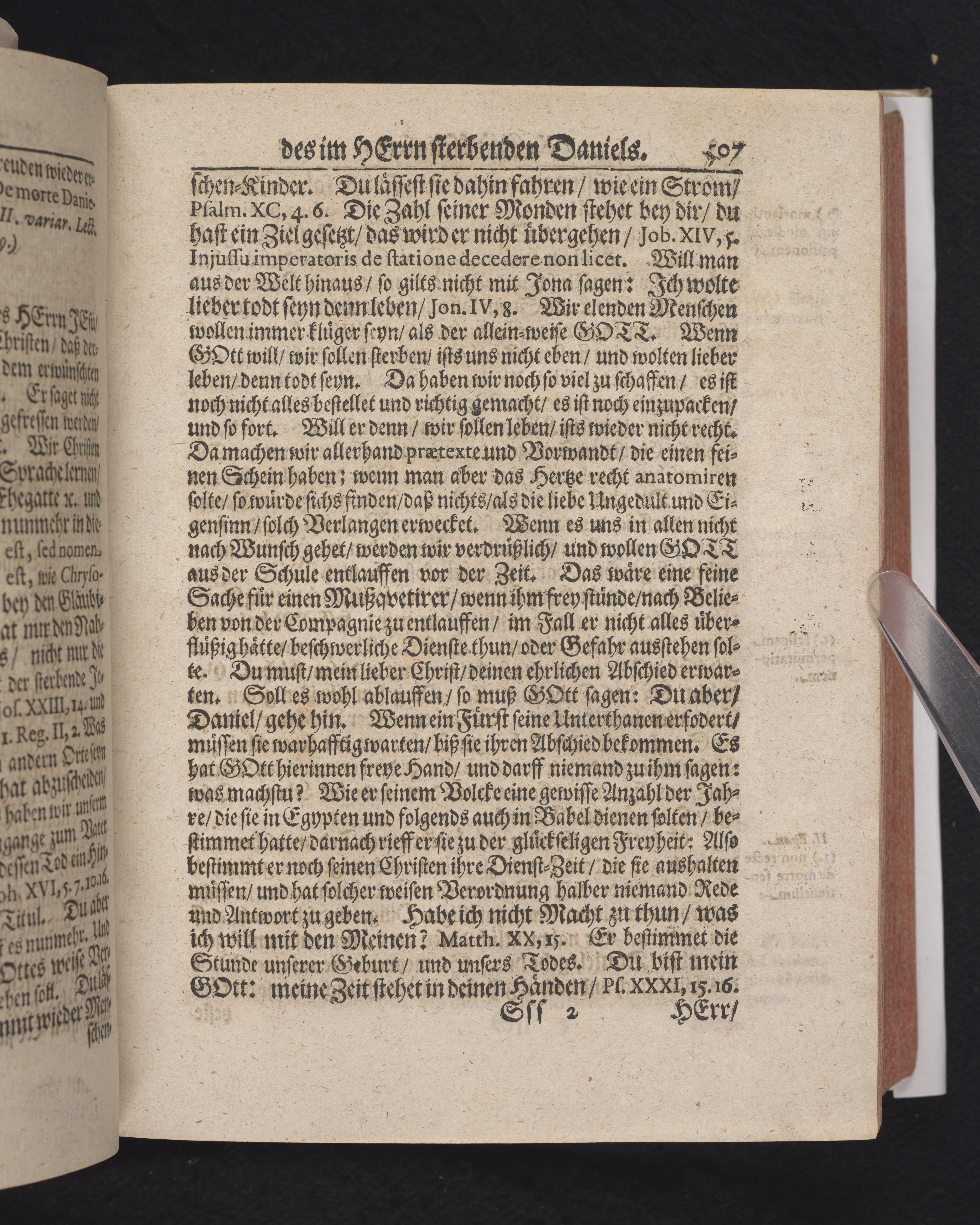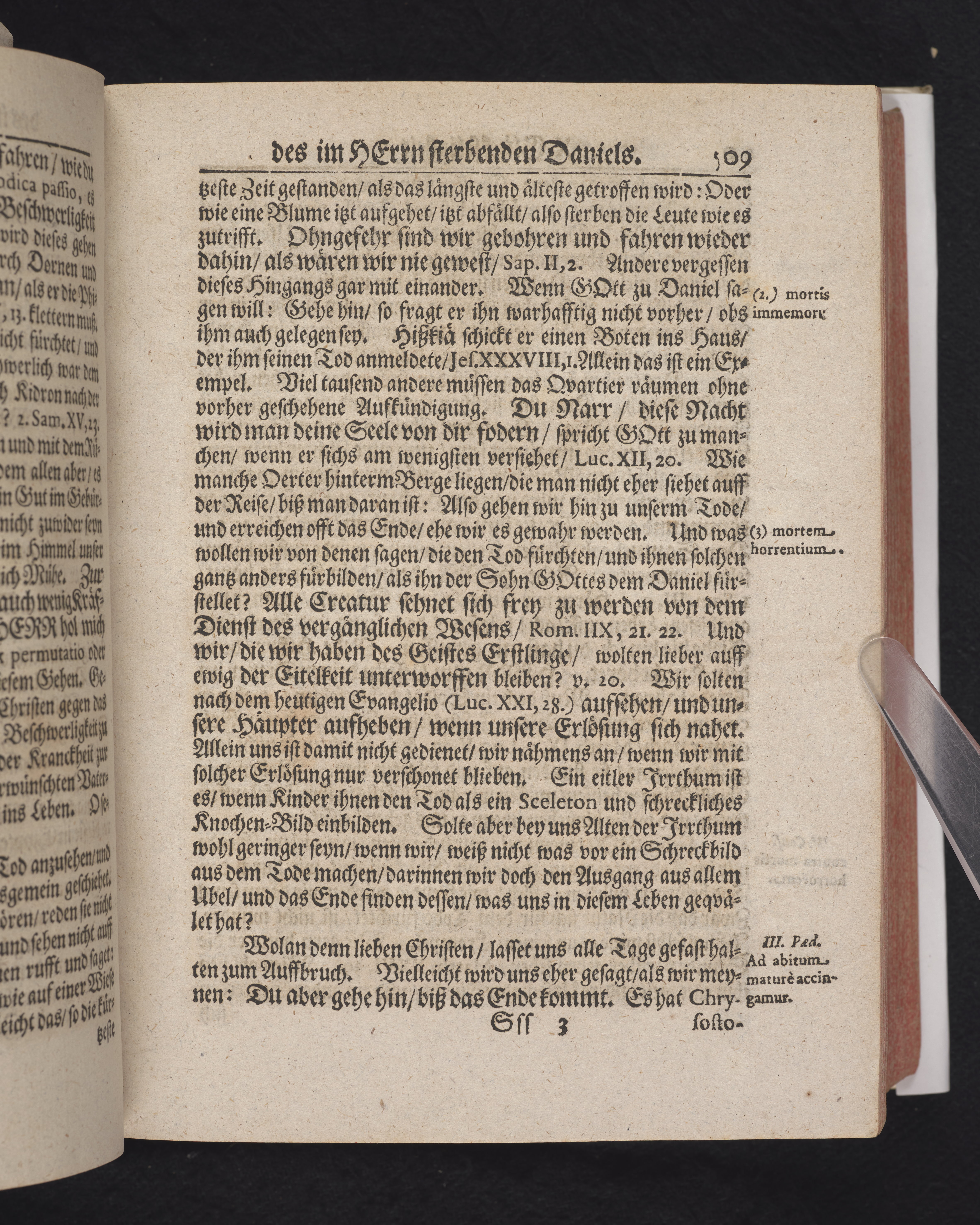 Ingår i en utgiven samling med 28 likpredikningar av Samuel Benedikt Carpzov: Grünende Gebeine, oder Leich-Predigten... Tryckt innehållsförteckning och register. Handskriven innehållsförteckning över de 28 likpredikningarna med bläck på främre försättsbladet (recto och verso).
