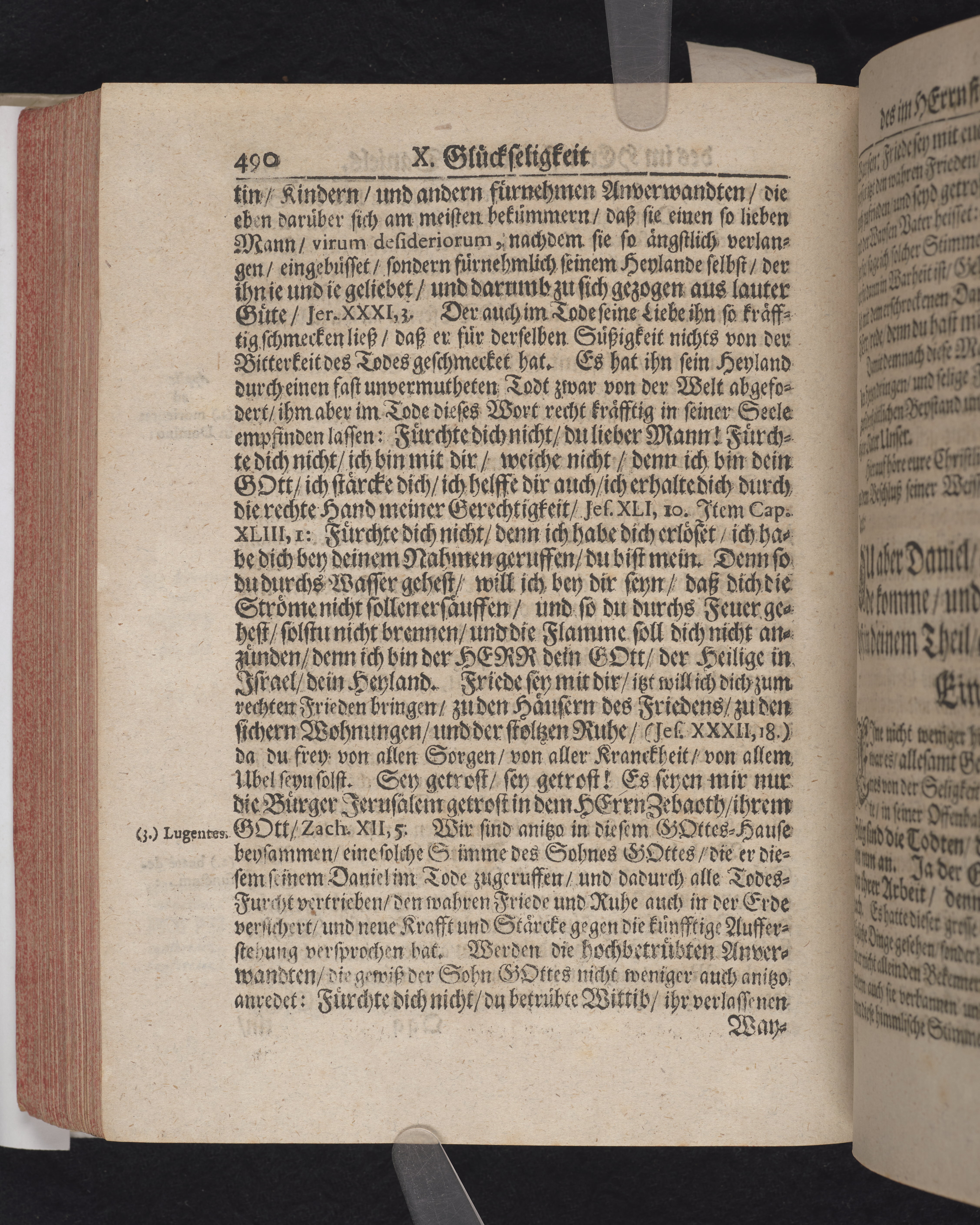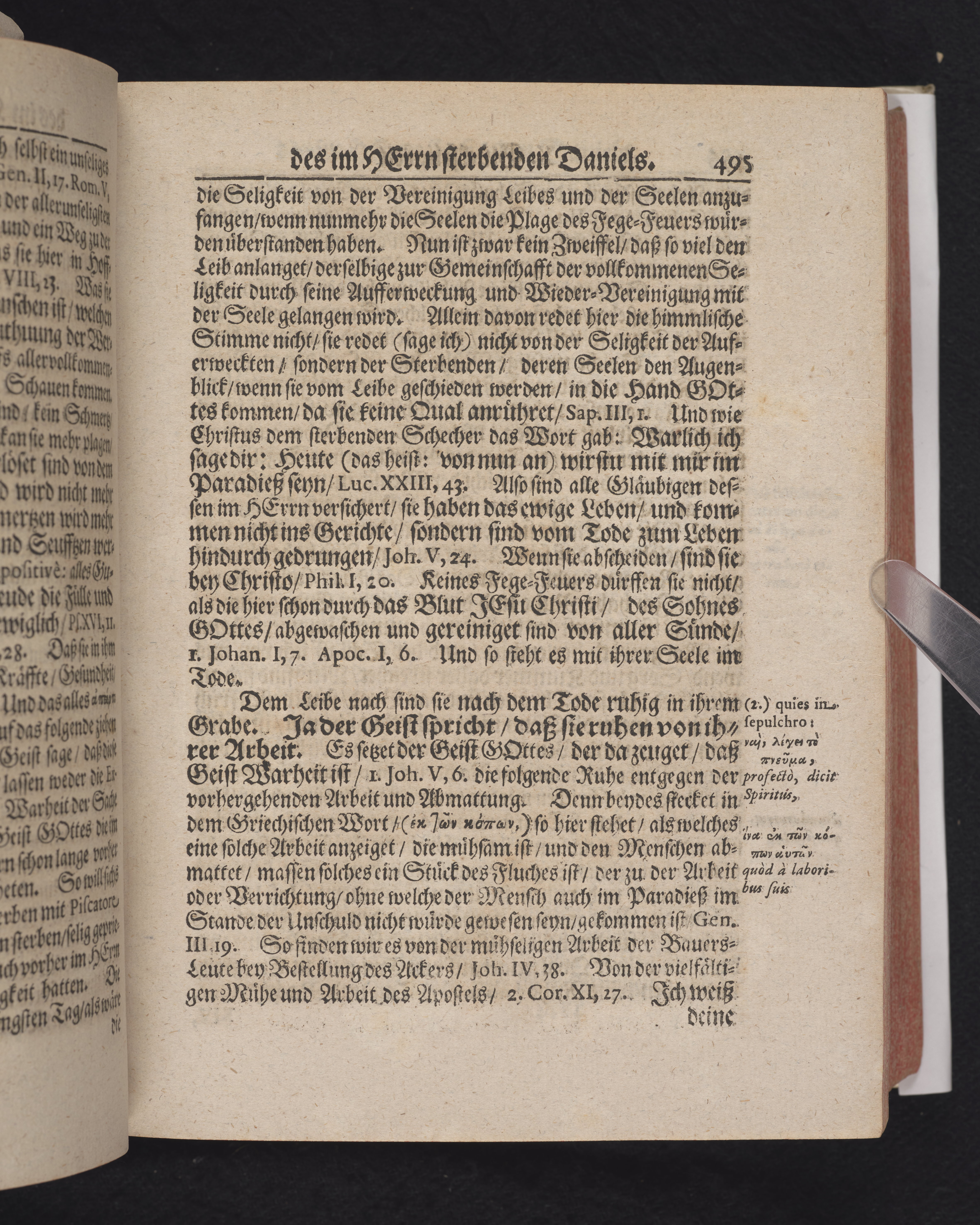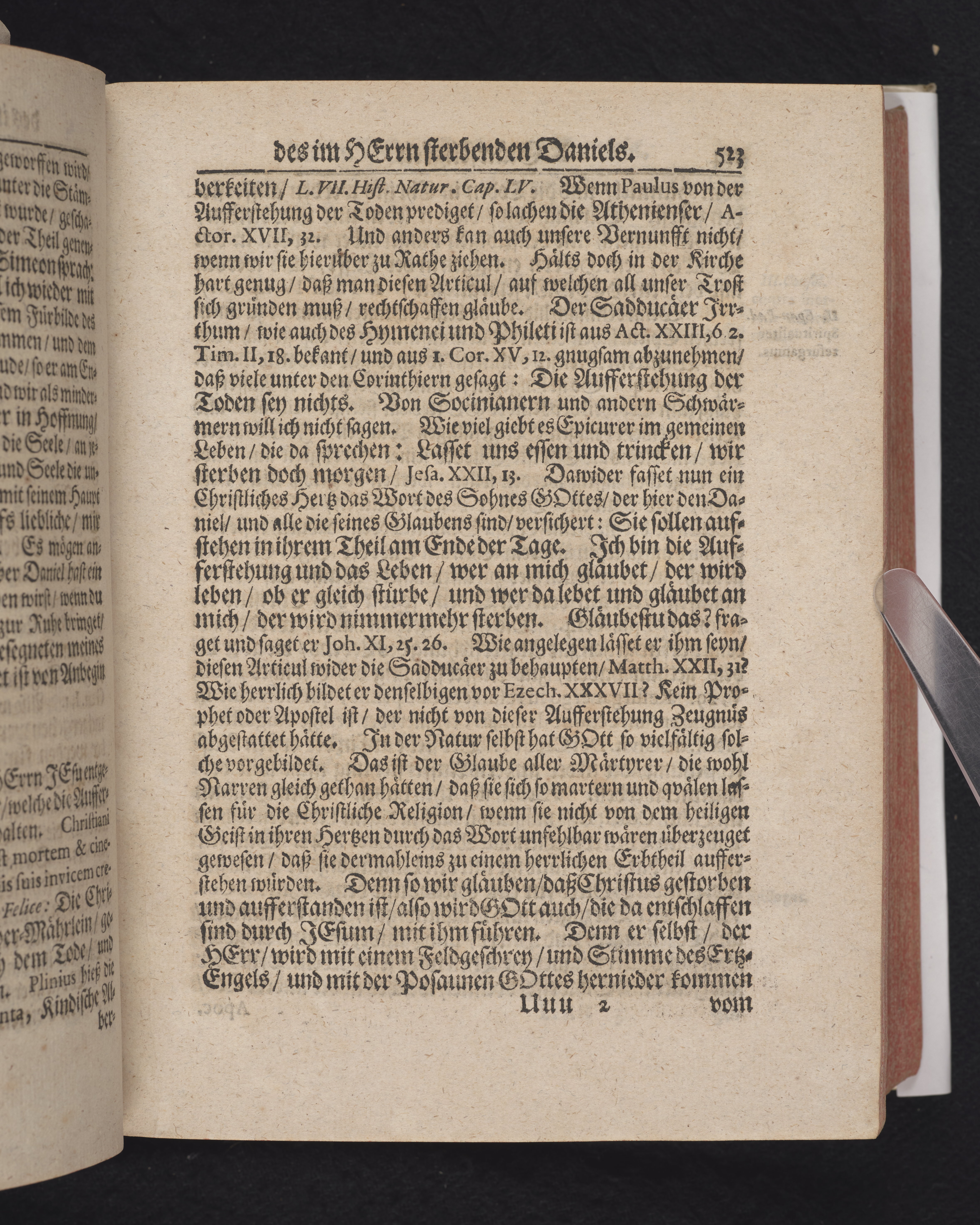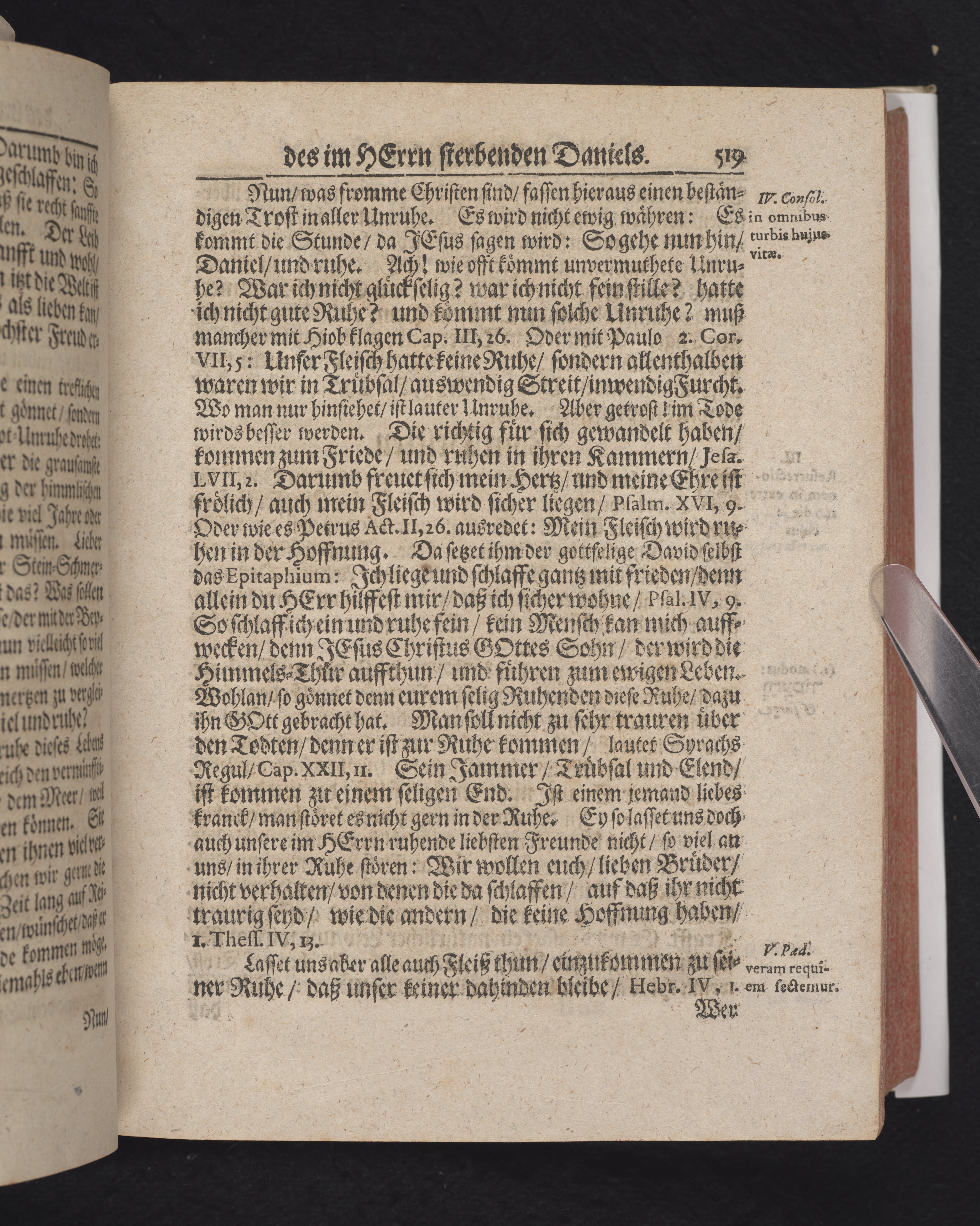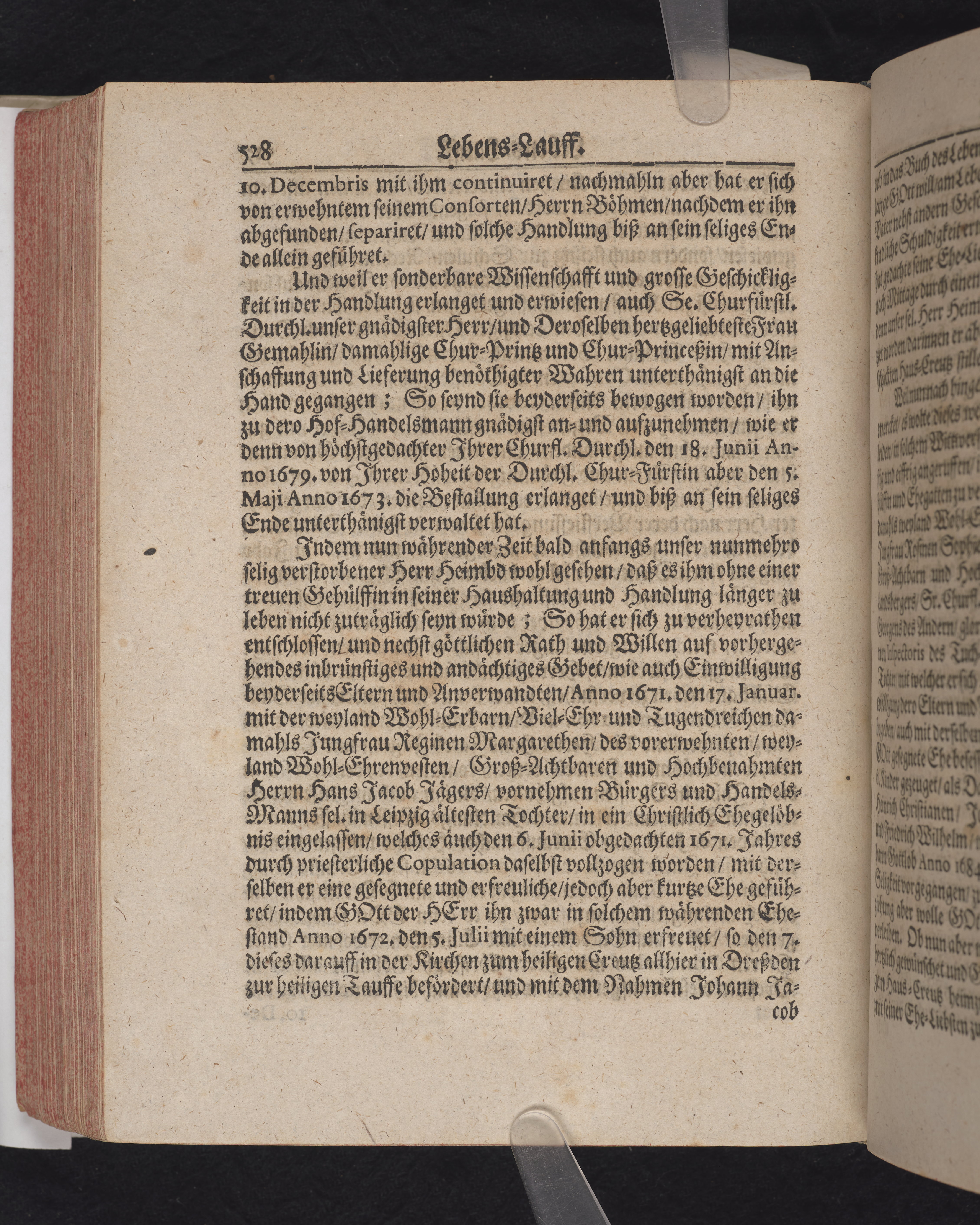 Ingår i en utgiven samling med 28 likpredikningar av Samuel Benedikt Carpzov: Grünende Gebeine, oder Leich-Predigten... Tryckt innehållsförteckning och register. Handskriven innehållsförteckning över de 28 likpredikningarna med bläck på främre försättsbladet (recto och verso).