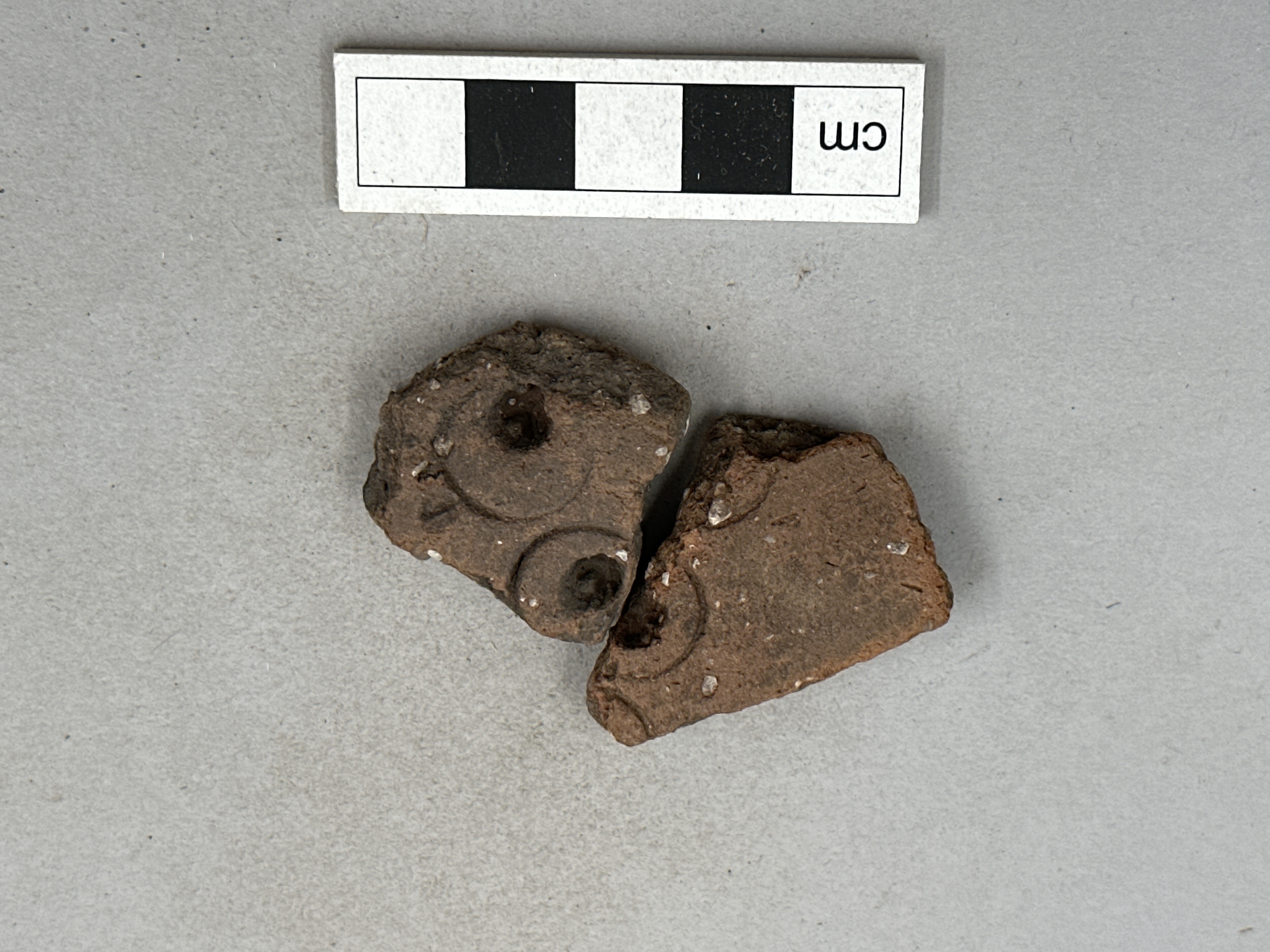 Glättad fastgods fragment med gropdekor med en cirkulär linjedekor runt gropdarna.
