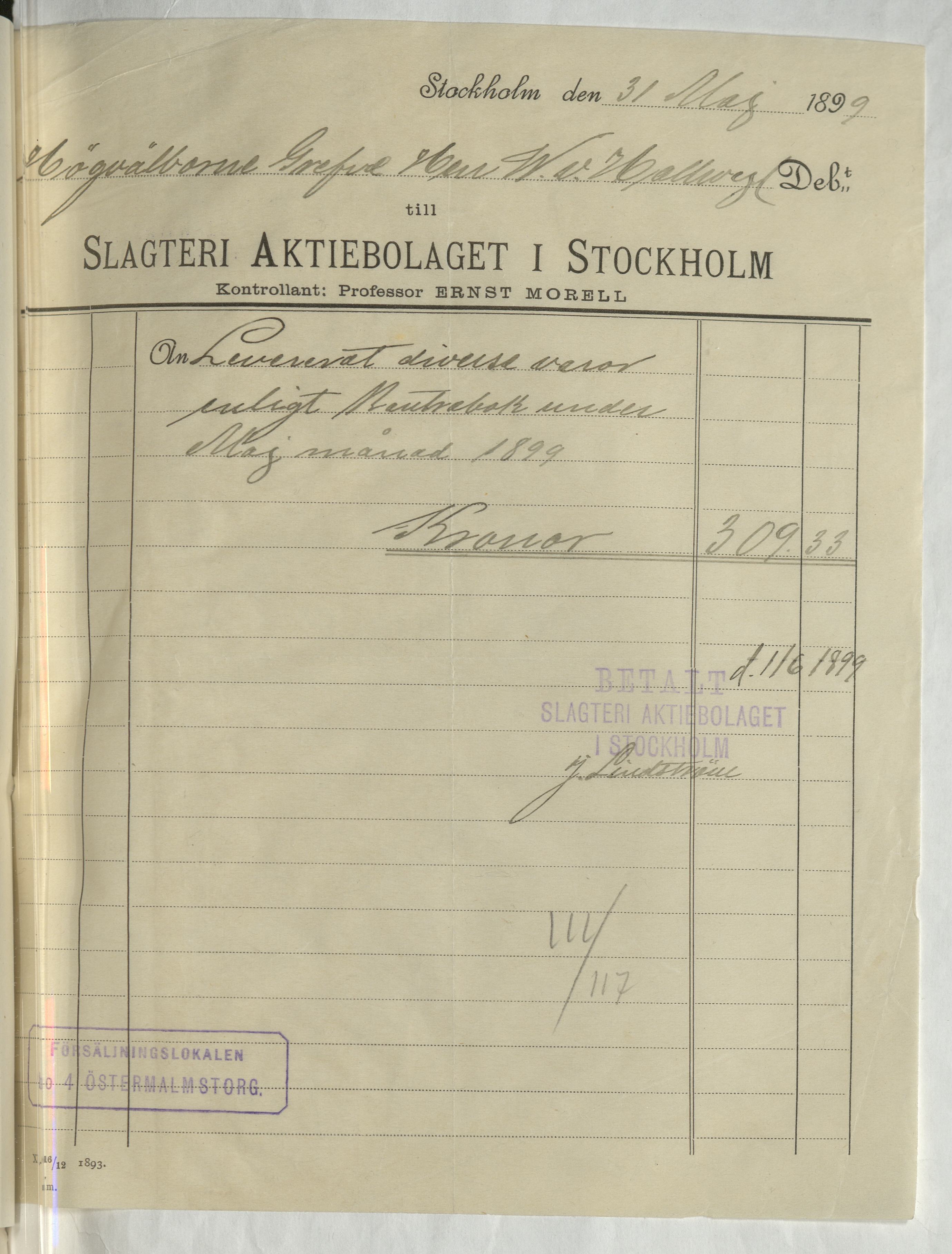 Kvitto från Slagteri Aktiebolaget i Stockholm