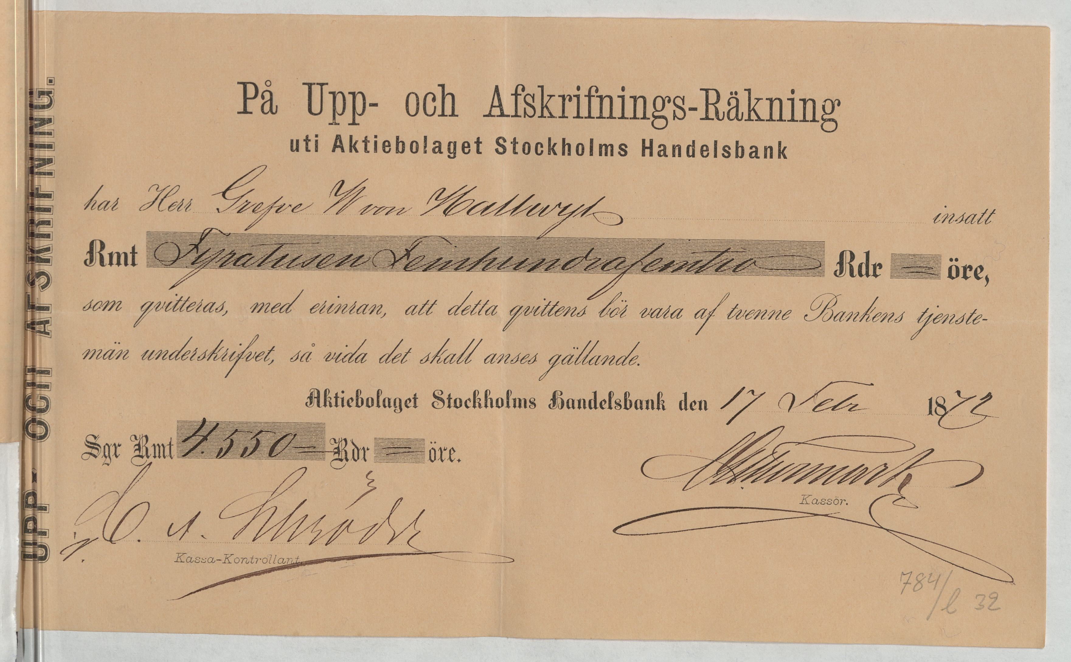 Kvitto från Aktiebolaget Stockholms Handelsbank rörande Upp- och Afskrifnings-Räkning