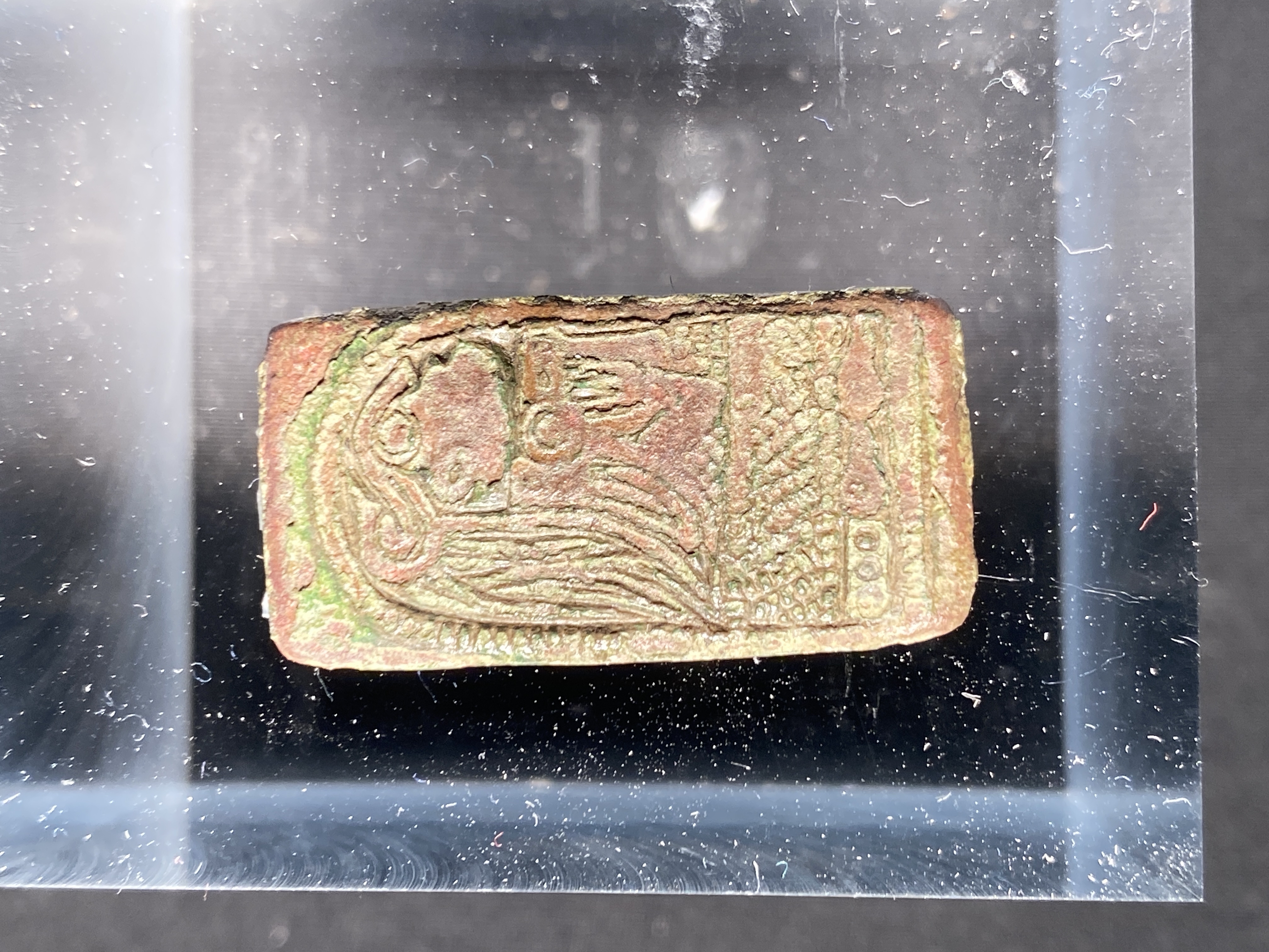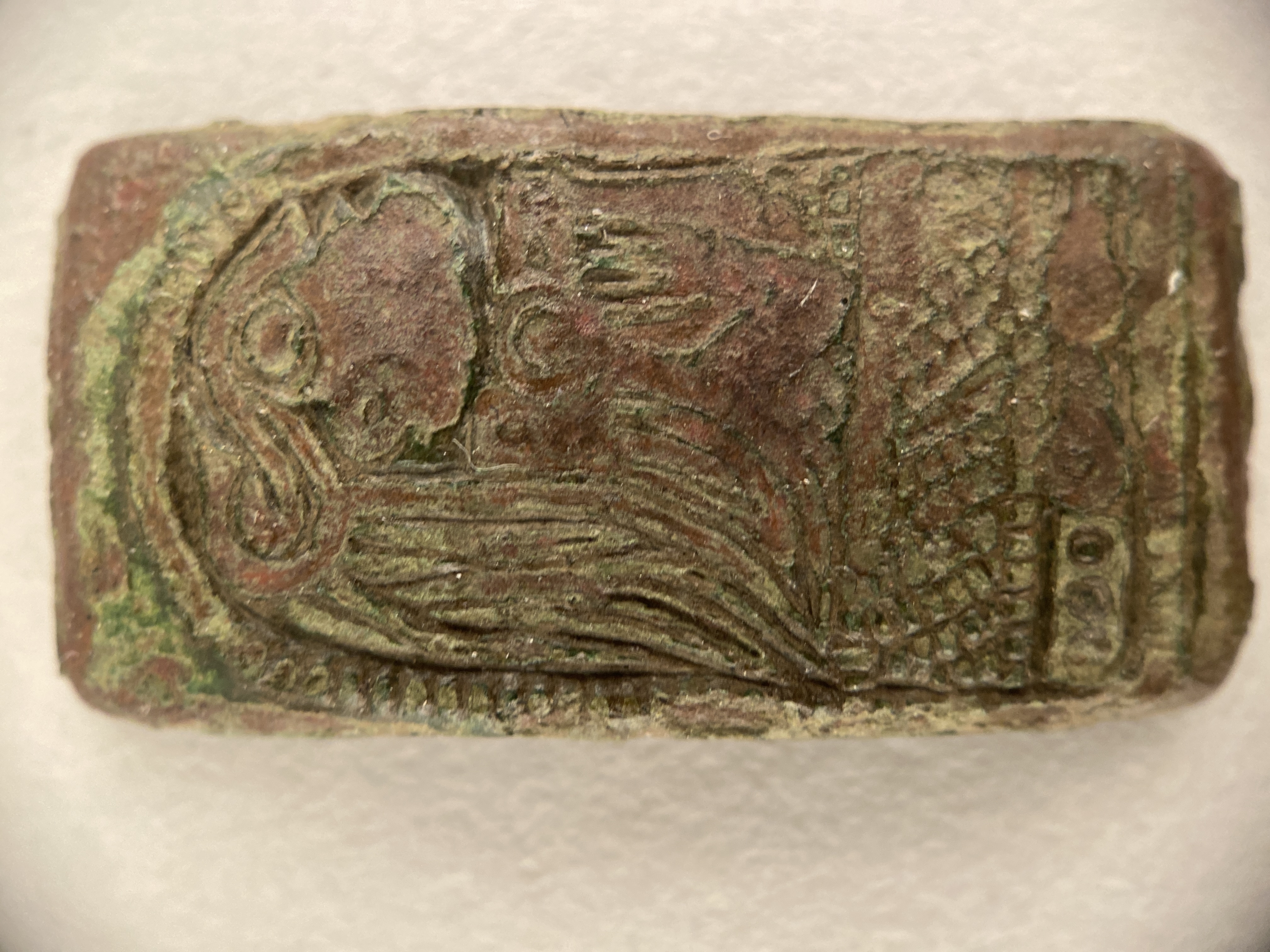 Liten rektangulär patris för guldgubbe av koppar-legering. Motivet finns på den ena sidan och är utfört i karvsnittsteknik. Motivet består av en kvinnofigur i profil under en rund båge. Kvinnan har hästsvans, ett ryggknappsspänne och förefaller att ha en särk med två synliga fötter. Hennes ena hand är placerad under spännet. Figuren omges av en pärlstavsfris. Baksidan på patrisen är grov.