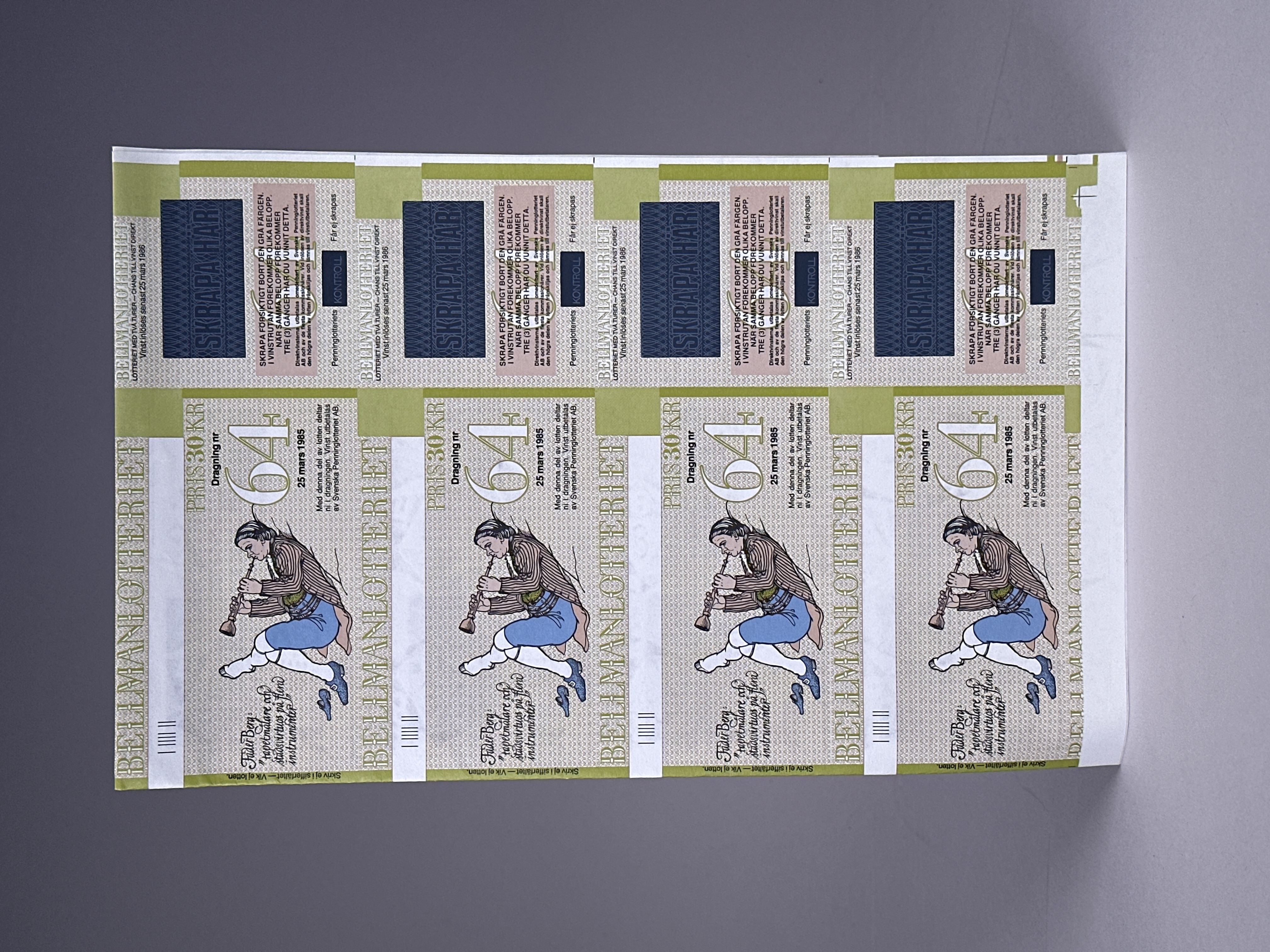 Detta pappersark tillhör en grupp prov- och arkivark som vid deposition från Riksbanken fanns i en stor trälåda innehållande Bellmanlotter med dragningsdatum 1984-1989 (alla år ej representerade, 41 st.). Inskription på lådan: "Riksbankens (från Tumba Bruks sedeltryckeri) deposition i KMK / 2002-12-12". |