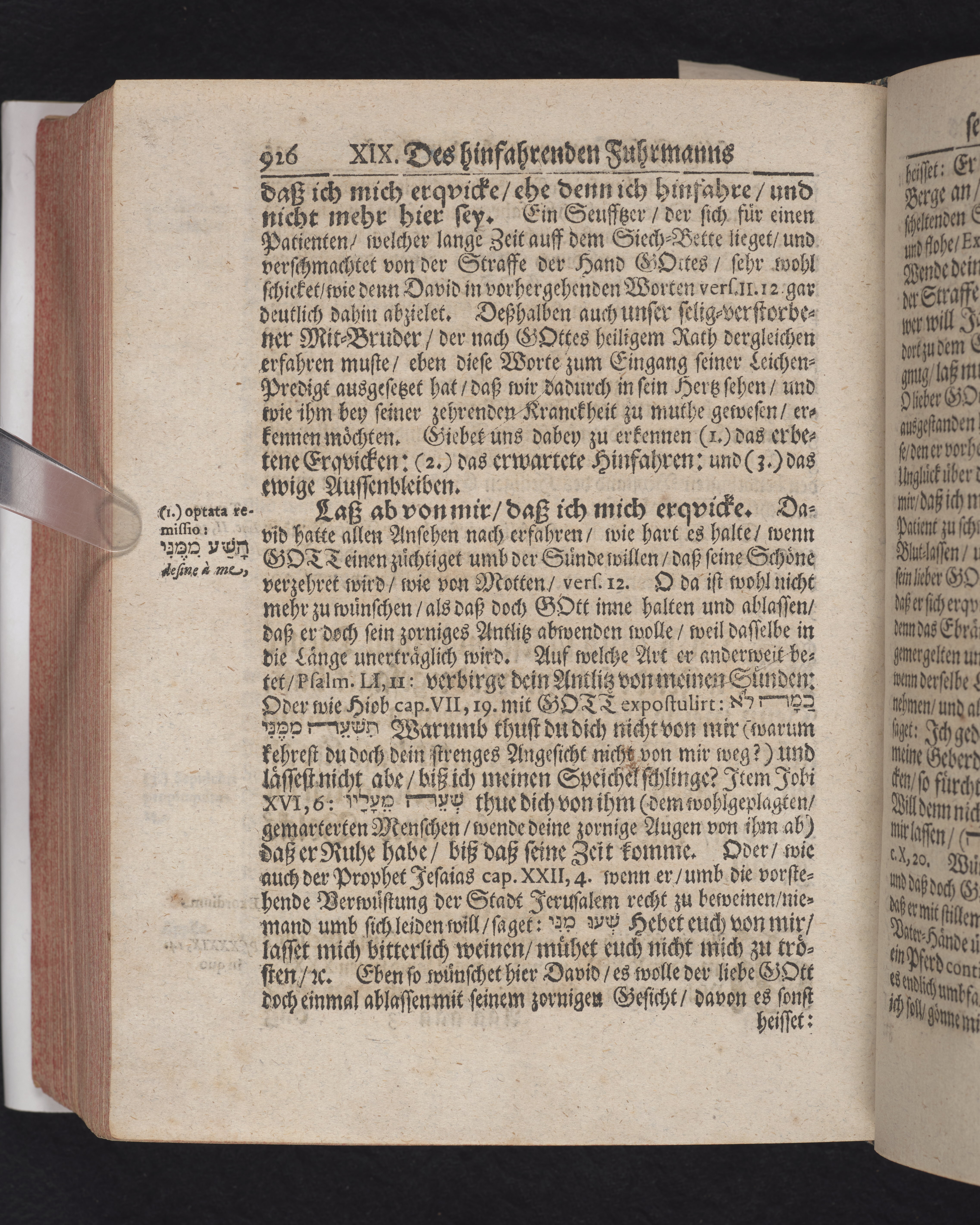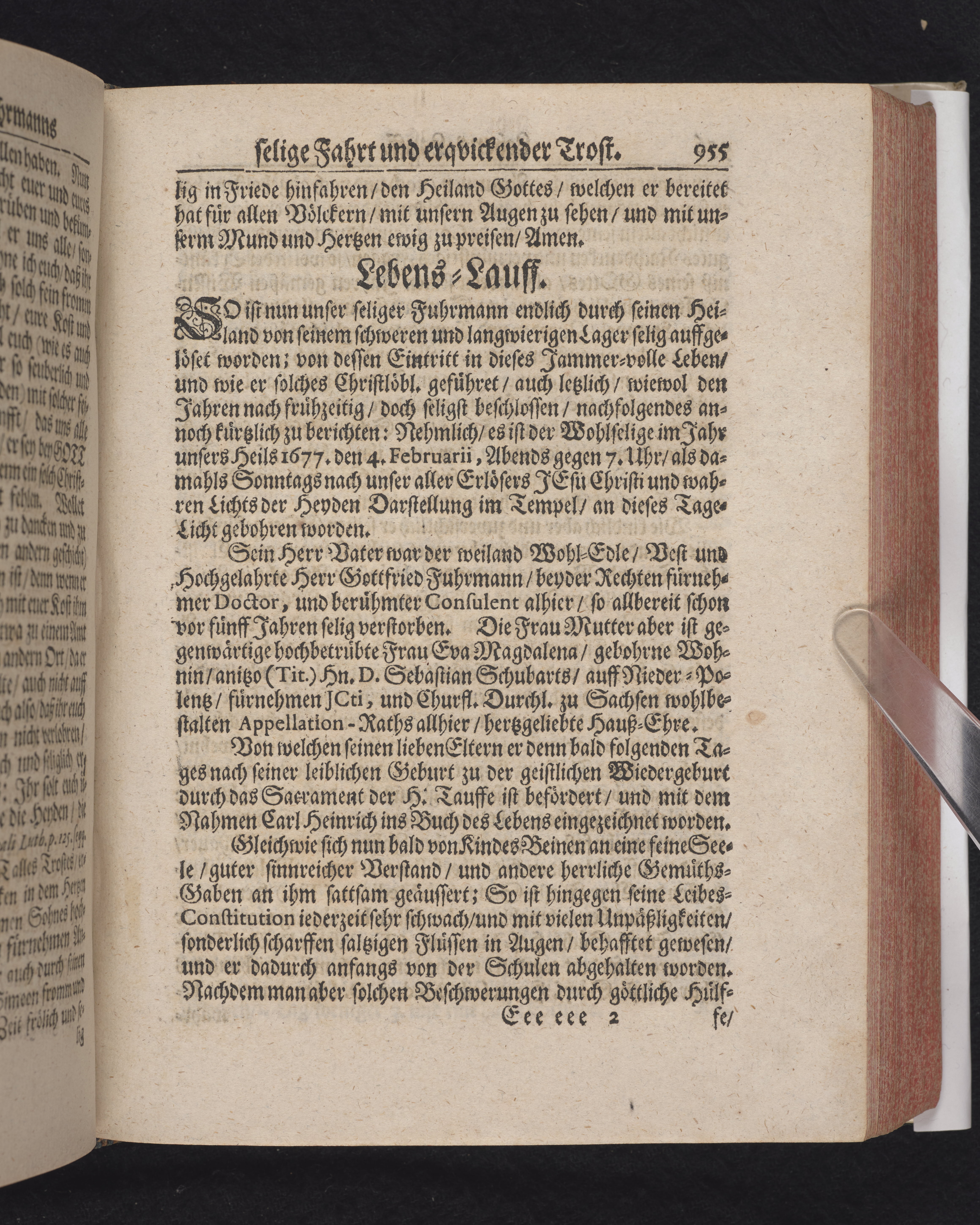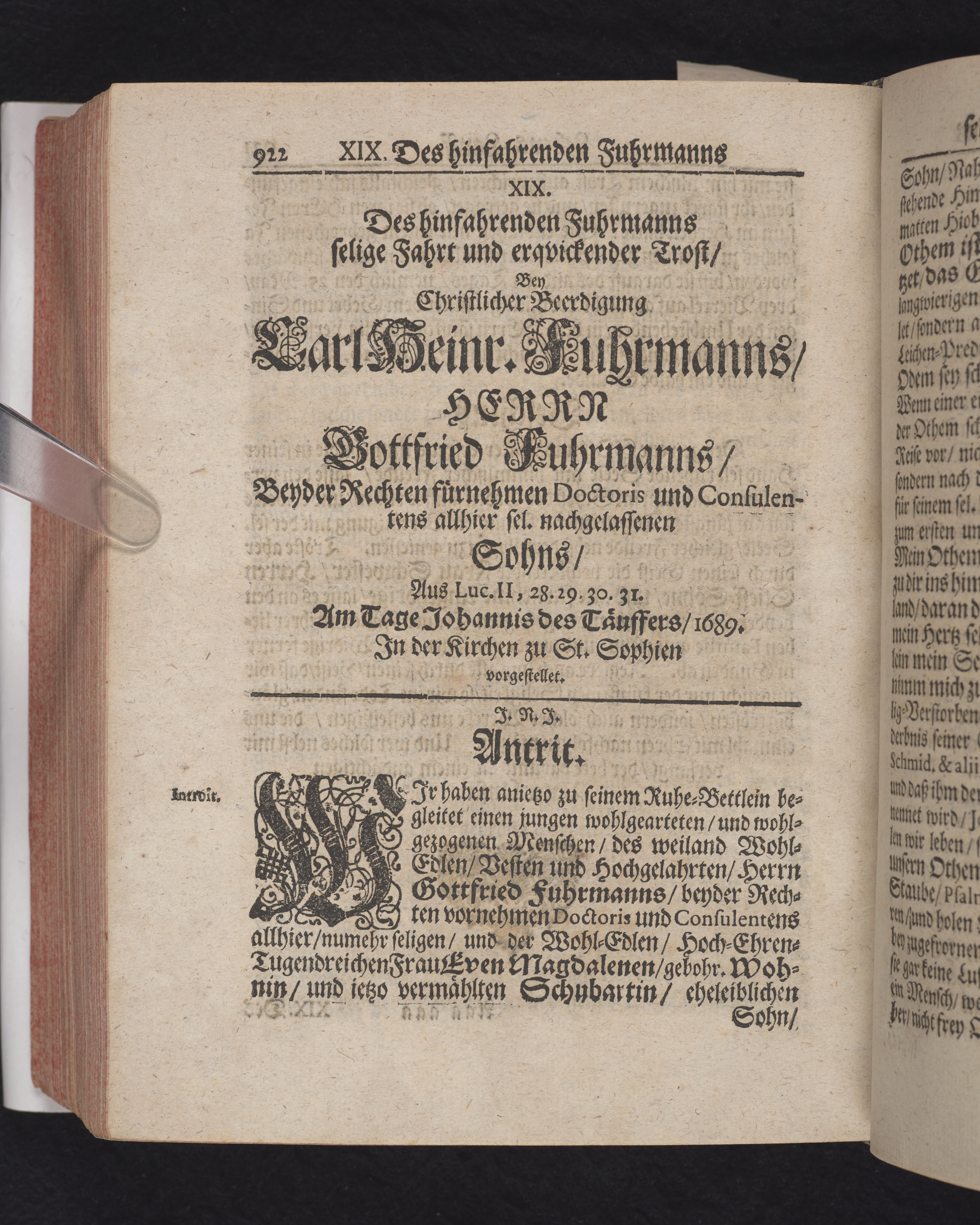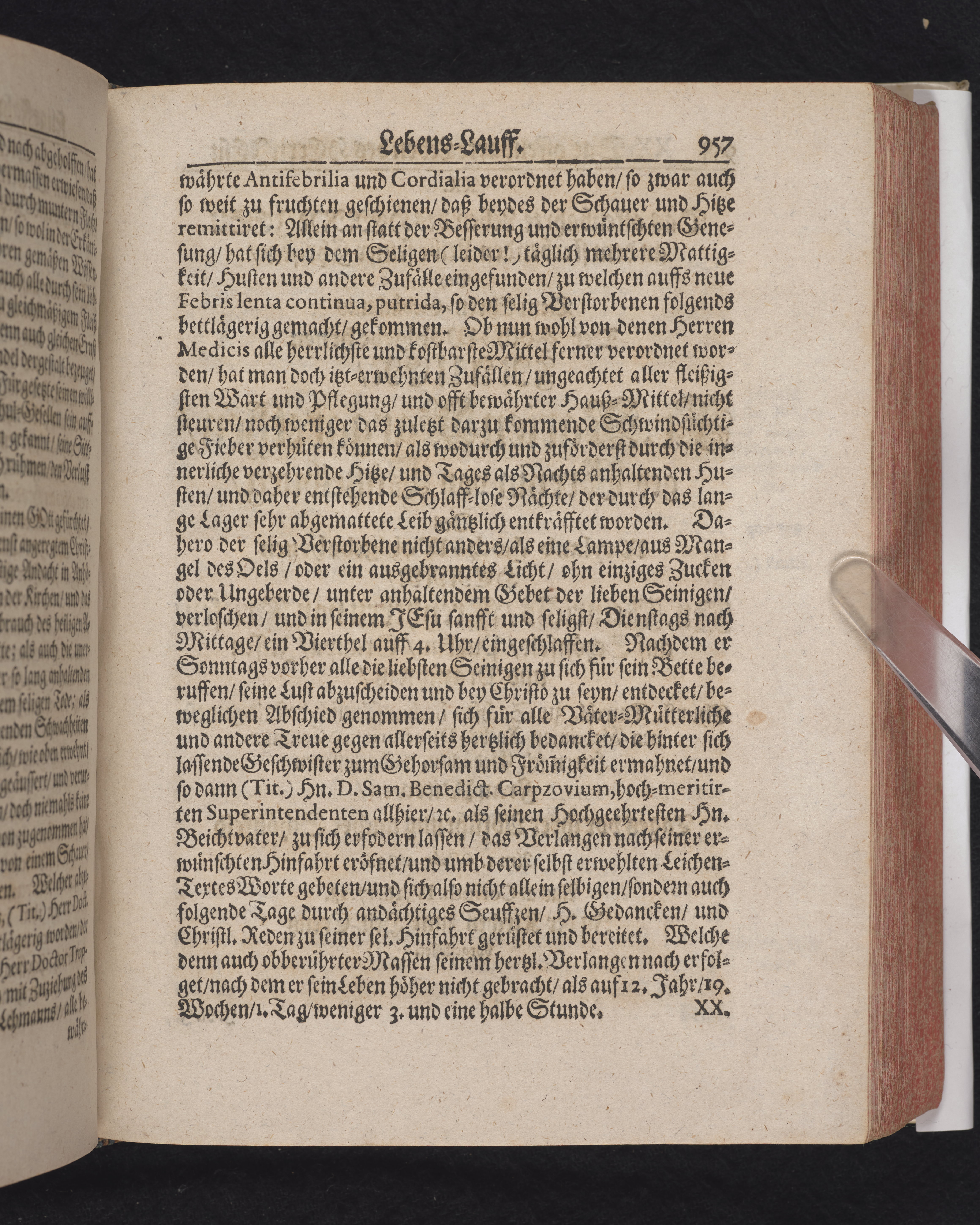 Ingår i en utgiven samling med 28 likpredikningar av Samuel Benedikt Carpzov: Grünende Gebeine, oder Leich-Predigten... Tryckt innehållsförteckning och register. Handskriven innehållsförteckning över de 28 likpredikningarna med bläck på främre försättsbladet (recto och verso).