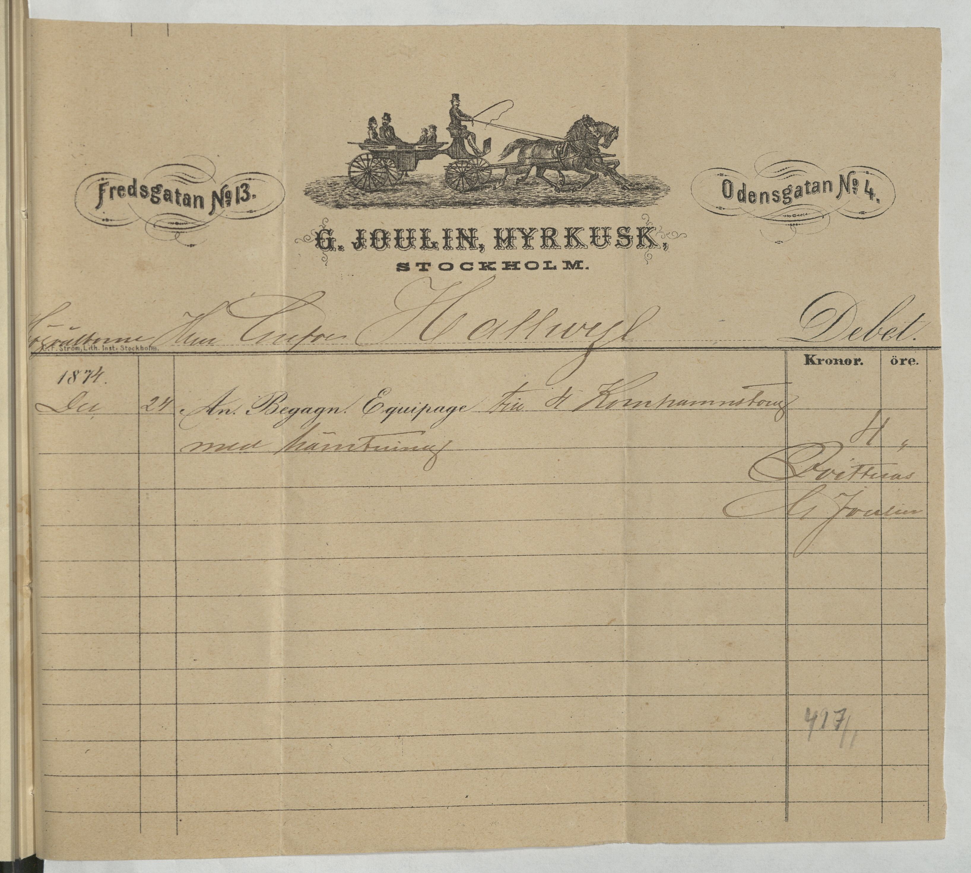 Kvitto från G. Joulin, Hyrkusk. Gällande resa till och från Kornhamnstorg 4. Stockholm, 1874.