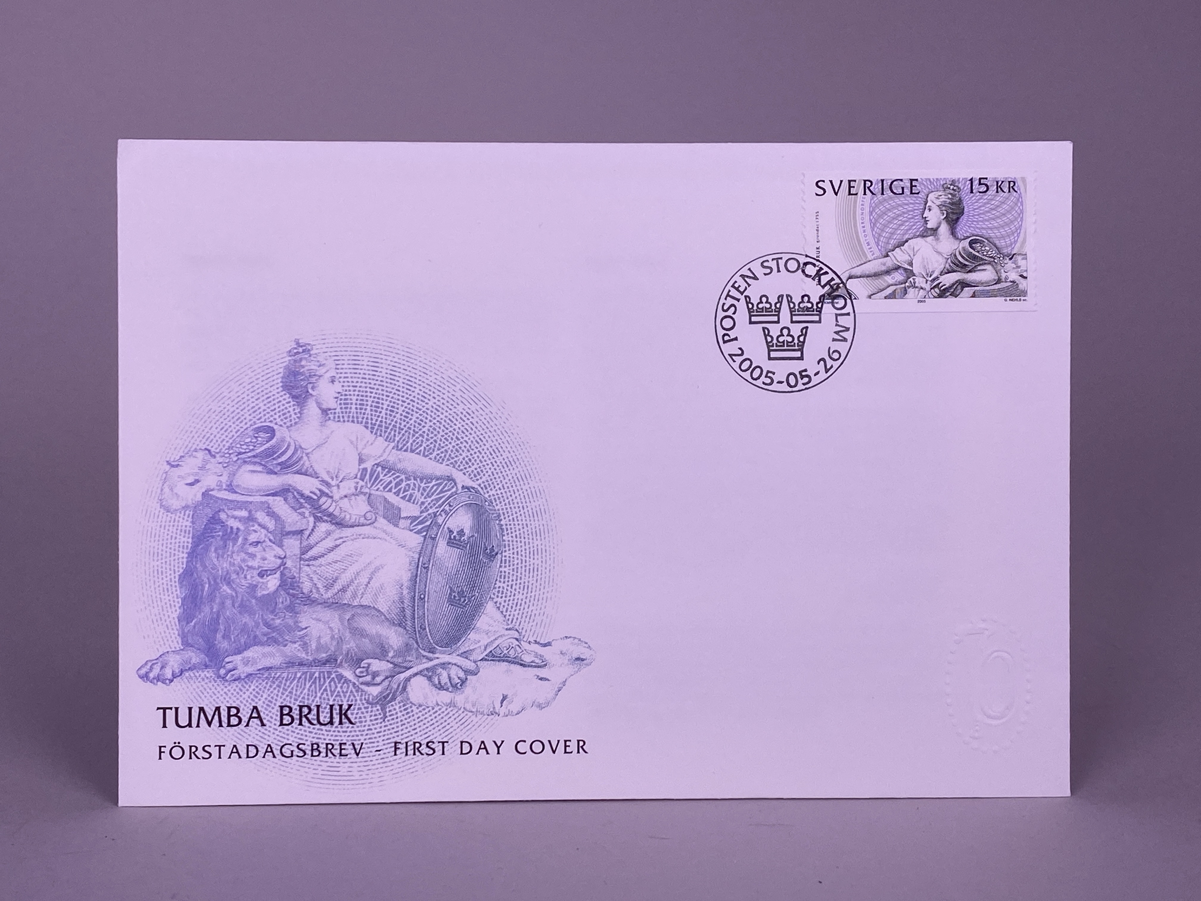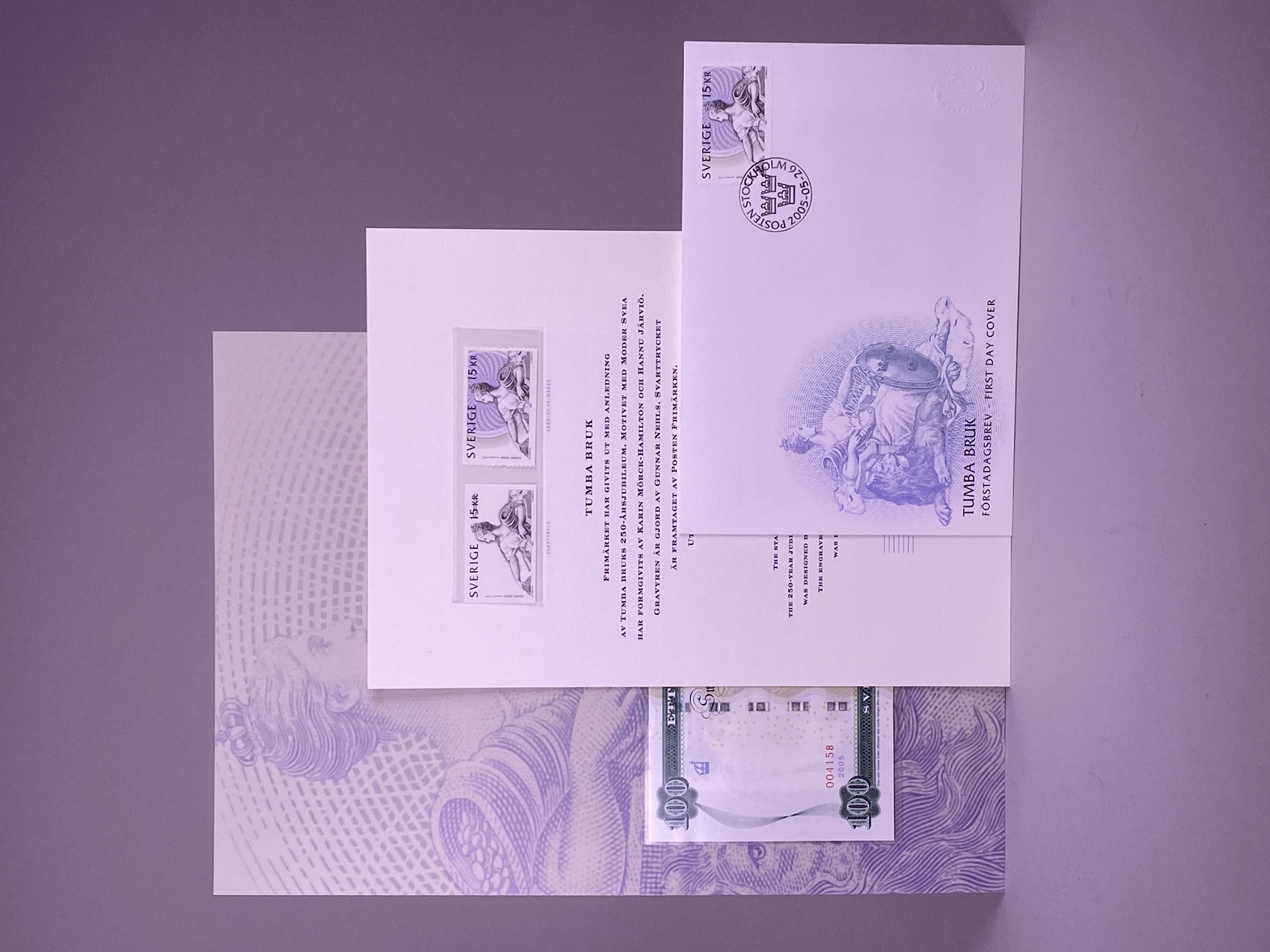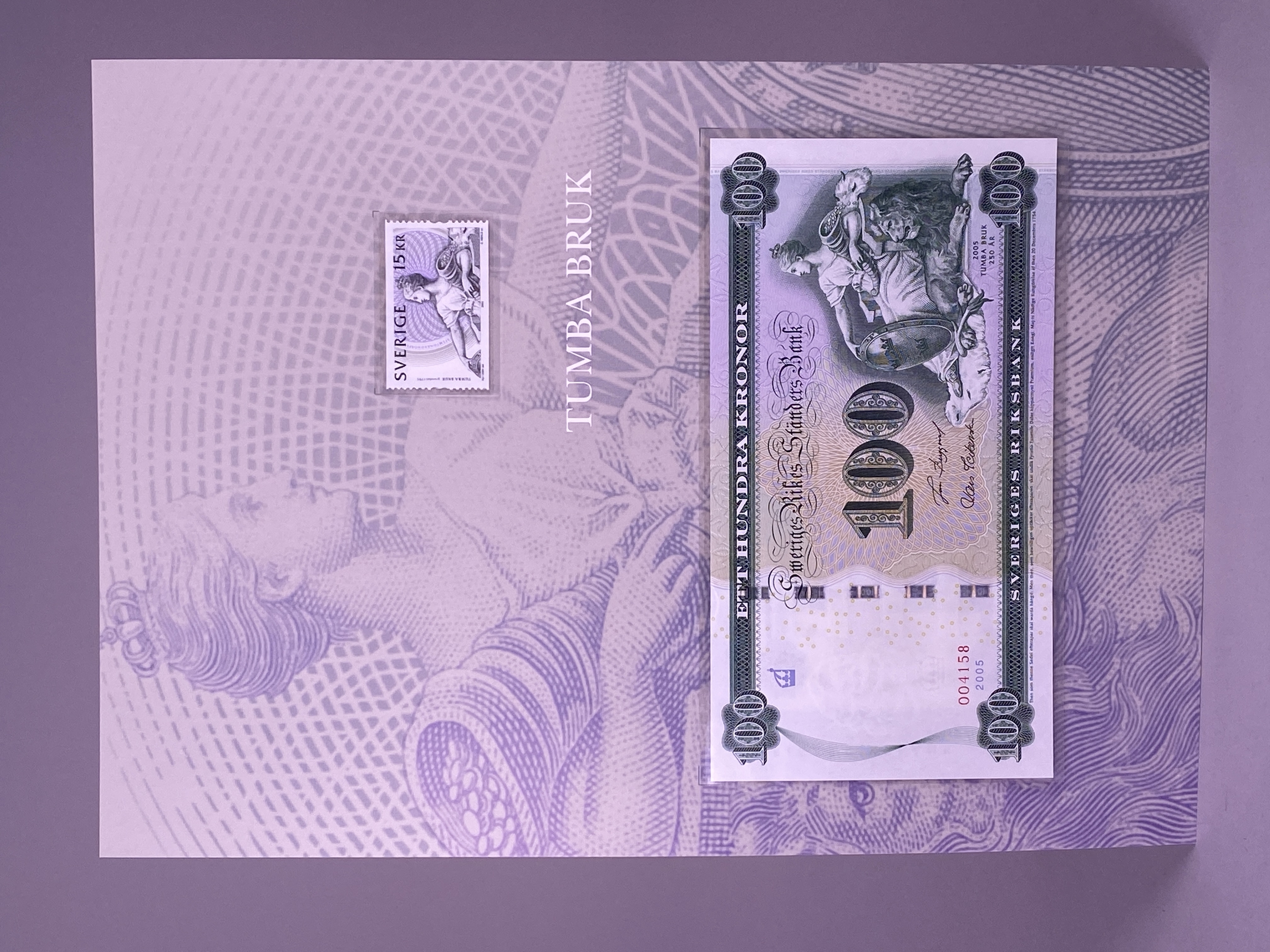 Mapp innehållandes en minnessedel med valören 100 kronor, tre frimärken samt ett förstadagsbrev. Minnessedel, frimärke samt brev utgavs år 2005 med anledning av Tumba bruks 250 års jubileum. Sedelns huvudmotiv är Moder Svea i den utformning som utfördes av konstnären Julius Kronberg till 1890 års sedelserie. Framsidan med bankens namn utskrivet två gånger, dels i dess gamla form från tiden före ståndsriksdagens upphörande 1866 - Sweriges Rikes Ständers Bank, dels med det idag gällande namnet - Sveriges riksbank. Vinjett, valörer och valörtext tryckt med mörk grönsvart koppartrycksfärg. Bakgrund i huvudsak tryckt i beige och grågröna offsetfärger. Bakgrundsmönstret uppbyggt i guilloche- och reliefmönster. Sedelns baksida med huvudmotiv föreställande planritning över Tumba bruk från 1804 samt med illustration av papperstillverkning ur Denis Diederots stora franska encyklopedi från åren 1751-1780. Sedeln med vattenmärke föreställande rikslejonet som ursprungligen förekom på bancosedlarna tryckta 1835- 1858. Sedeln även med säkerhetstråd, s.k. bred demetalliserad optiskt variabel fönstertråd, i reflektivt ljus ser man "Tre Kronor" som när man vinklar sedeln förändrar sig och blir "100". Frimärket förkommer i två varianter, som färdigt frimärke och som svarttryck. Huvudmotivet utgörs även i detta fall av Julius Kronbergs målning av Moder Svea. Frimärket är även utformat som en sedel med säkerhetsdetaljer såsom mikrotext. Motivet har formgivits av Karin Mörck-Hamilton och Hannu Järviö. Gravyr av Gunnar Nehls. Svartryck framtaget av Postens Frimärken. Sedel, frimärken och brev placerade i mapp tillverkad i papp. Mappens framsida med illustration föreställande Klockhuset vid Tumba bruk, samt texten "TUMBA BRUK 250 ÅR GRUNDAT 1755 RIKSBANKEN". Mappens insida med två pappersark, ett större och ett mindre. På det större arket sitter minnessedeln samt ett frimärke monterat innanför varsin plastficka. Arkets framsidan med tryckt motiv föreställande Moder Svea samt texten "TUMBA BRUK", baksidan av arket med text beskrivande Tumba bruks histora, minnessedelns utformning samt frimärkets utforming. Det mindre pappersarket med två frimärken placerade innanför plastficka, samt text beskrivande frimärkets utformning tryckt i svart mot vit bakgrund.