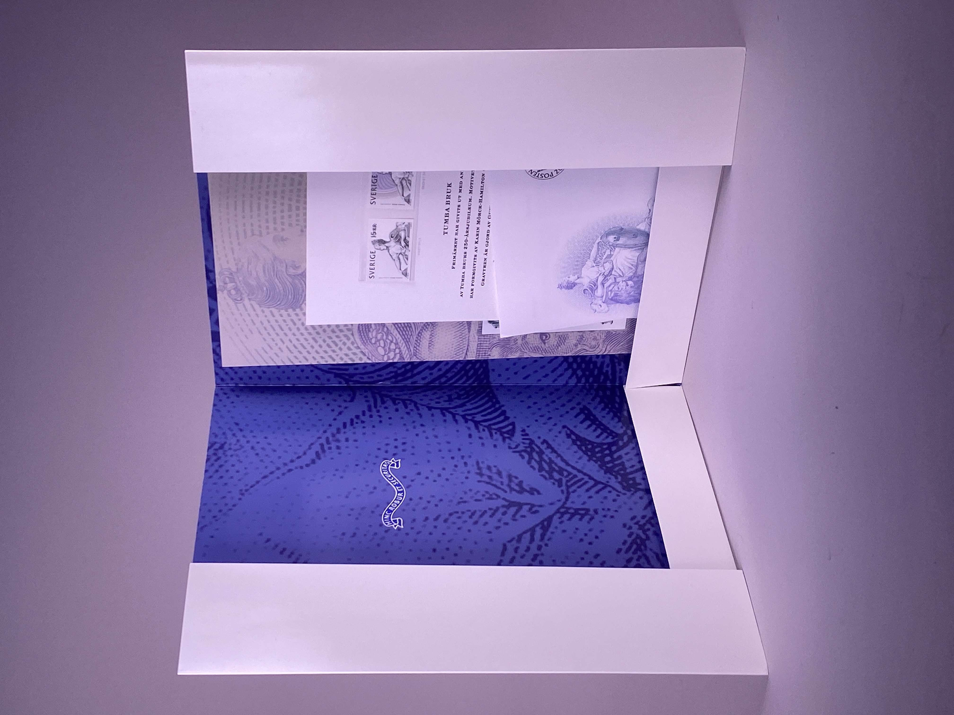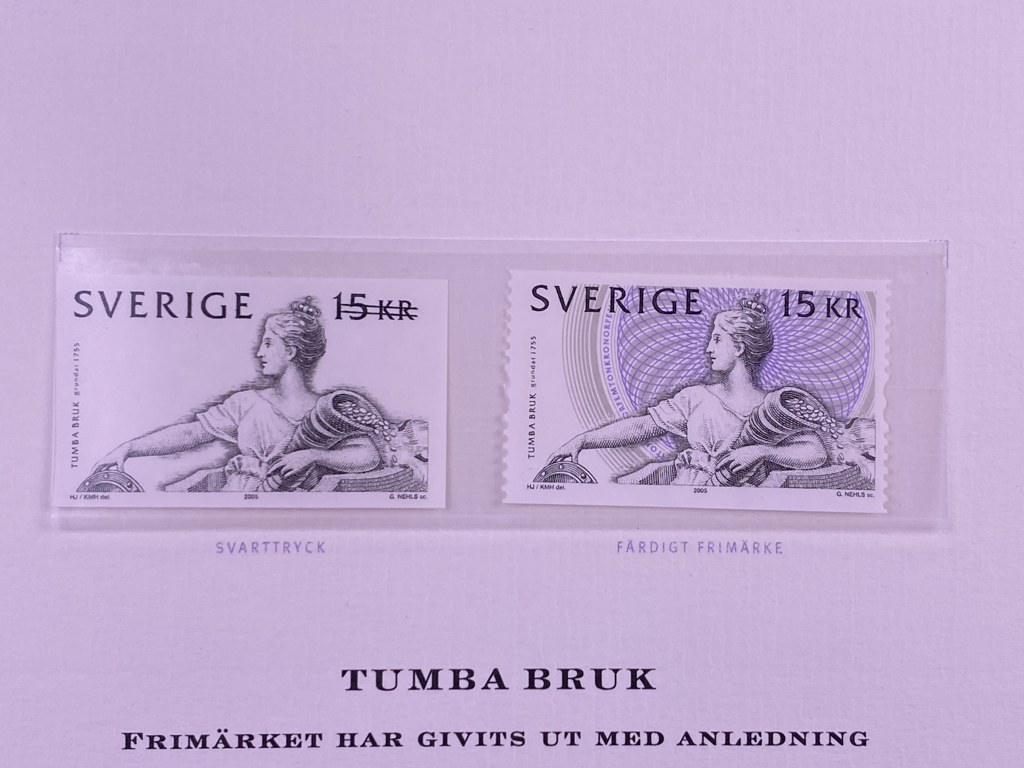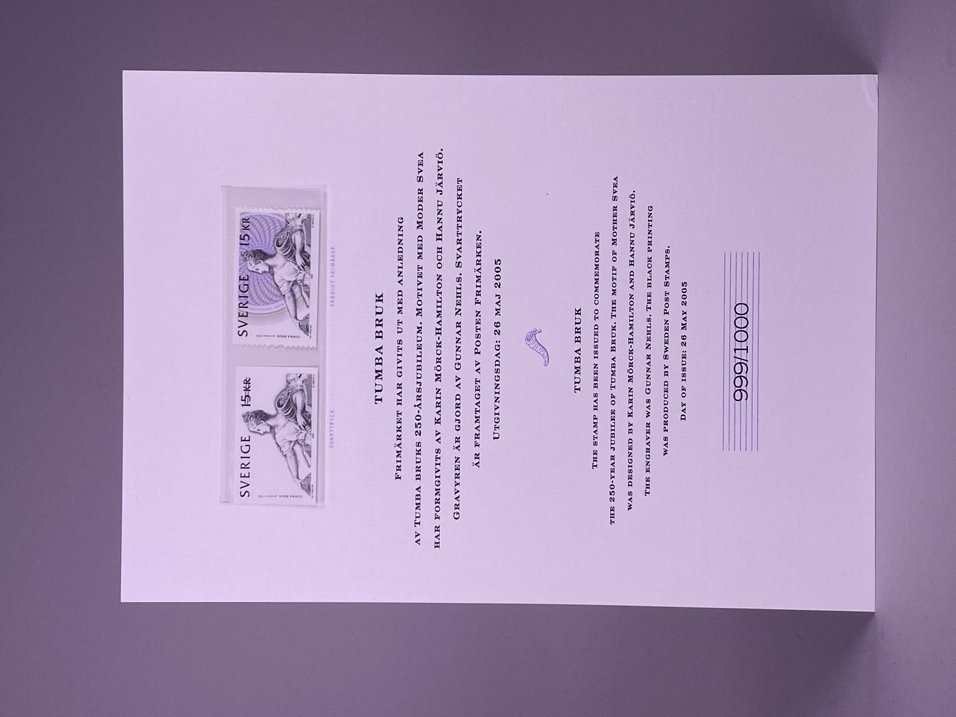 Mapp innehållandes en minnessedel med valören 100 kronor, tre frimärken samt ett förstadagsbrev. Minnessedel, frimärke samt brev utgavs år 2005 med anledning av Tumba bruks 250 års jubileum. Sedelns huvudmotiv är Moder Svea i den utformning som utfördes av konstnären Julius Kronberg till 1890 års sedelserie. Framsidan med bankens namn utskrivet två gånger, dels i dess gamla form från tiden före ståndsriksdagens upphörande 1866 - Sweriges Rikes Ständers Bank, dels med det idag gällande namnet - Sveriges riksbank. Vinjett, valörer och valörtext tryckt med mörk grönsvart koppartrycksfärg. Bakgrund i huvudsak tryckt i beige och grågröna offsetfärger. Bakgrundsmönstret uppbyggt i guilloche- och reliefmönster. Sedelns baksida med huvudmotiv föreställande planritning över Tumba bruk från 1804 samt med illustration av papperstillverkning ur Denis Diederots stora franska encyklopedi från åren 1751-1780. Sedeln med vattenmärke föreställande rikslejonet som ursprungligen förekom på bancosedlarna tryckta 1835- 1858. Sedeln även med säkerhetstråd, s.k. bred demetalliserad optiskt variabel fönstertråd, i reflektivt ljus ser man "Tre Kronor" som när man vinklar sedeln förändrar sig och blir "100". Frimärket förkommer i två varianter, som färdigt frimärke och som svarttryck. Huvudmotivet utgörs även i detta fall av Julius Kronbergs målning av Moder Svea. Frimärket är även utformat som en sedel med säkerhetsdetaljer såsom mikrotext. Motivet har formgivits av Karin Mörck-Hamilton och Hannu Järviö. Gravyr av Gunnar Nehls. Svartryck framtaget av Postens Frimärken. Sedel, frimärken och brev placerade i mapp tillverkad i papp. Mappens framsida med illustration föreställande Klockhuset vid Tumba bruk, samt texten "TUMBA BRUK 250 ÅR GRUNDAT 1755 RIKSBANKEN". Mappens insida med två pappersark, ett större och ett mindre. På det större arket sitter minnessedeln samt ett frimärke monterat innanför varsin plastficka. Arkets framsidan med tryckt motiv föreställande Moder Svea samt texten "TUMBA BRUK", baksidan av arket med text beskrivande Tumba bruks histora, minnessedelns utformning samt frimärkets utforming. Det mindre pappersarket med två frimärken placerade innanför plastficka, samt text beskrivande frimärkets utformning tryckt i svart mot vit bakgrund.
