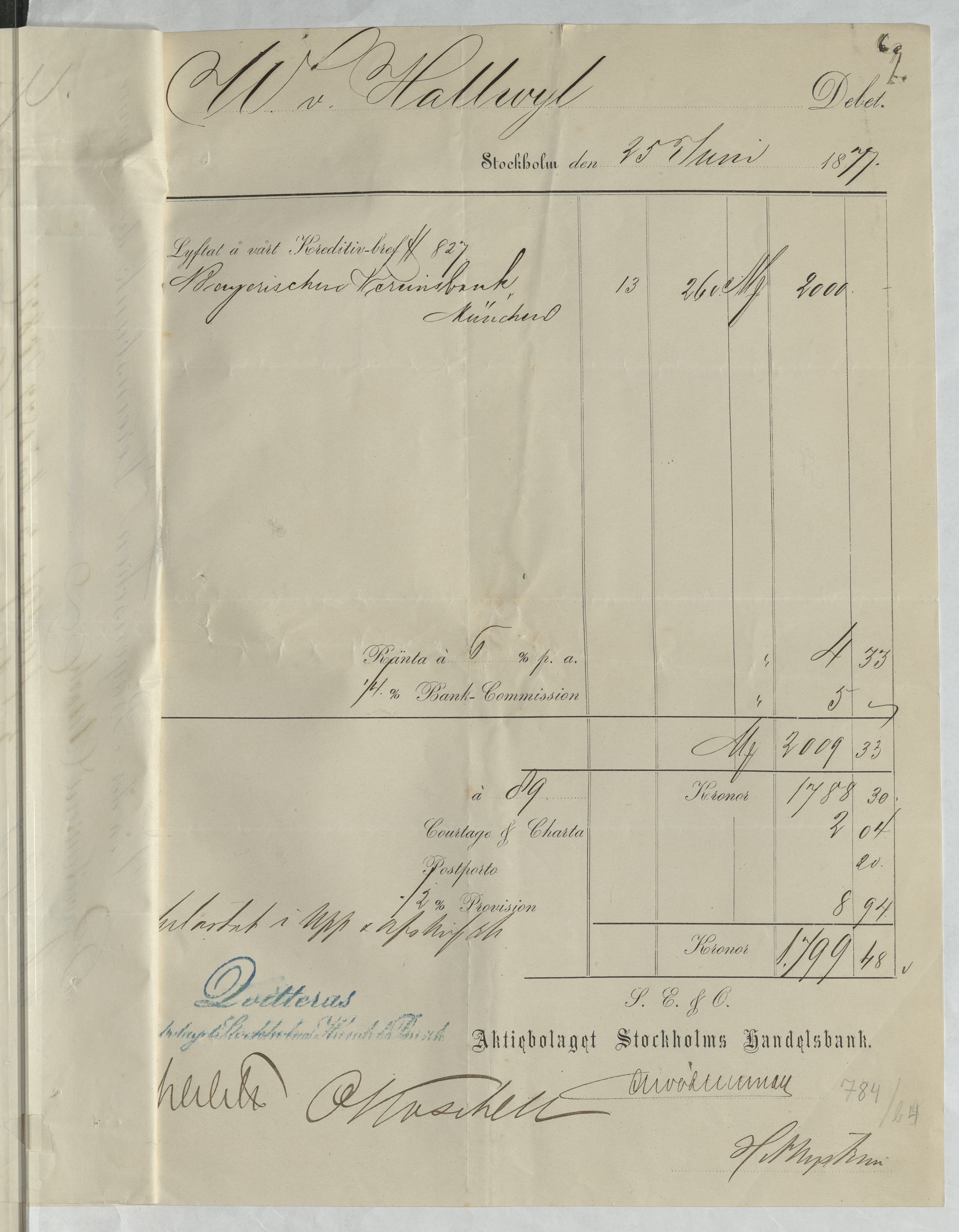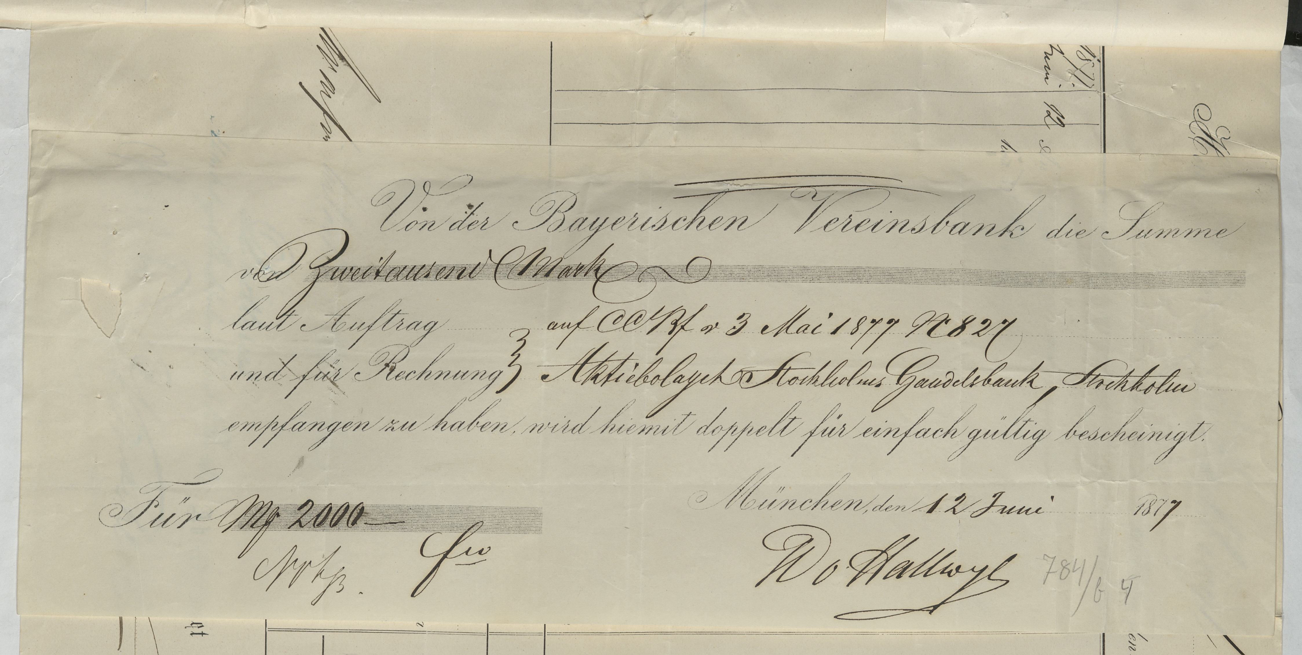 Kvitto från Aktiebolaget Stockholms Handelsbank rörande Bayerischen Vereinsbank, München