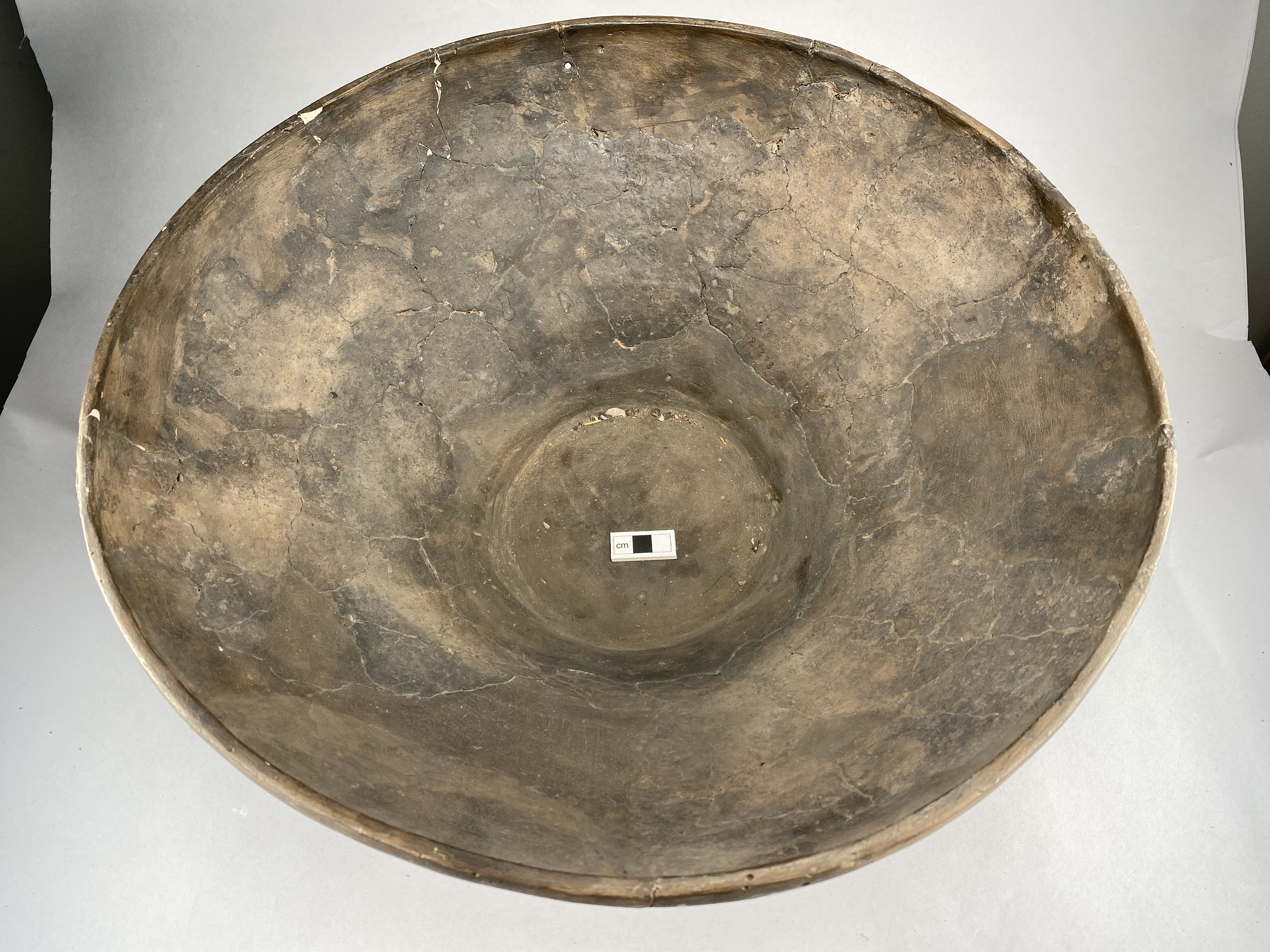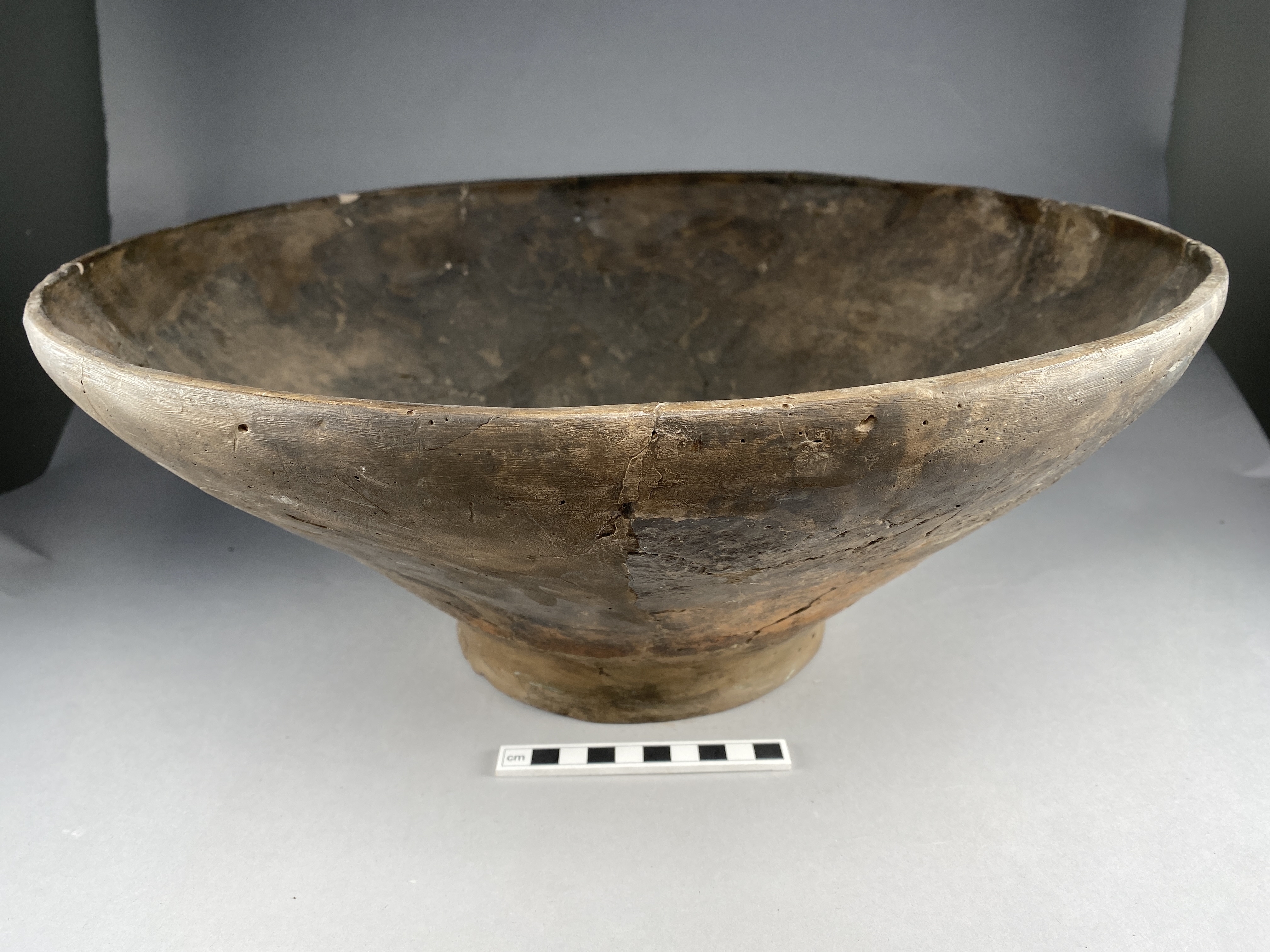 Ett stort och vidbukigt fat. Avsatt fot. flammigt bränt. till stor del rekonstruerat. Sex bevarade runda, genomborrade hål på skuldra och buk.