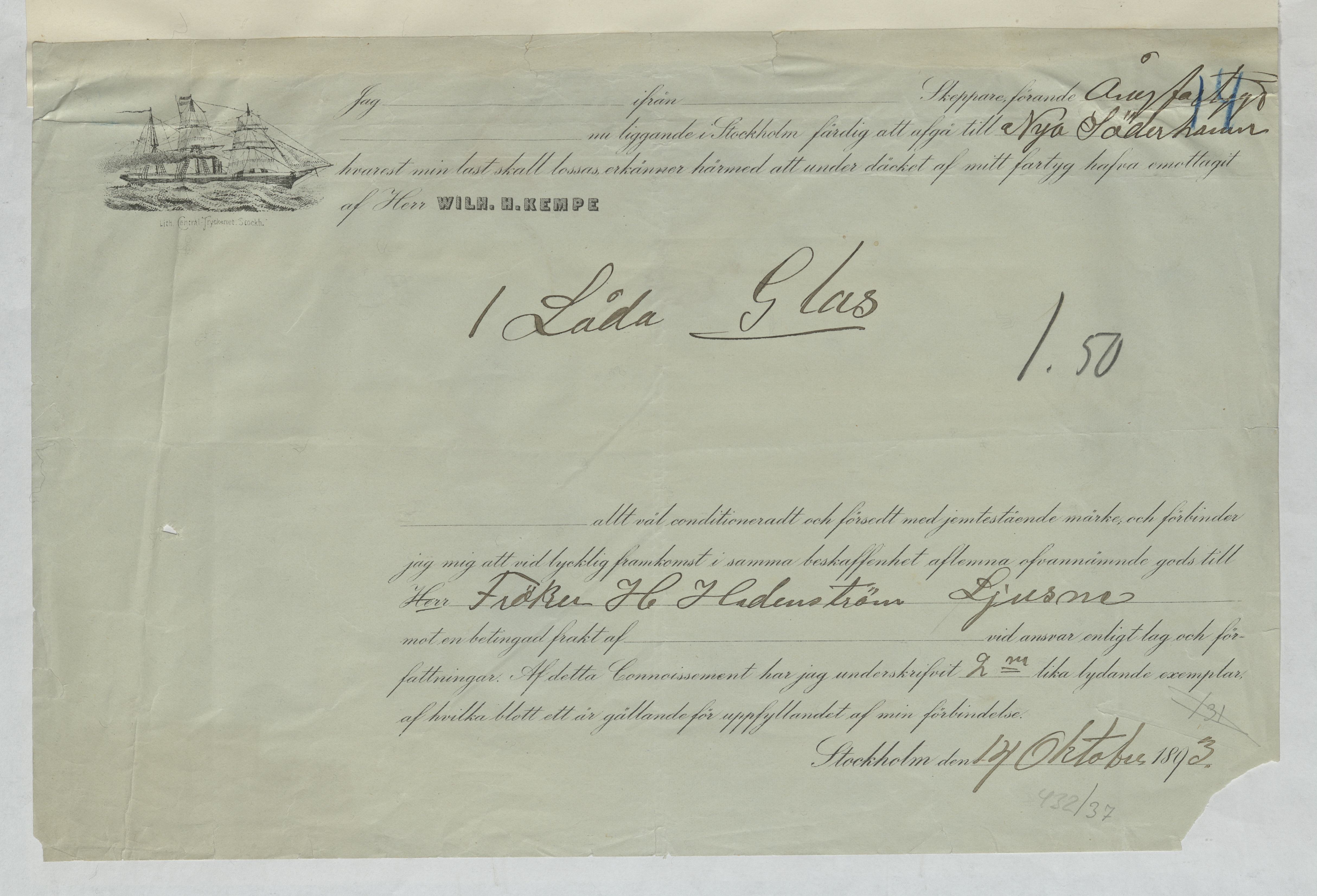 Verifikation från Firma Wilh. H. Kempe. Gällande frakt av 1 låda glas till Ljusne. Stockholm, 1893.