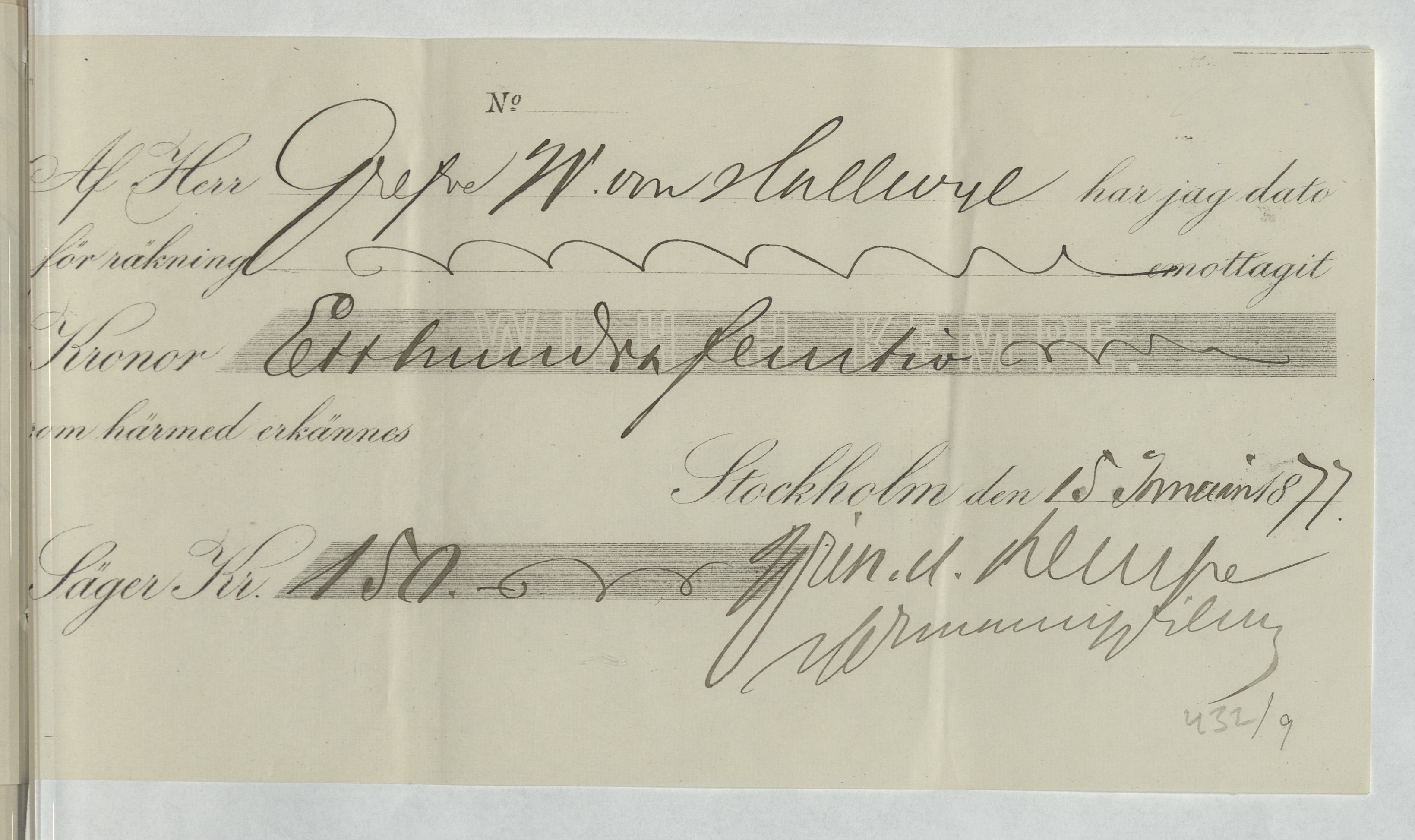 Kvitto från Firma Wilh. H. Kempe rörande emottagna kontanter till Walther von Hallwyl.