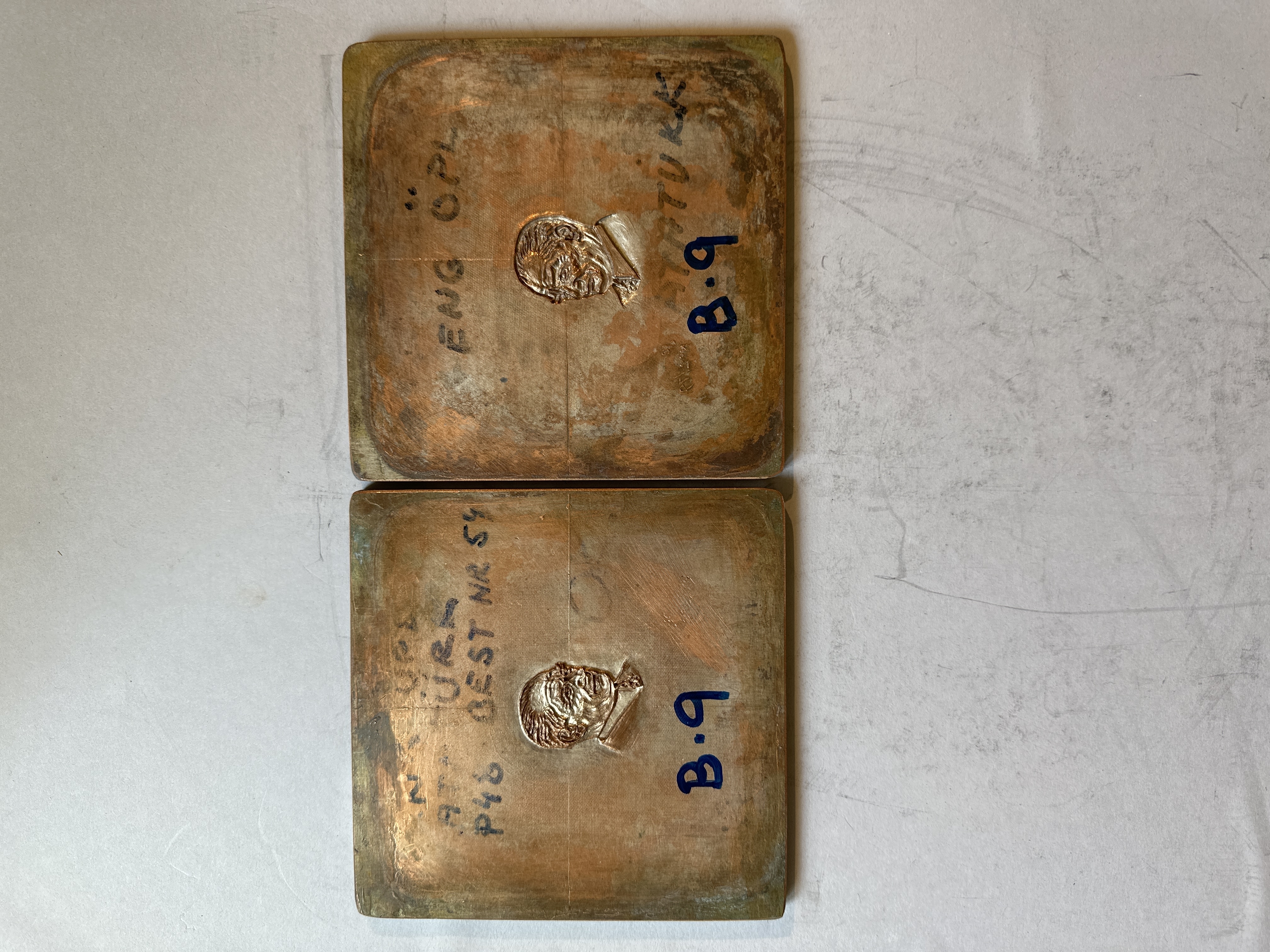 Pressplatta för vattenmärkestillverkning: "mansporträtt, Kemal Atatürk". 2 stycken. Text på framsidan av plattorna: Atatürk/P48/best nr 54/ ENG ÖPL/ B.9. Text på baksidan: 610/B2.