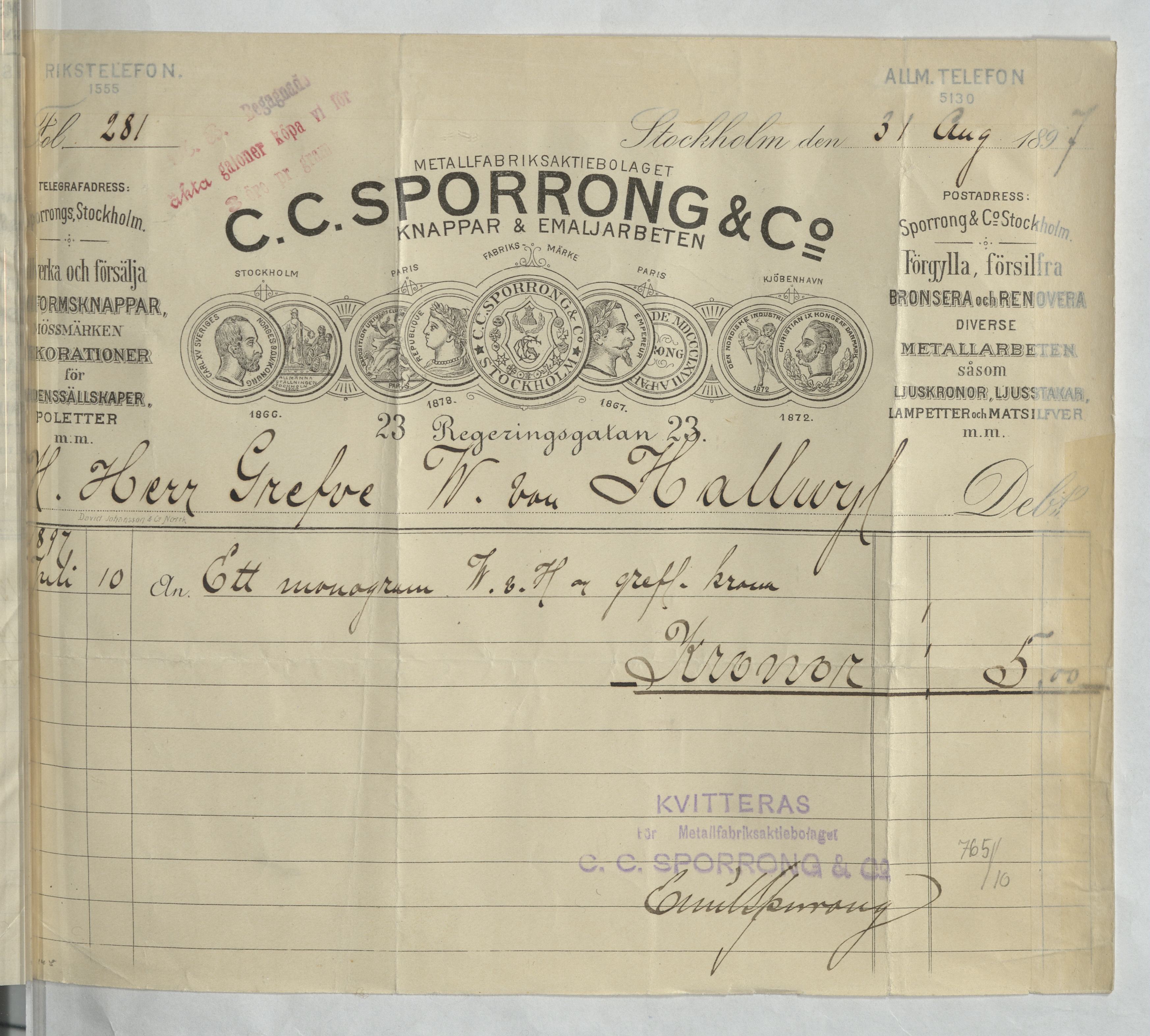 Kvitto från C. C. Sporrong & Co. Stockholm, 1897.