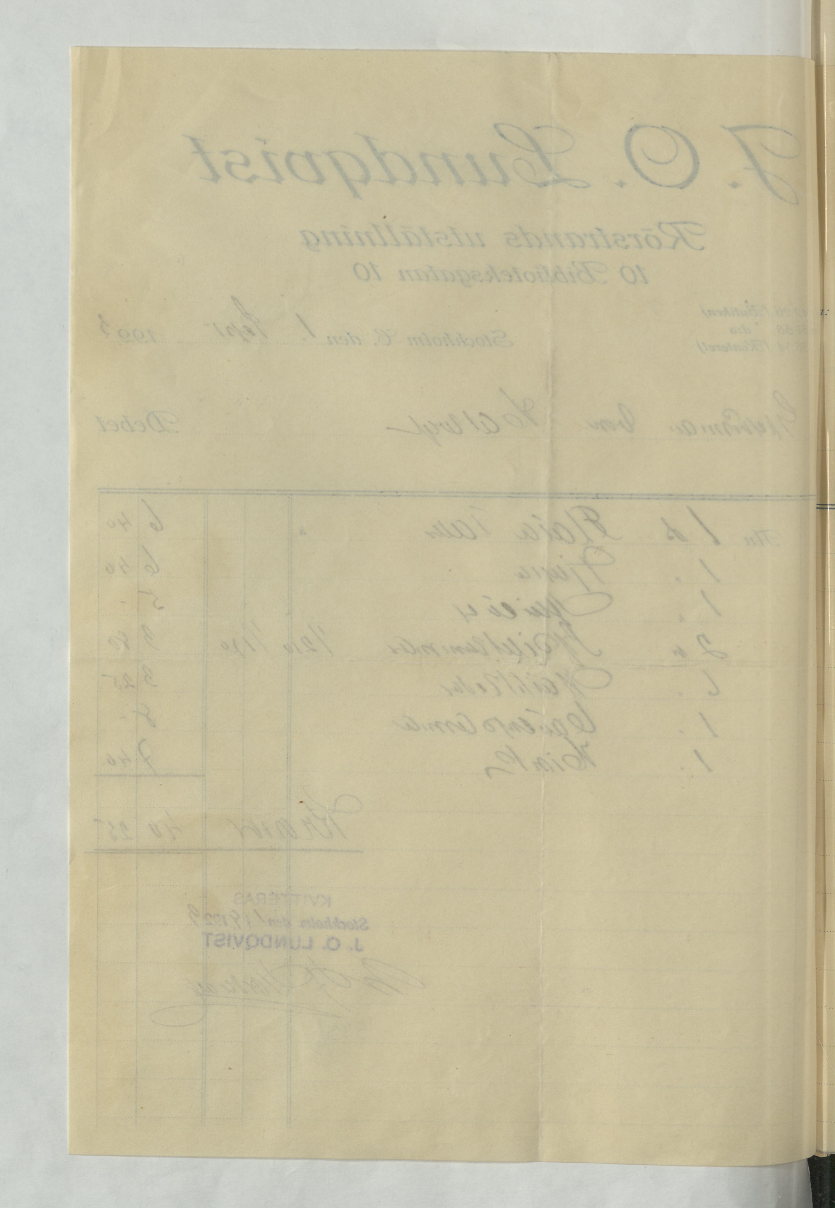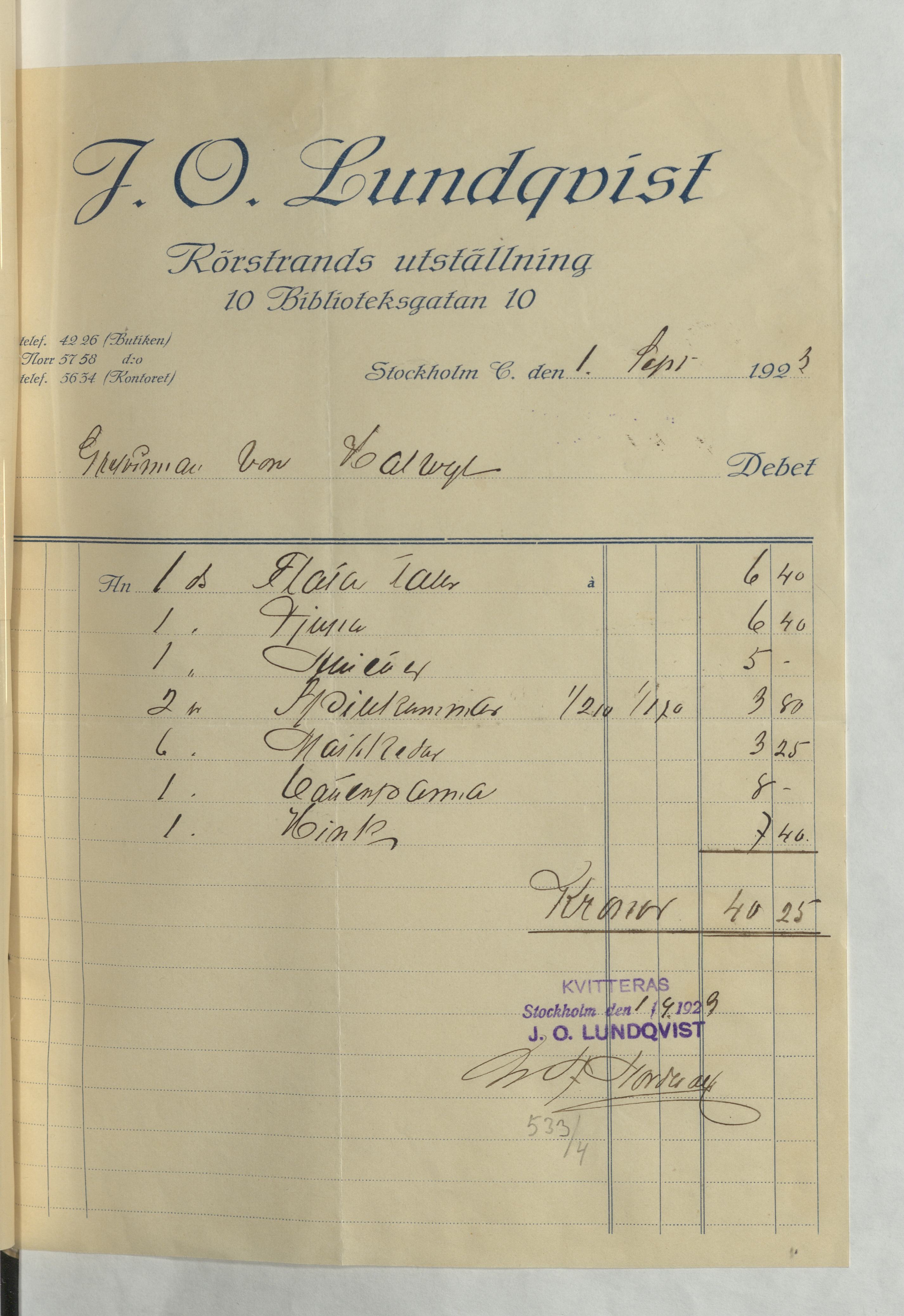 Kvitto till Fru Grevinnan Hallwyl för inköp av porslins- och hushållsvaror hos J. O. Lundqvist, Rörstrands Porslins-Magasin, Rörstrands Utställning, för en summa av 40:25Kr. Stockholm, 1929.