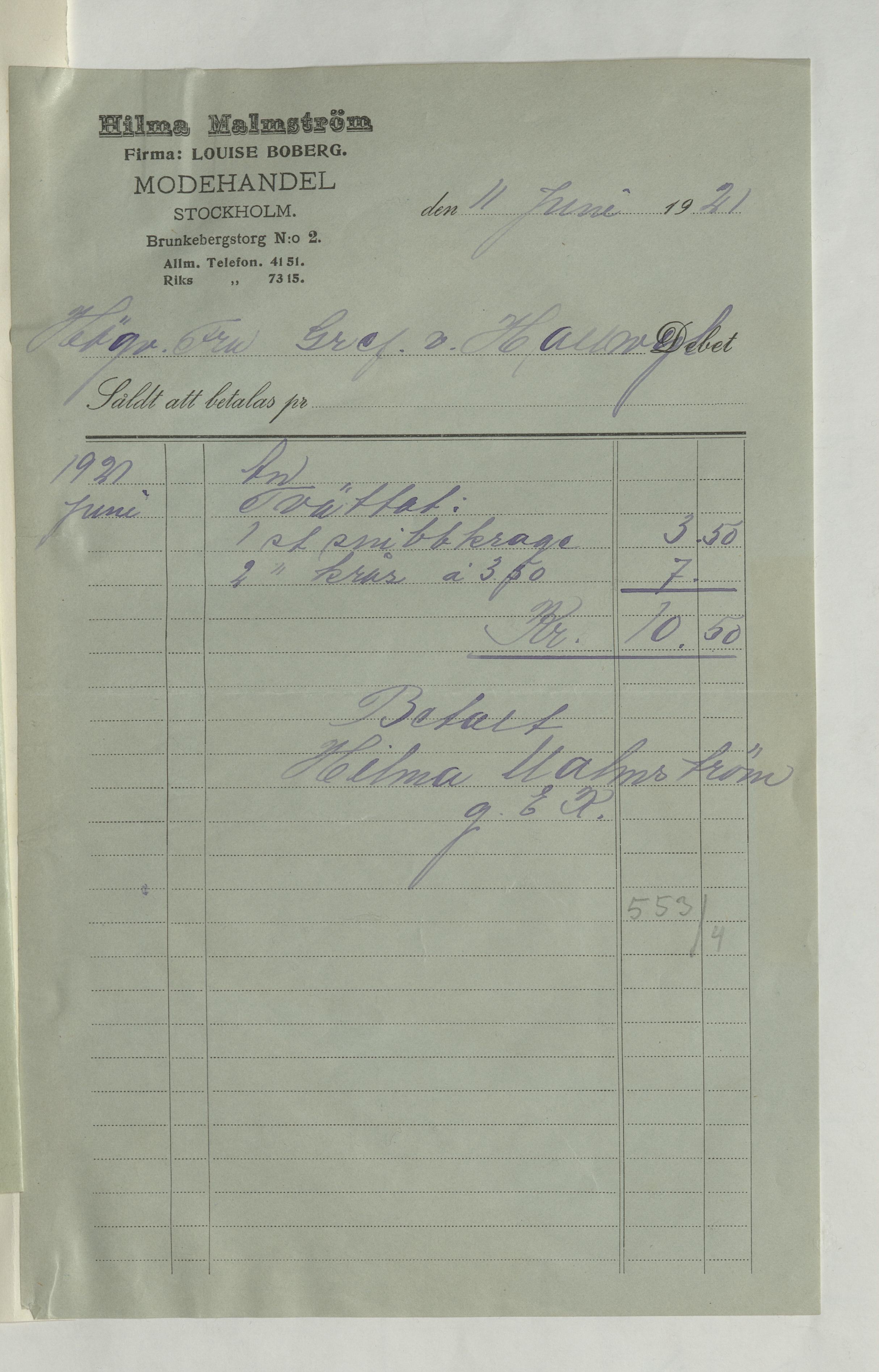 Kvitto från Himla Malmström, Firma Louise Boberg Modehandel, till fru Grevinna Hallwyl. Totalsumma 10:50kr. Betald och kvitterad 11 juni 1921.