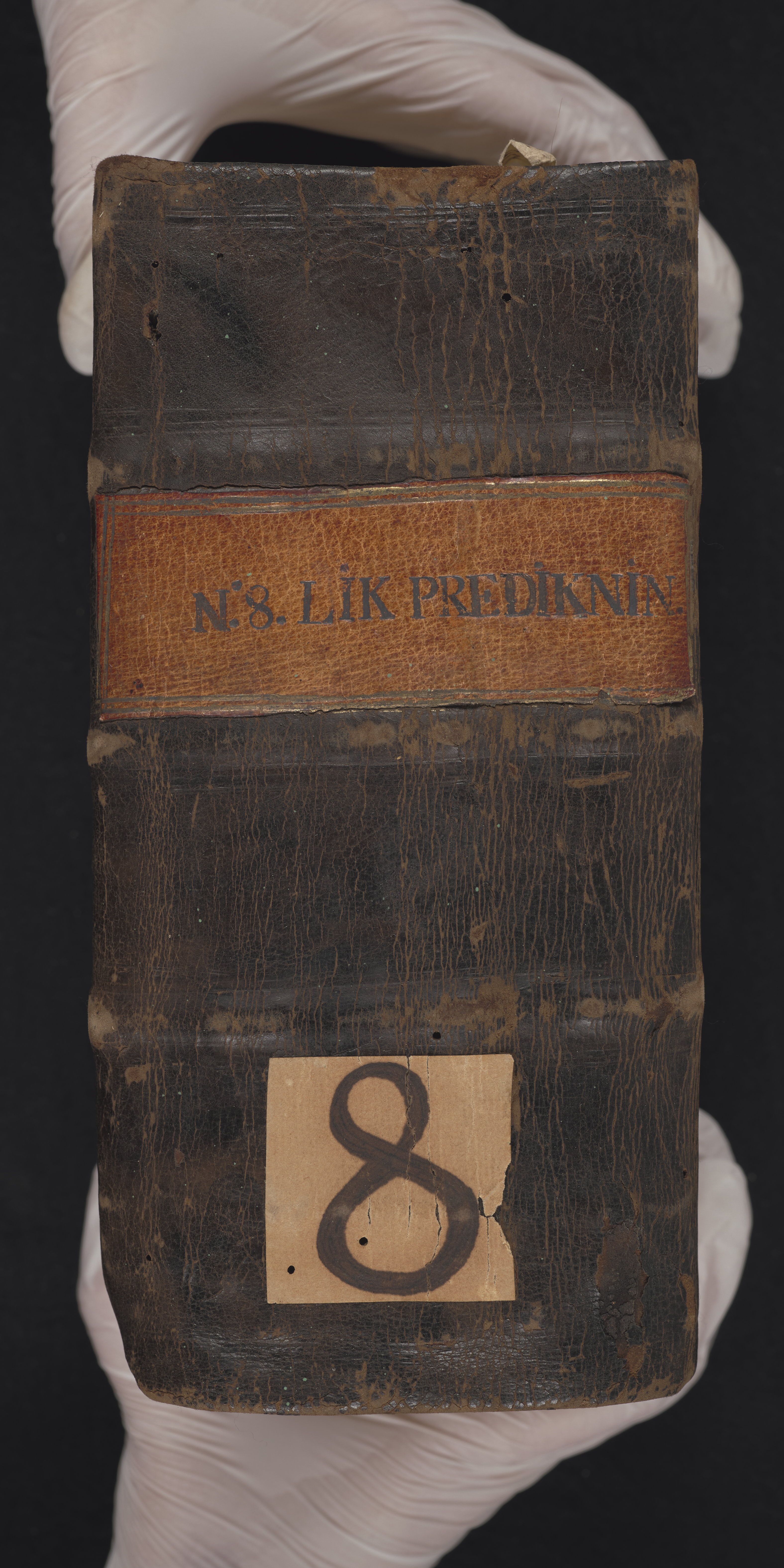 Band m. pärmar av marmorerat papper, rygg och hörn av fårskinn. Pärmfyllnad: papp. Inlagan består av enskilda skrifter som tillsammans häftats på tre bind, fast rygg. Variationer i papperskvalitet och storlek. 18 skrifter samlade i en volym. Handskriven innehållsförteckning som anger 16 personer. Kvartovolym nr. 8 enligt Bielkes register.