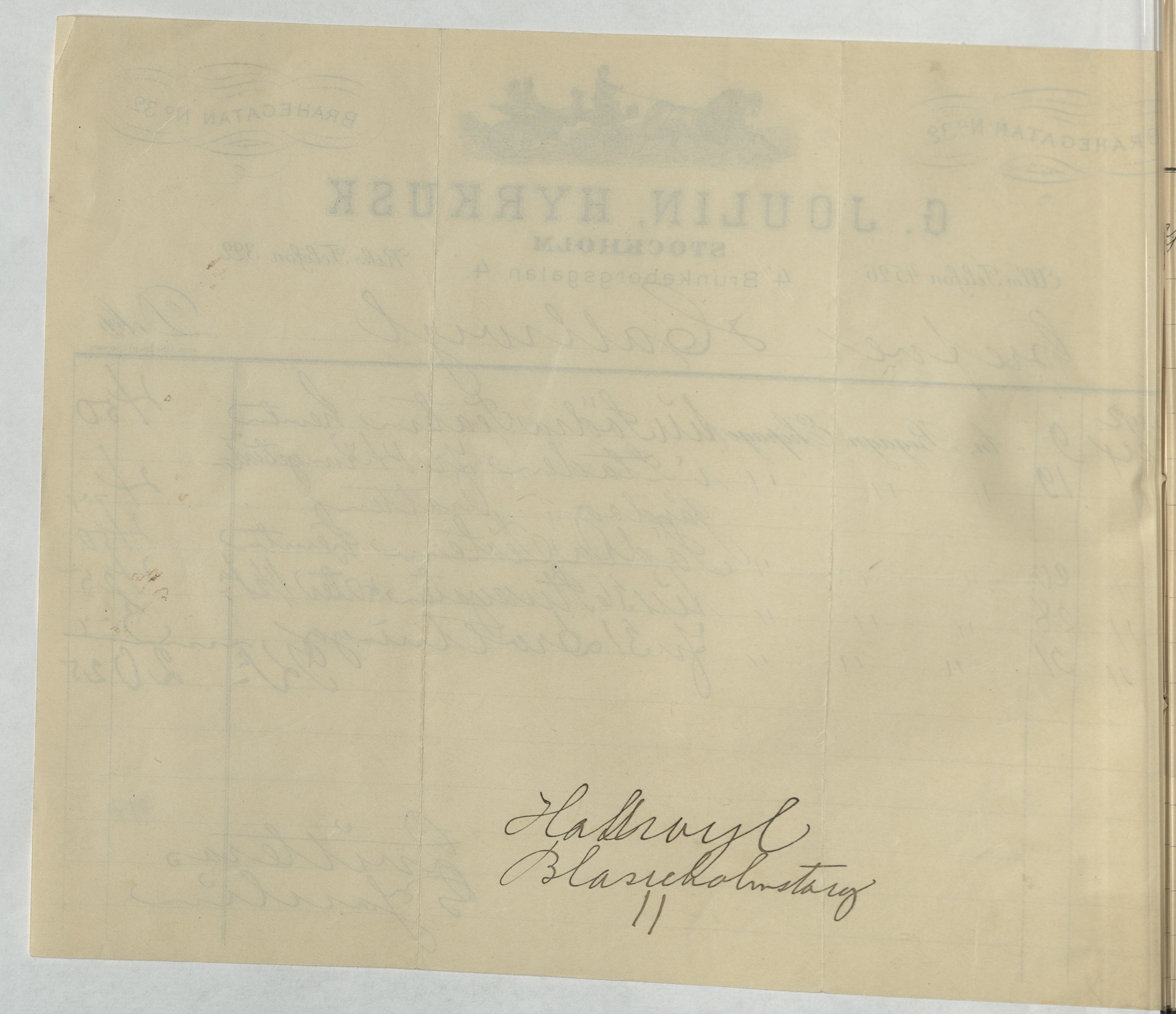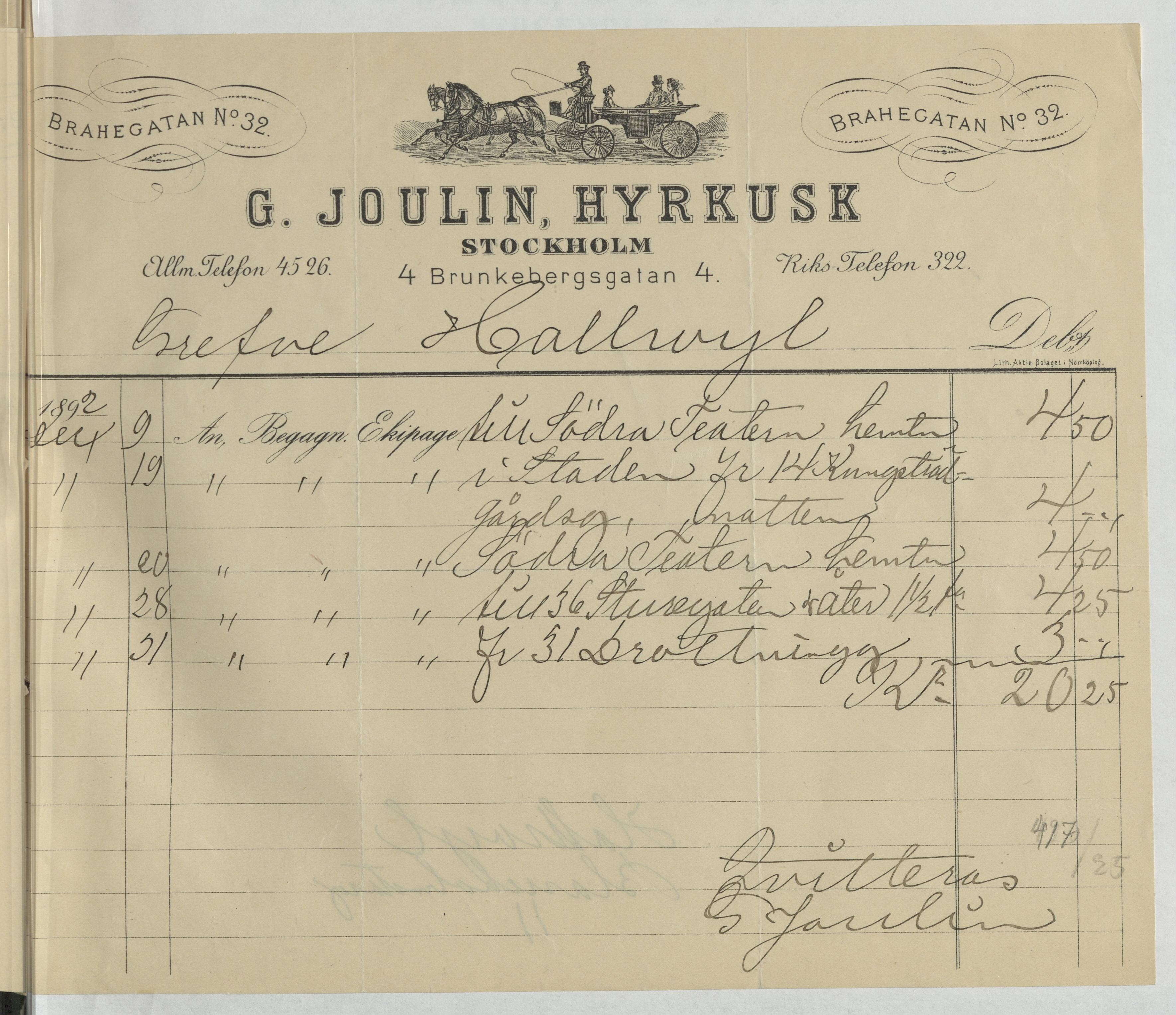 Kvitto från G. Joulin, Hyrkusk. Gällande resor till och från platser så som Södra Teatern, Kungsträdgårdsgatan 14, Sturegatan 36 och Drottninggatan 31. Stockholm, 1892.