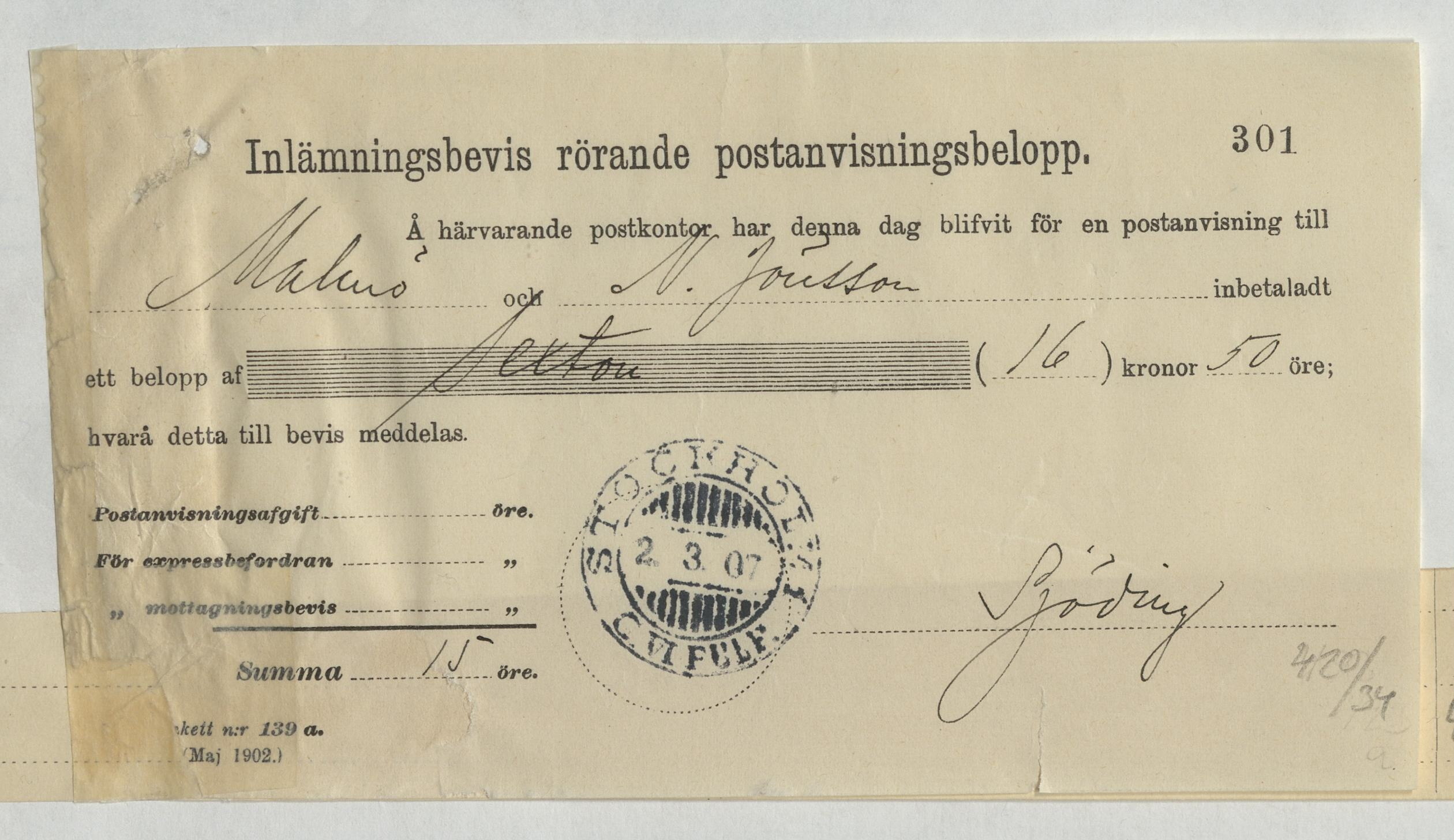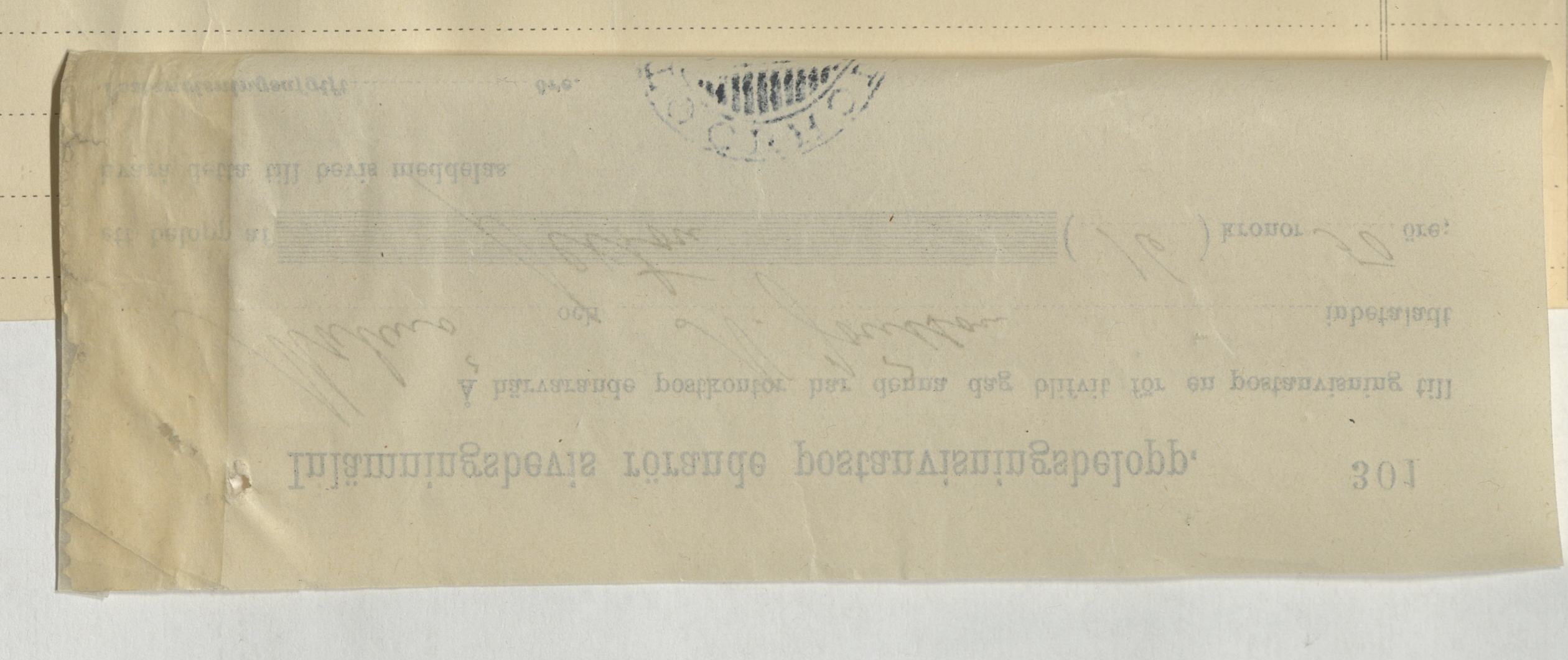 Inlämningsbevis rörande postanvisningsbelopp till N. Jönssons Skoetablissement