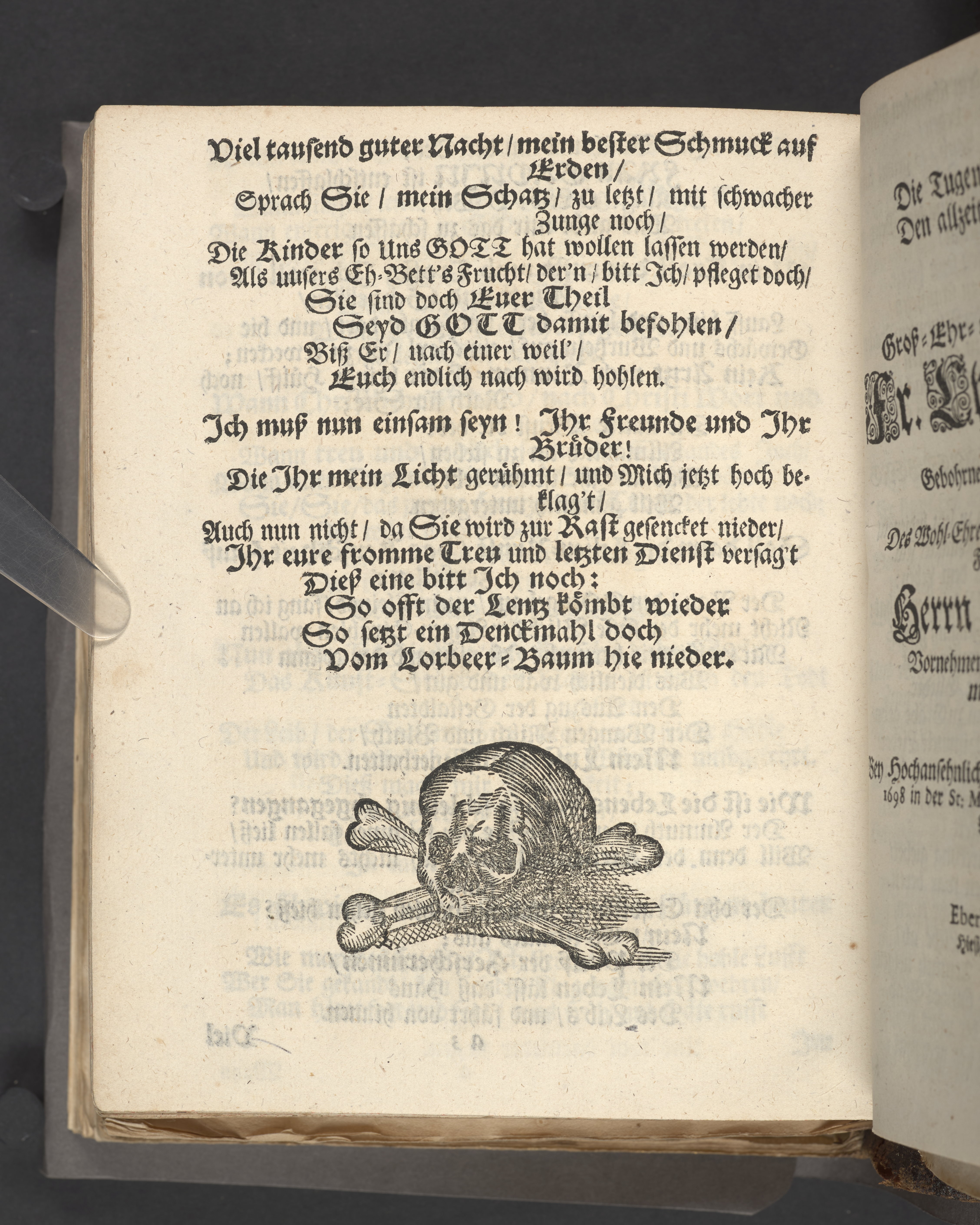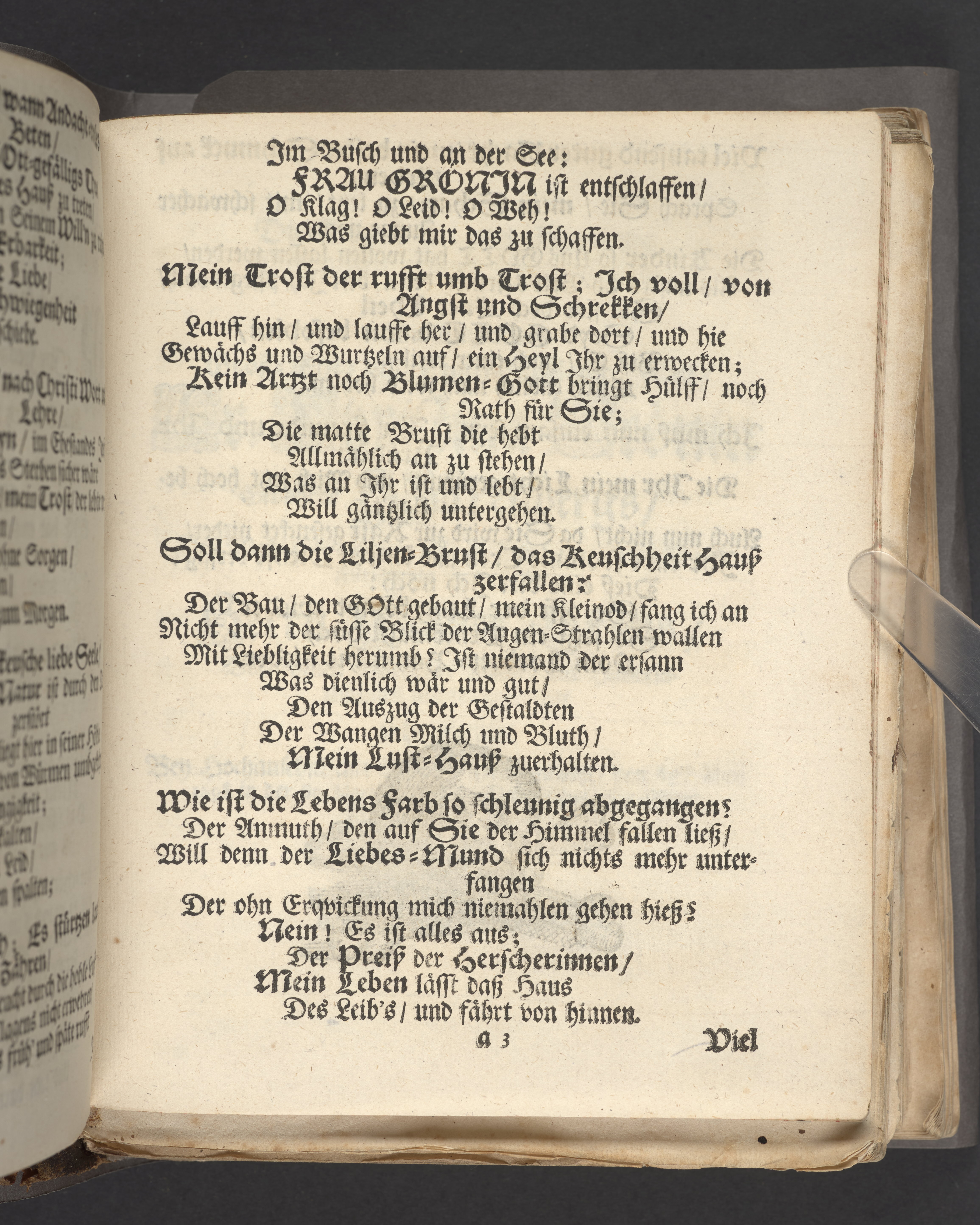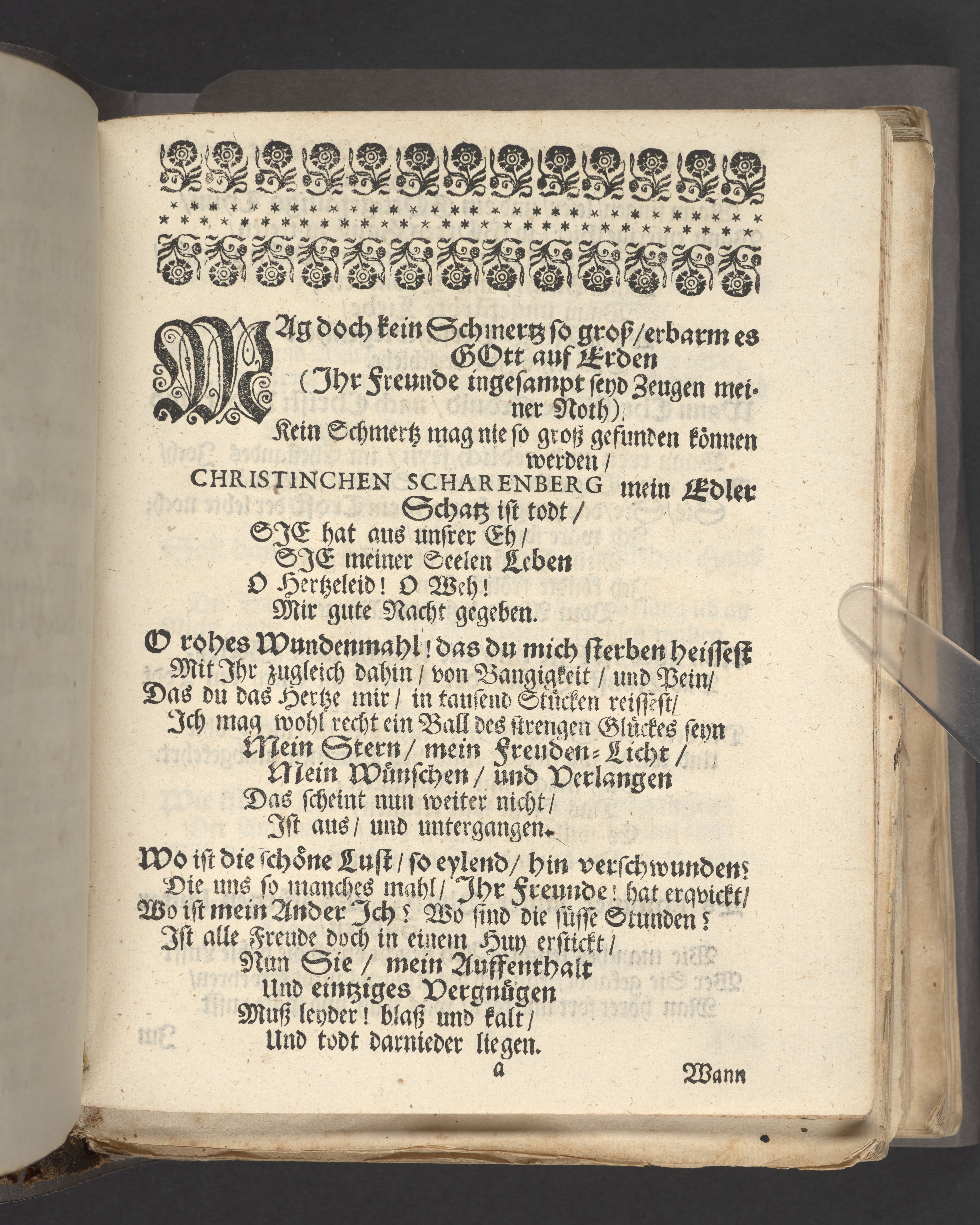 Hertz-whemüthige Klage des hoch-ehren-vesten/ gross-achtbarn/ hoch-und weit-benahmten Herrn/ Herrn Werner Gröns/ Wohlfürnehmen Kauf-Herrens alhier/ in dierser königl. weltberühmten Residence angestellet über den zwar fr¨hzeitigen doch höchsseeligsten hintritt der weyland gross-ehr- und hoch tugendbegabten Frauen/ Fr. Christina Grönin gebohrner Scharenberg/ als dessen hoch- und hertzgeliebtester Ehe-Gatinentseeleter Leichnamb den 8:ten Maij dieses lauffenden 1698:sten Jahres in de S:t Mariae magdalenae Kirchen bey volkreicher/ vornehmer und hochansehnlicher Versamblung/ zu ihrer Ruhe-Cammer/ Christlichem Gebrauc nach/ bestättiget worden und aus Christlichem ja hertzfliessendem Mitleiden entworffen von einem dem hochgeachteten Grön-Scharenbergischen Hause höchstverpflichtestem und dankschuldigsten Freunde und Diener.