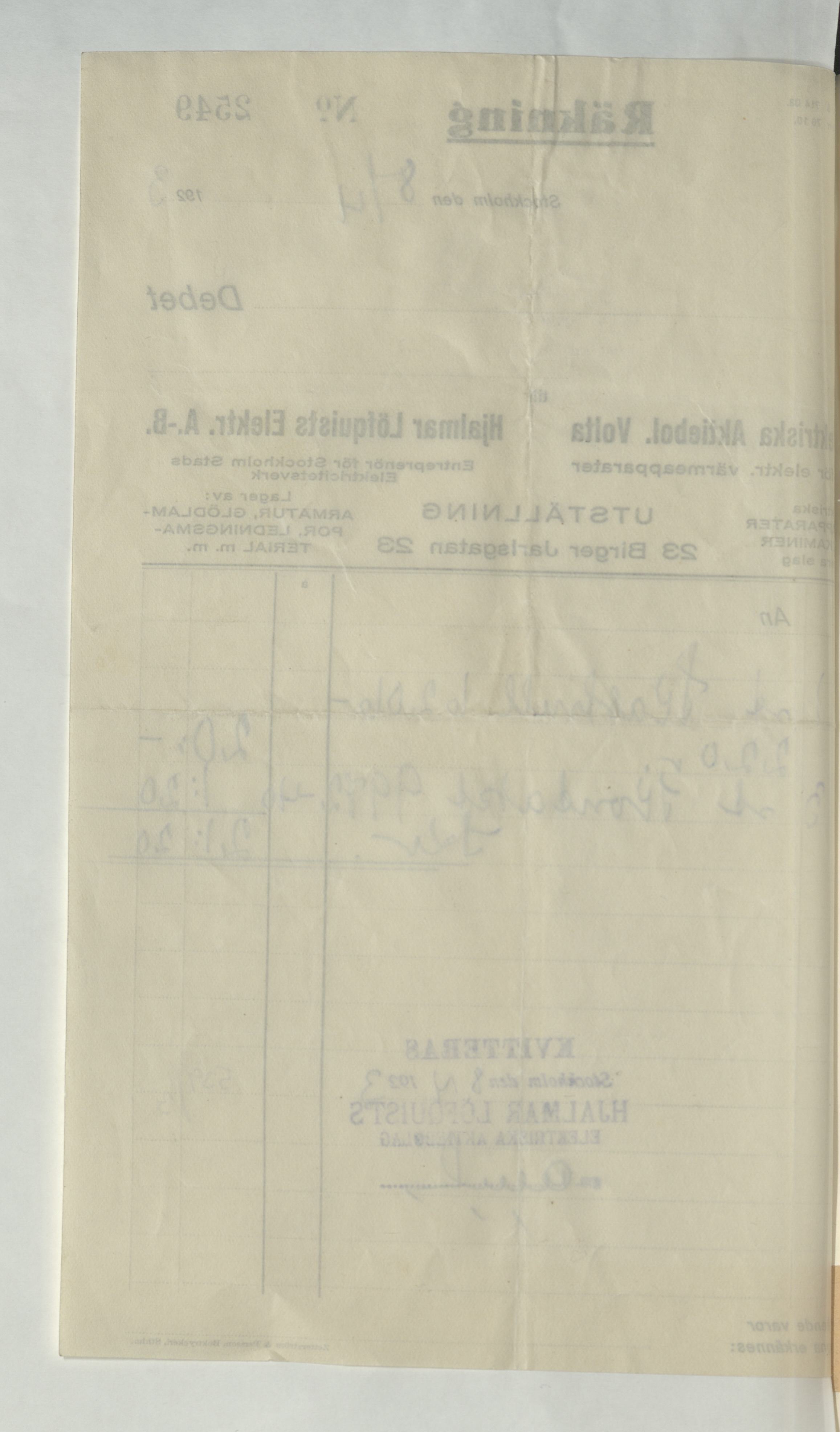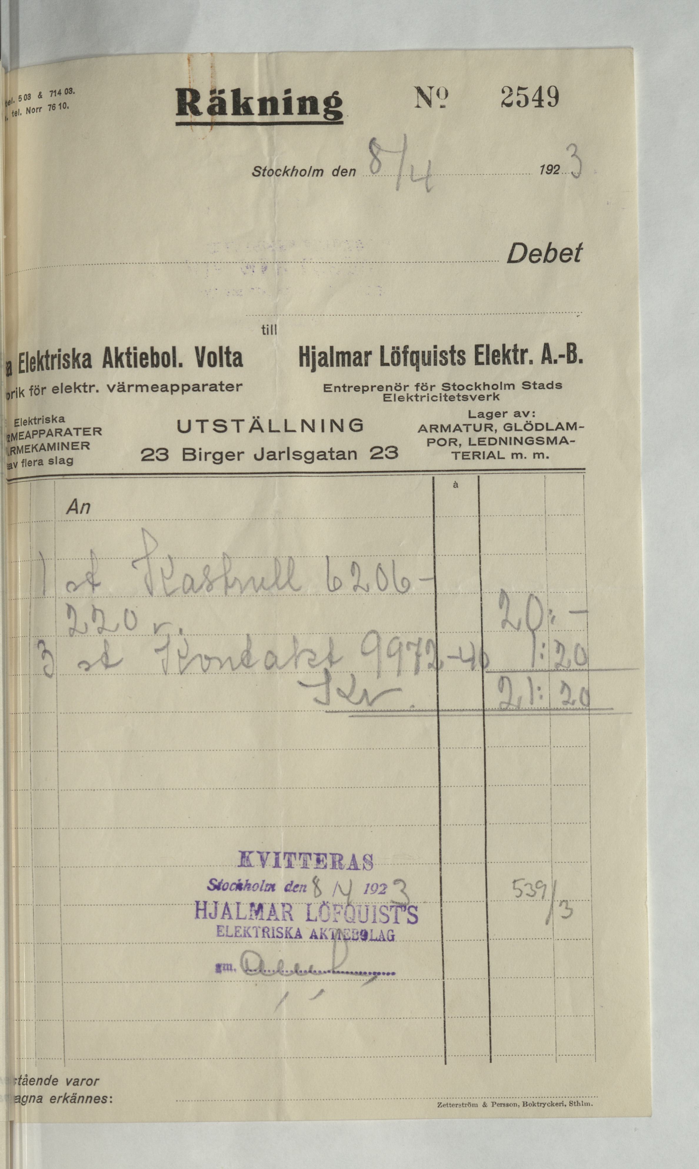 Kvitto från Hjalmar Löfquists Elektriska AB, Belysningsentreprenör, med en summa av 21:20Kr. Stockholm 8 april 1923.