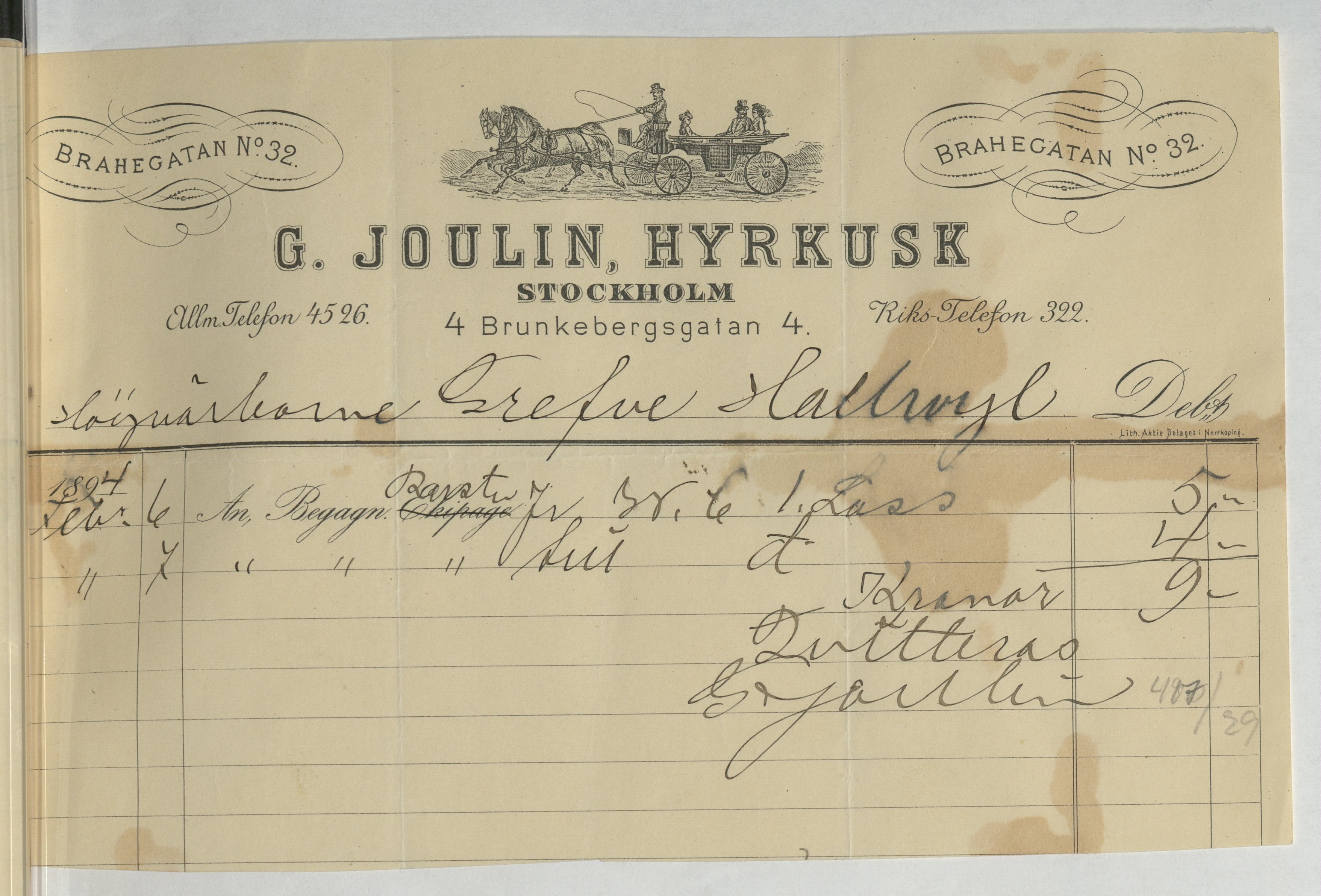 Kvitto från G. Joulin, Hyrkusk. Gällande transporter med rustvagn. Stockholm, 1894.
