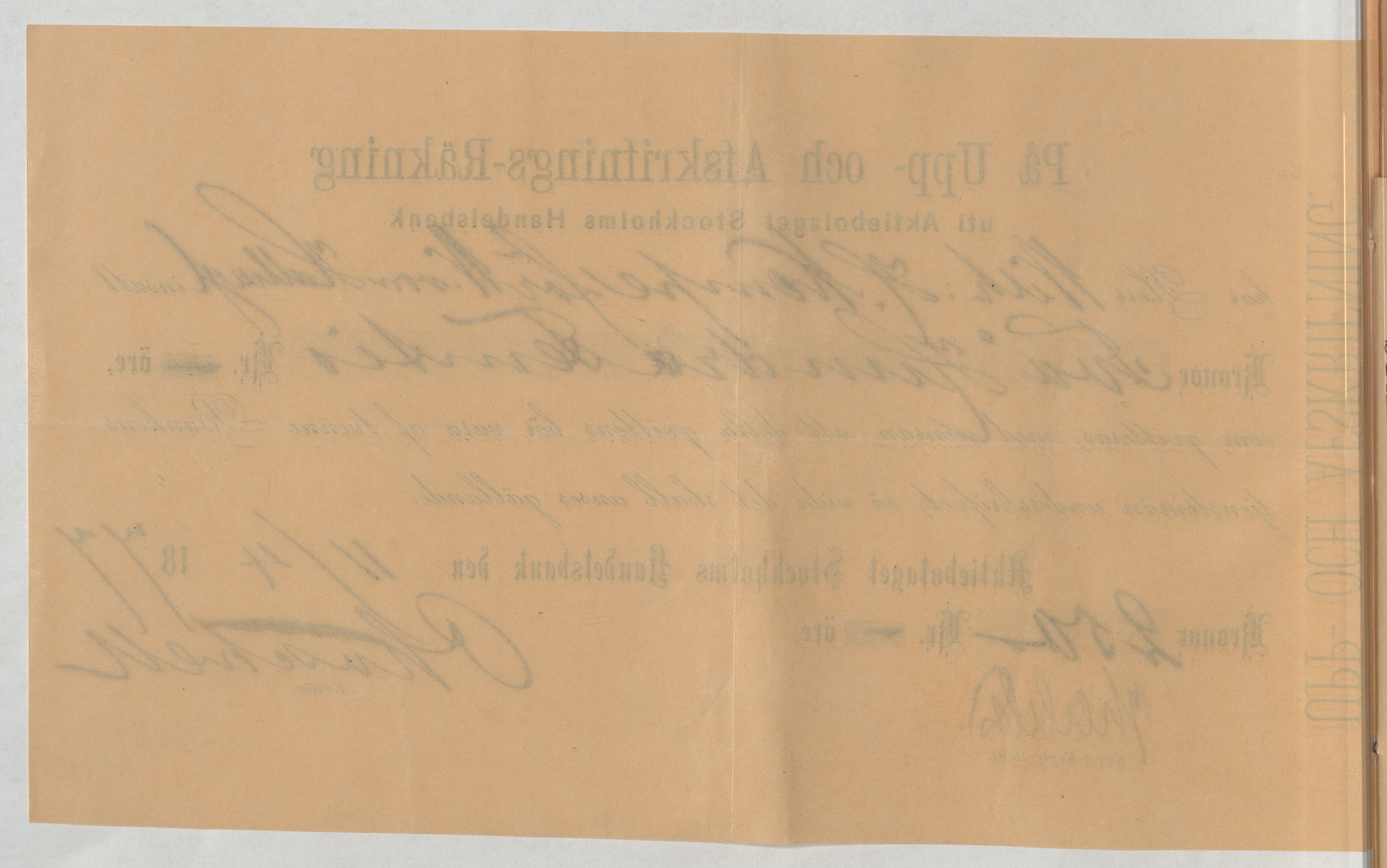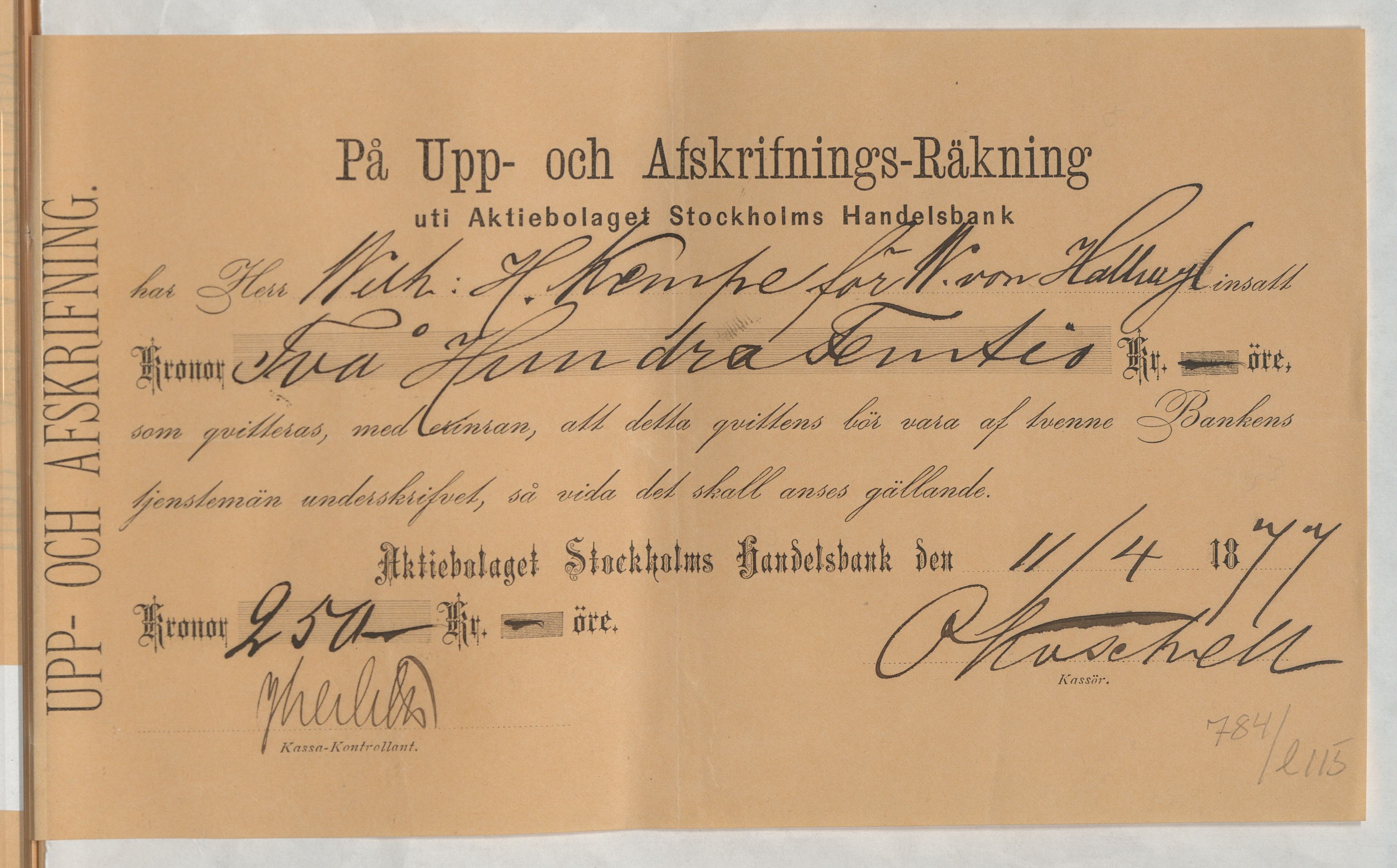 Kvitto från Aktiebolaget Stockholms Handelsbank rörande Upp- och Afskrifnings-Räkning