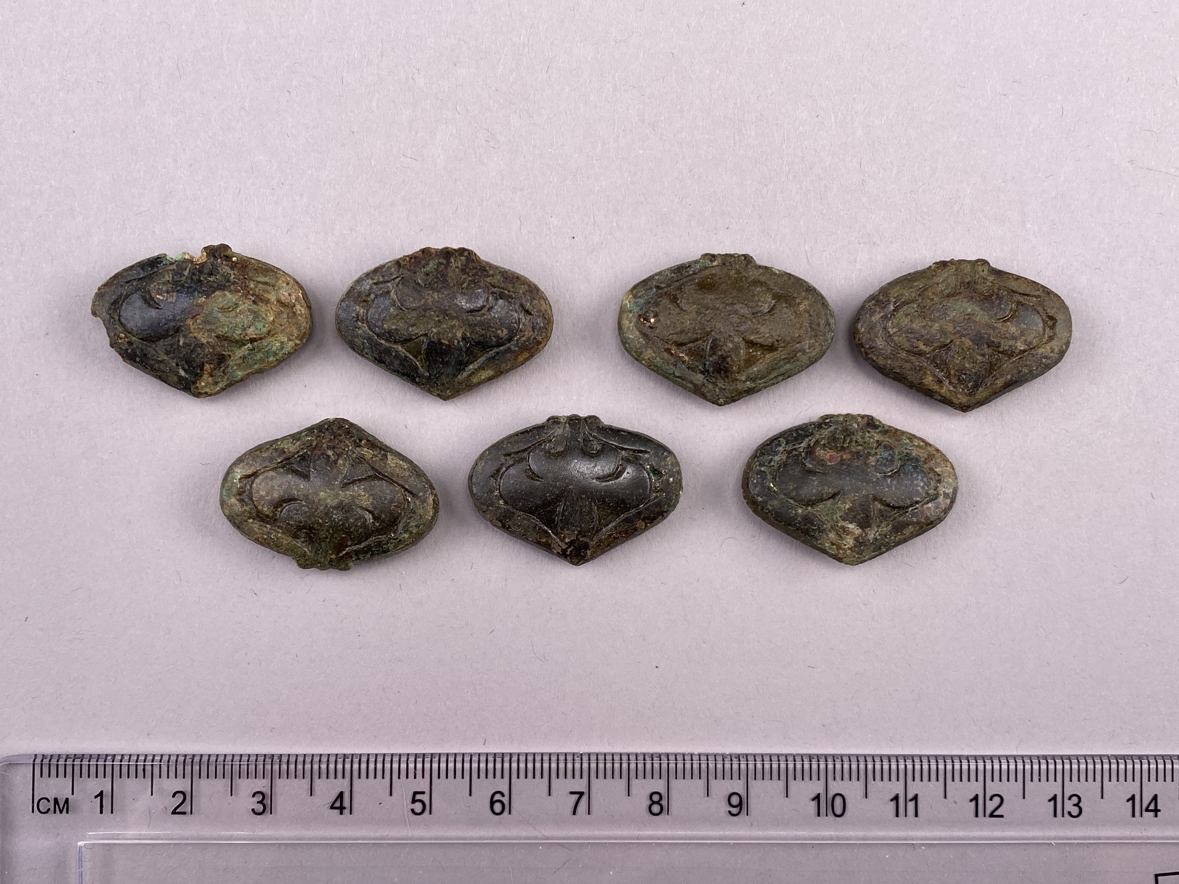 7 hjärtformiga bältesbeslag med spår av förgyllning samt vidsittande rester av bältesremmen.