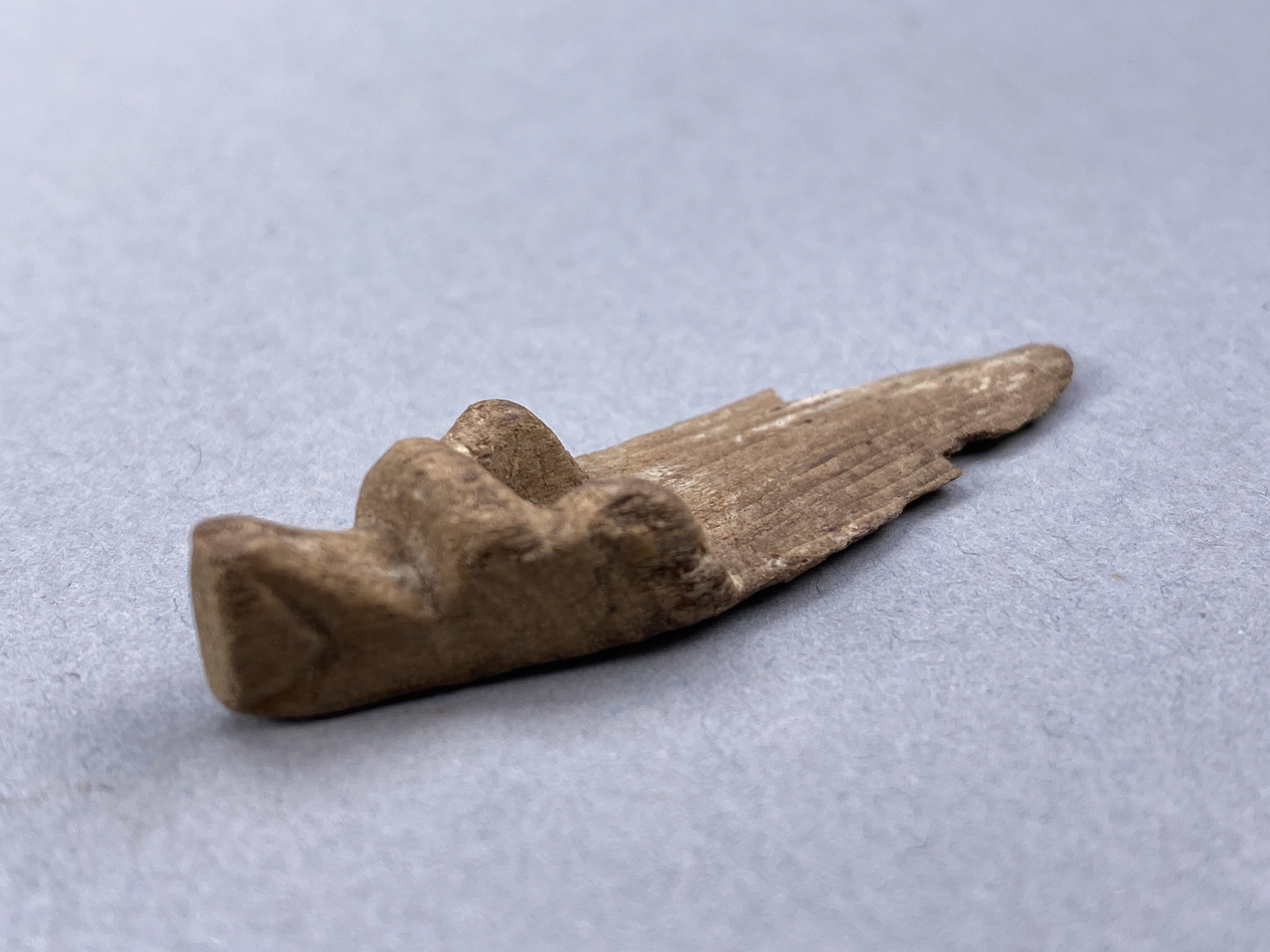 Täljd mindre träbit. Kan vara en detalj till ett lock. Den del som låser locket mot asken.