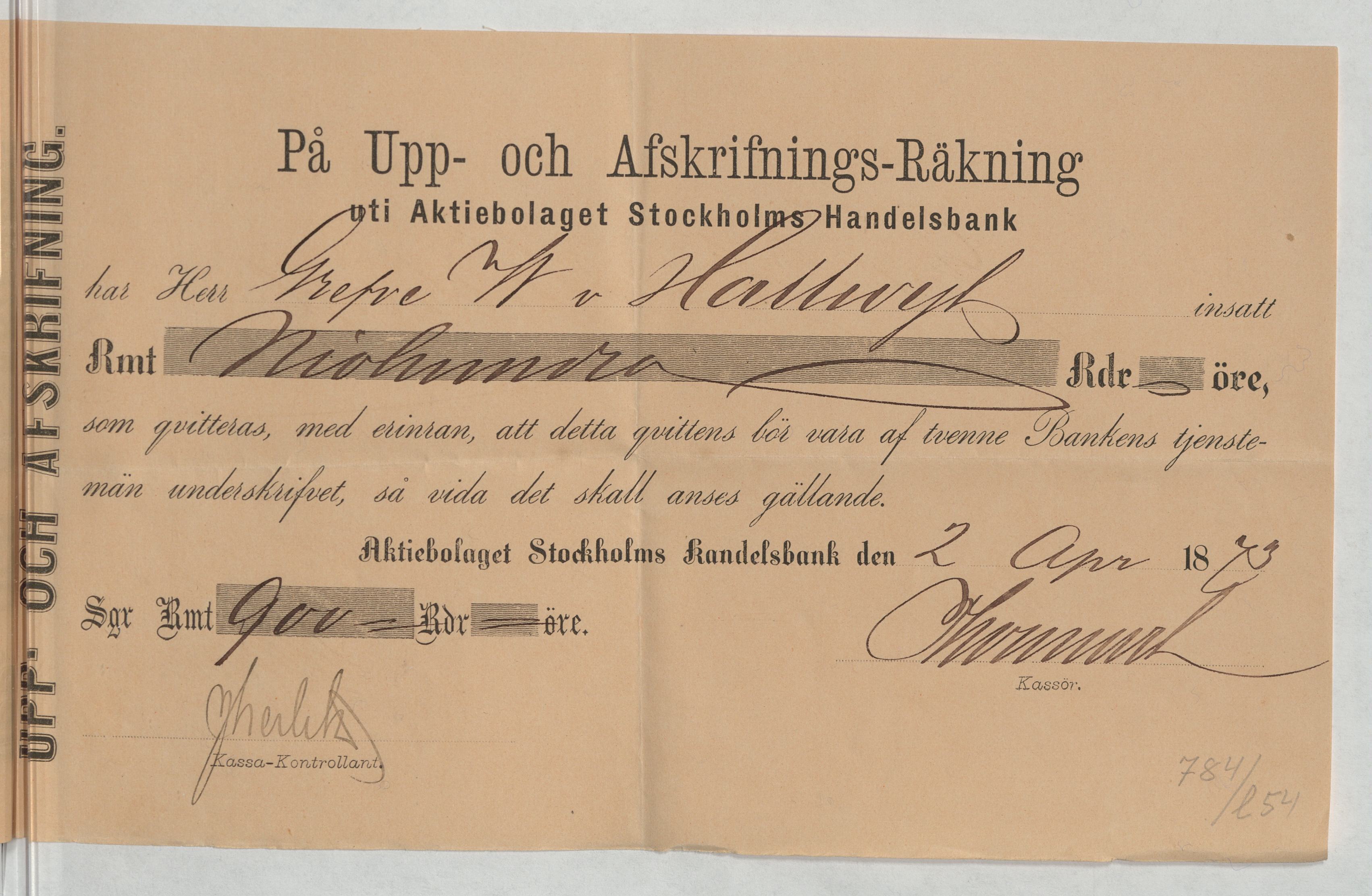 Kvitto från Aktiebolaget Stockholms Handelsbank rörande Upp- och Afskrifnings-Räkning
