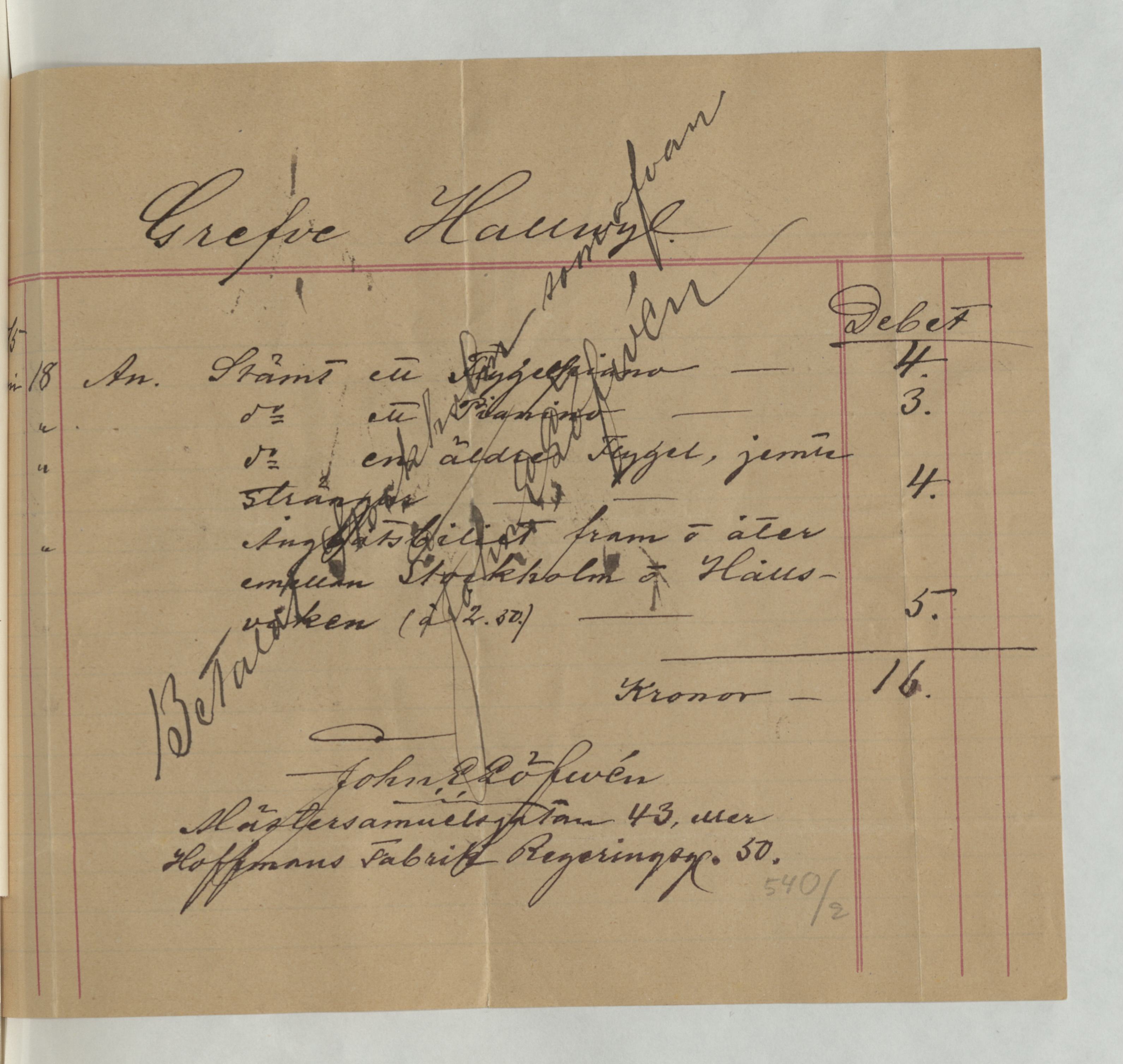 Kvitton från John E. Löfwén, Hoffmans Pianofabrik. Greve Hallwyl betalt 16Kr. Stockholm. Odaterat.