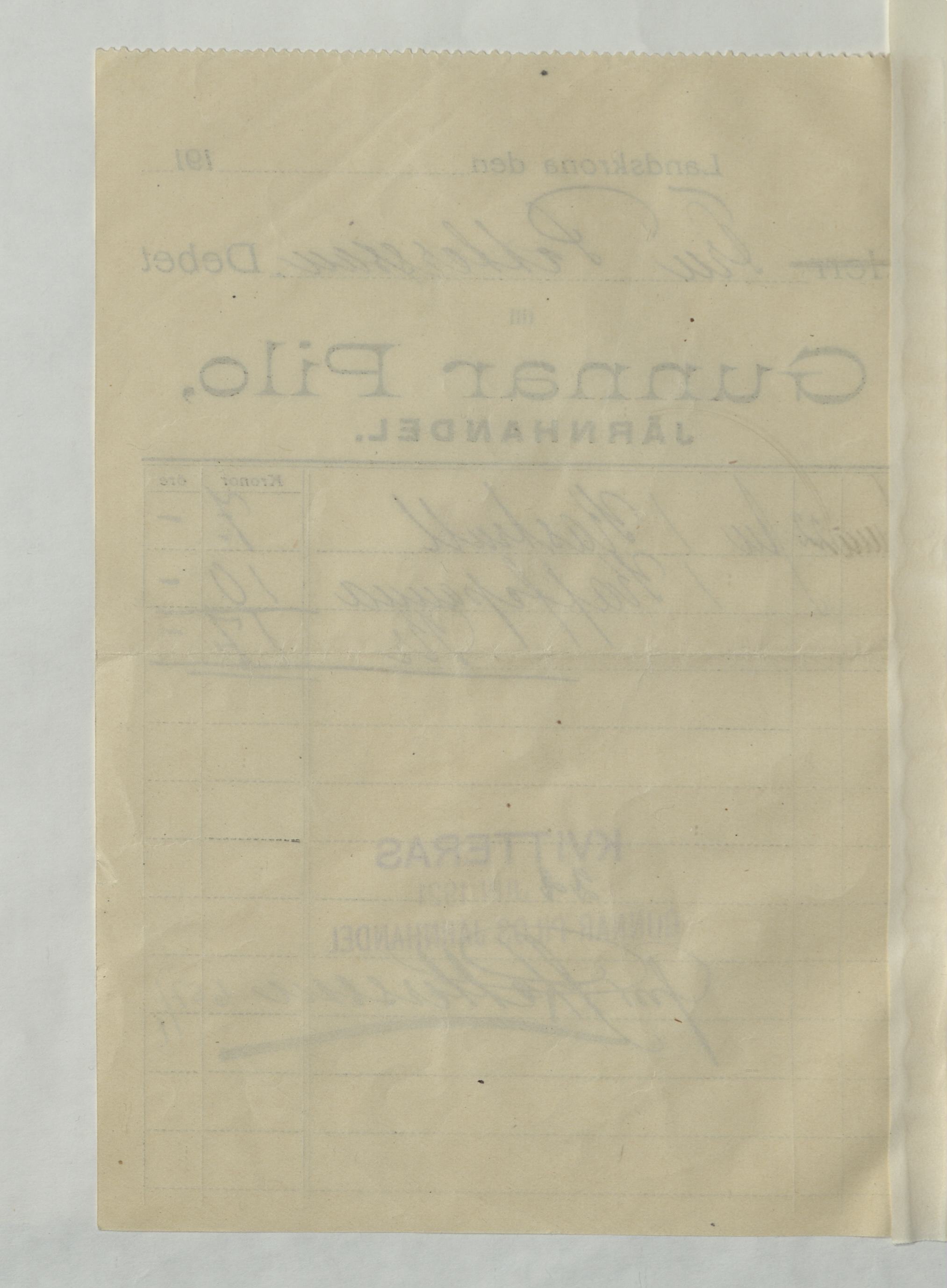Kvitto från Gunnar Pilo, Järnhandel, 1921
