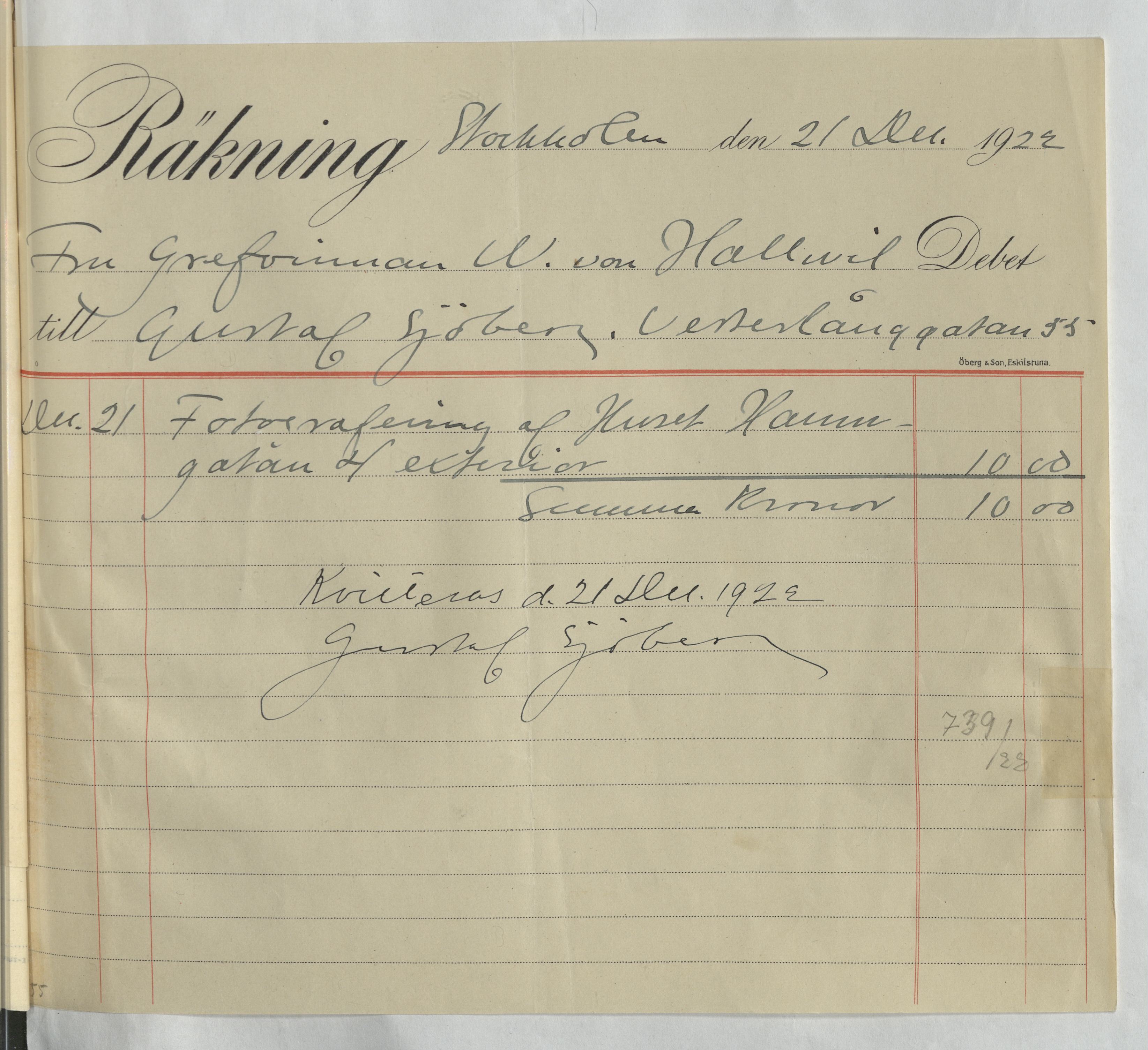 Kvitto från Gustaf Sjöberg. Gällande betalning för hans arbete med fotografering av museisamlingarna. Stockholm, 1922.