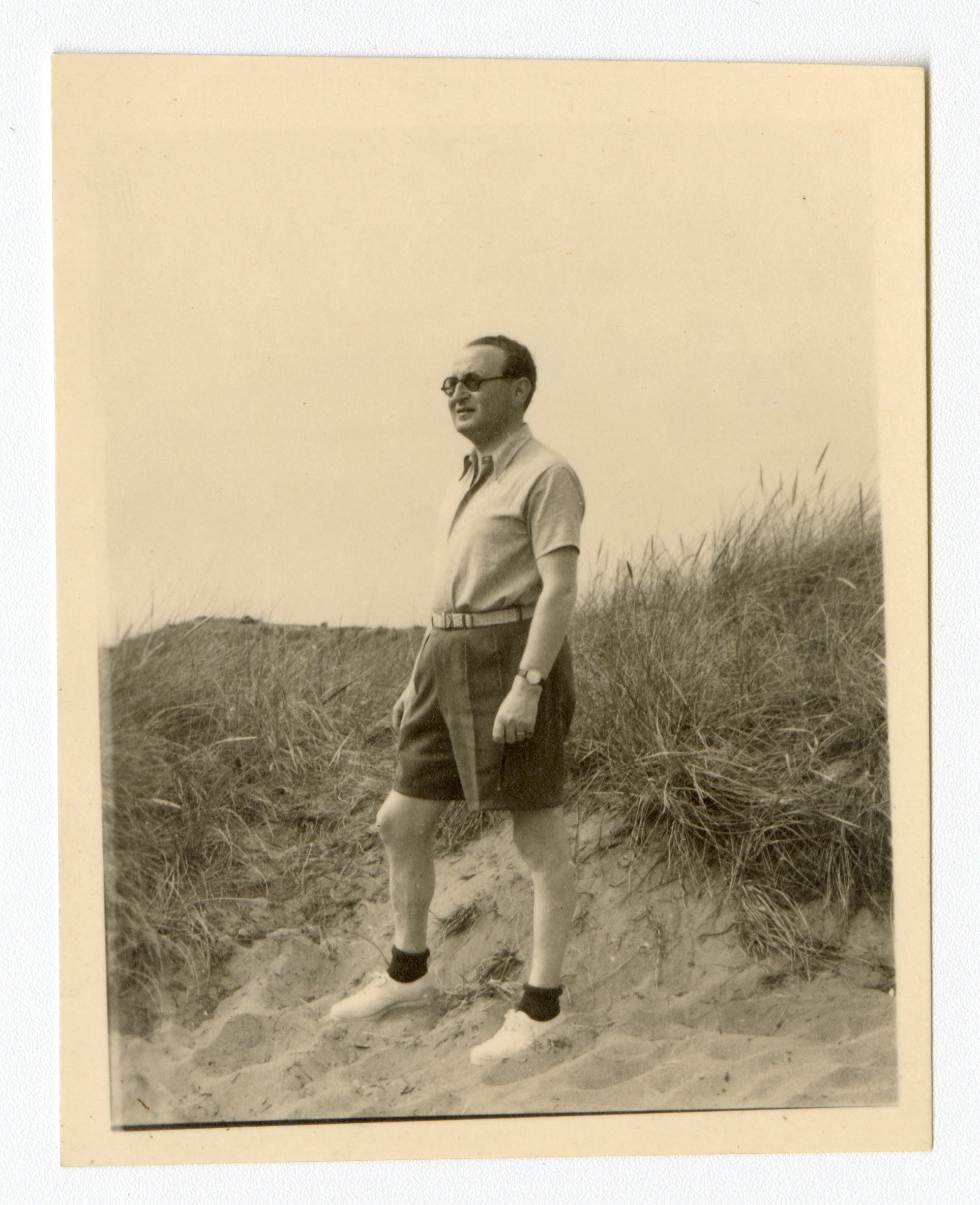 Fotografi föreställande Siegfried Rothschild som står på en strand, troligen i Danmark. Objektet består av två digitala filer.