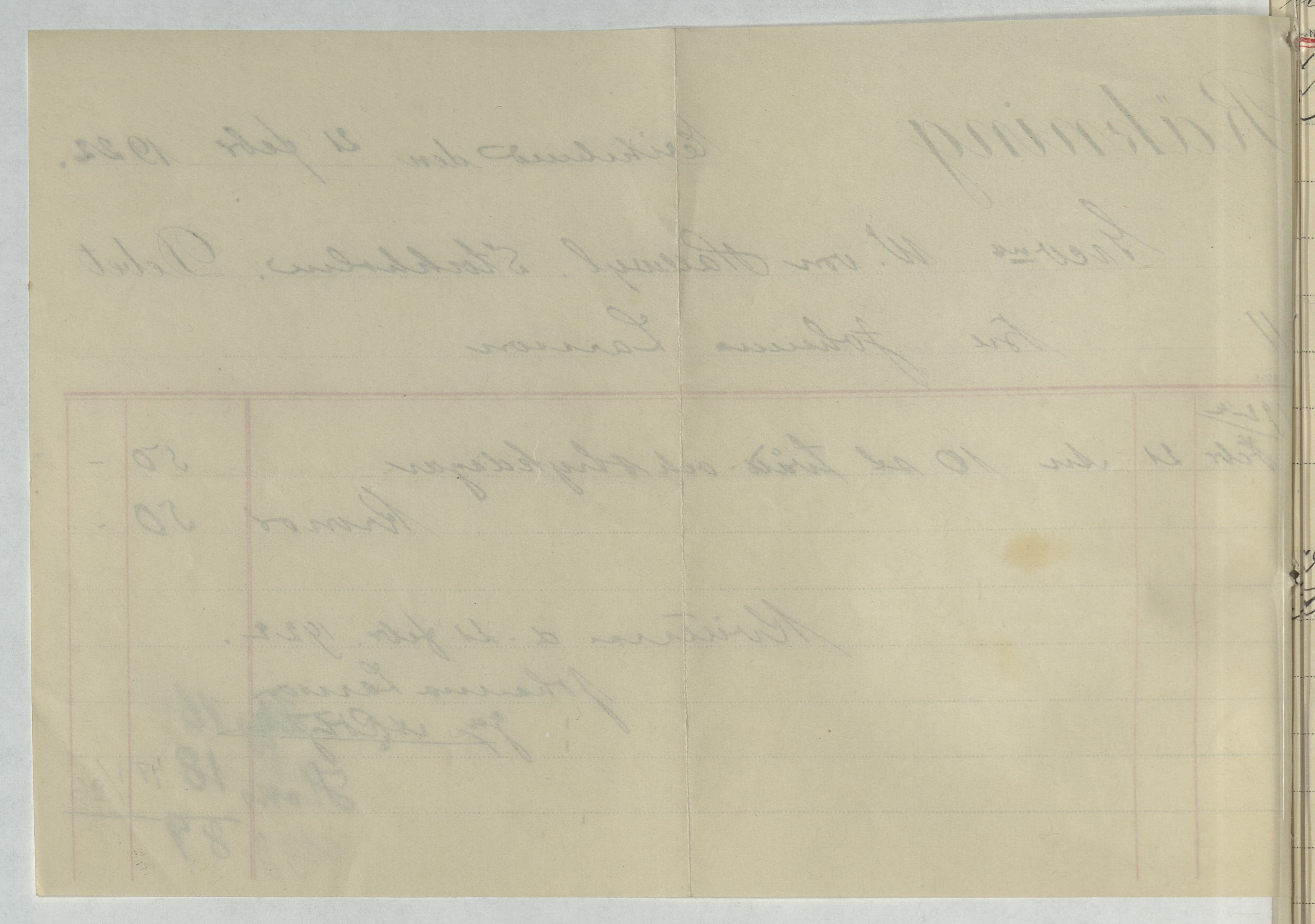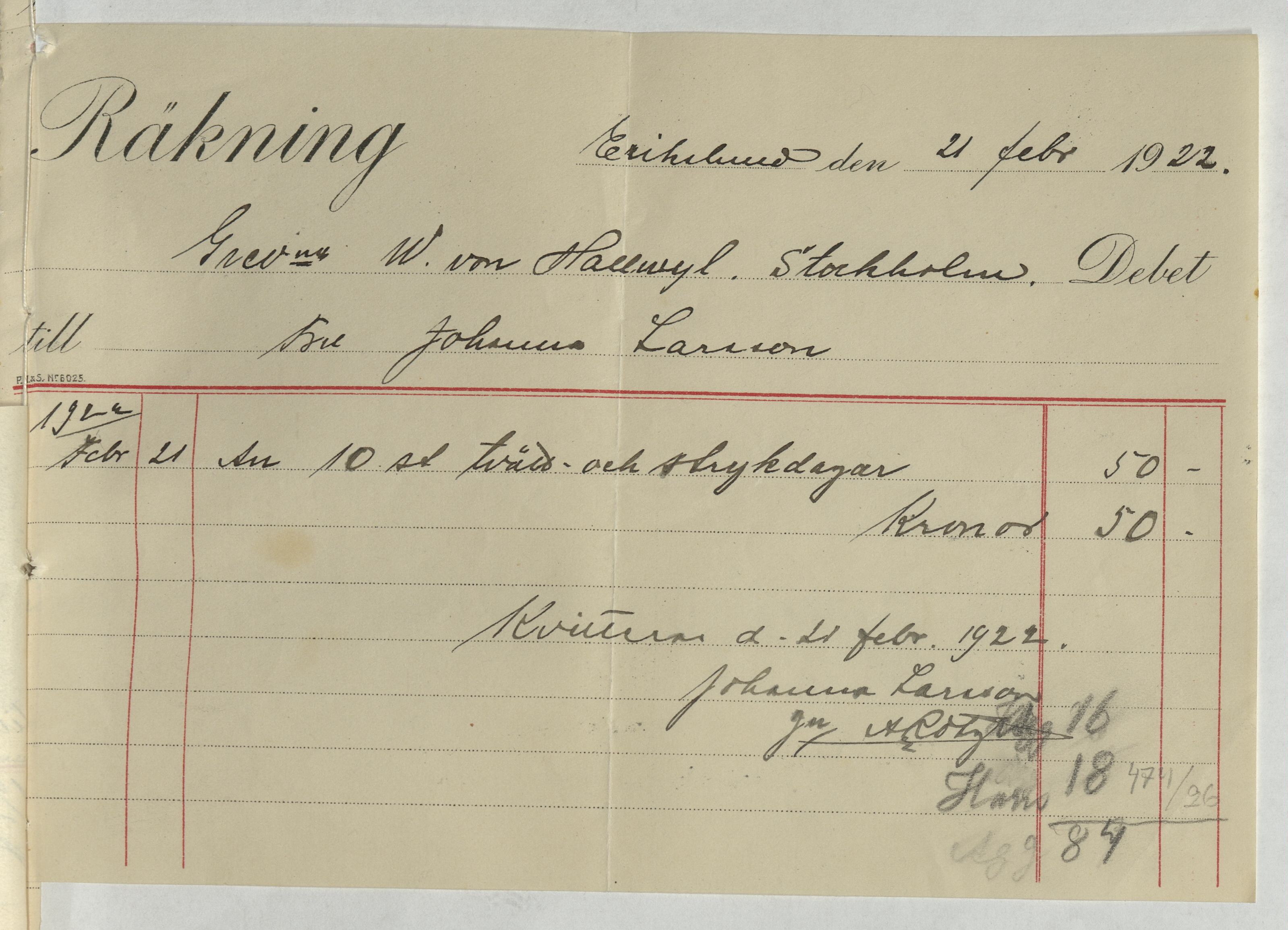 Kvitto från Johanna Larsson vid Erikslund. Gällande 10 stycken tvätt- och strykdagar samt inköp av höns och ägg. Erikslund, 1922.