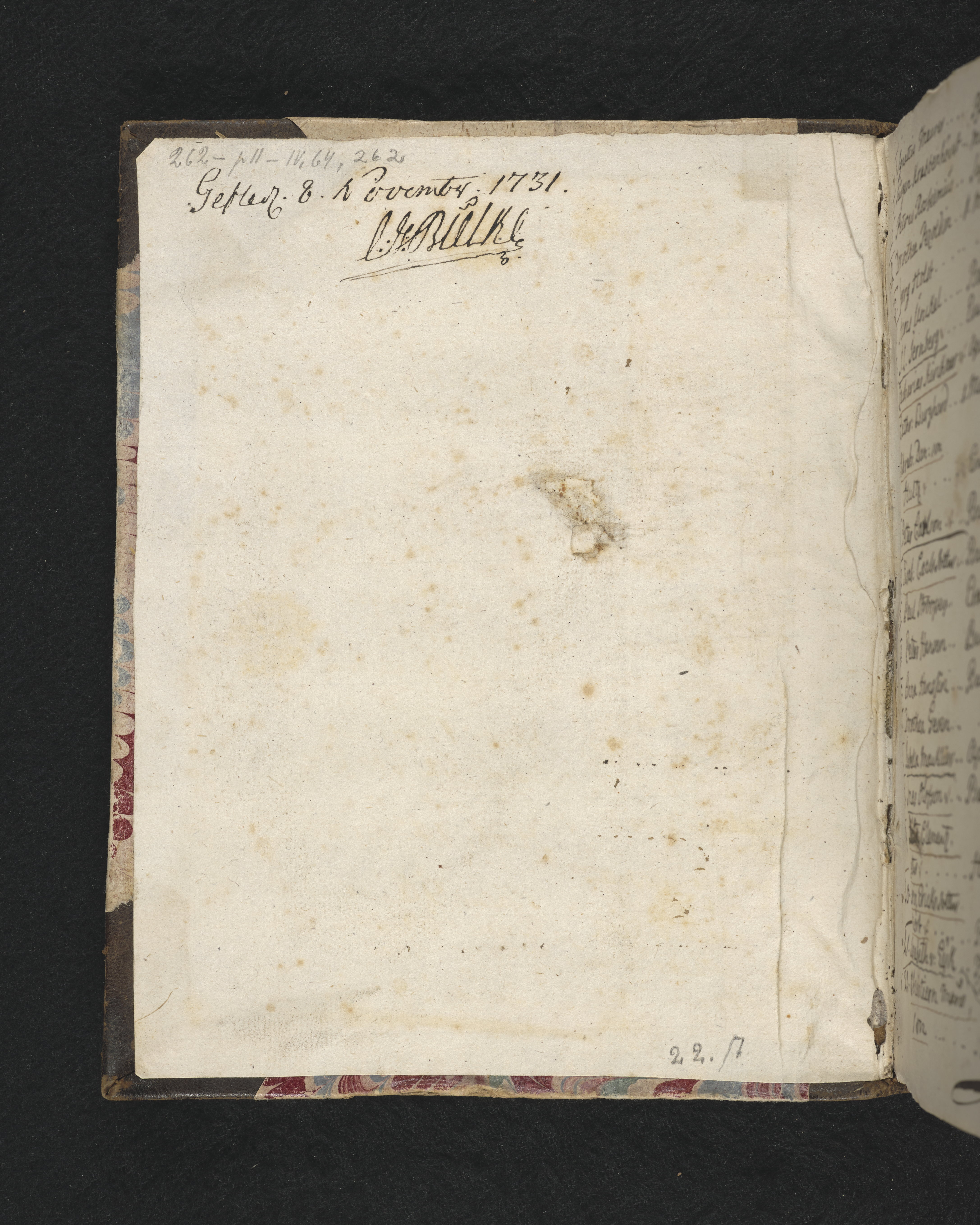Inskription av Carl Gustaf Bielke på främre pärmens insida: "Gefle 8 november 1731." |