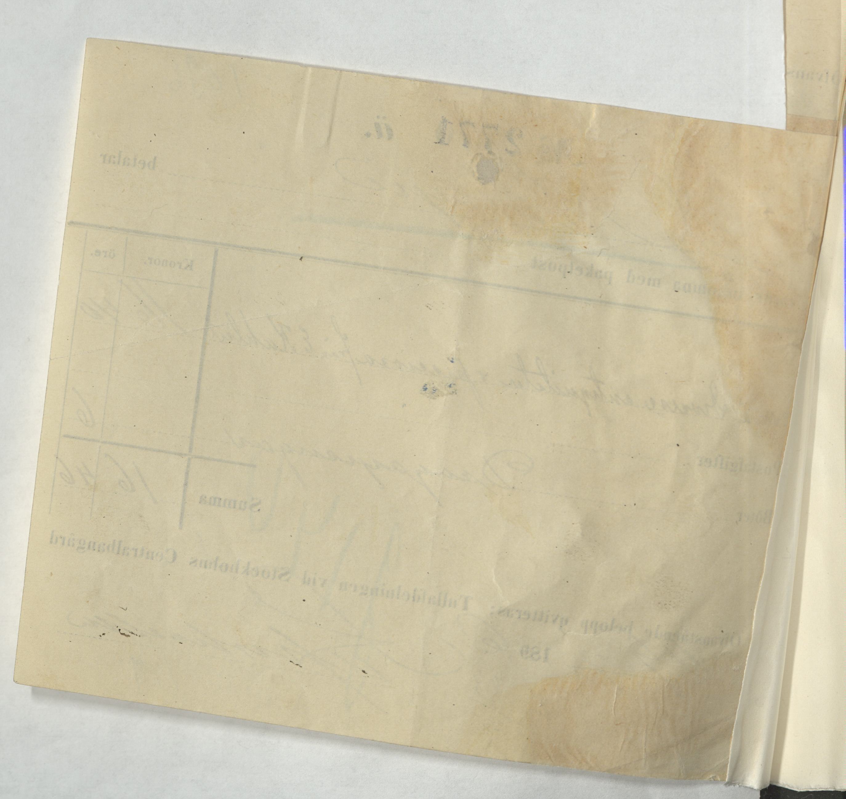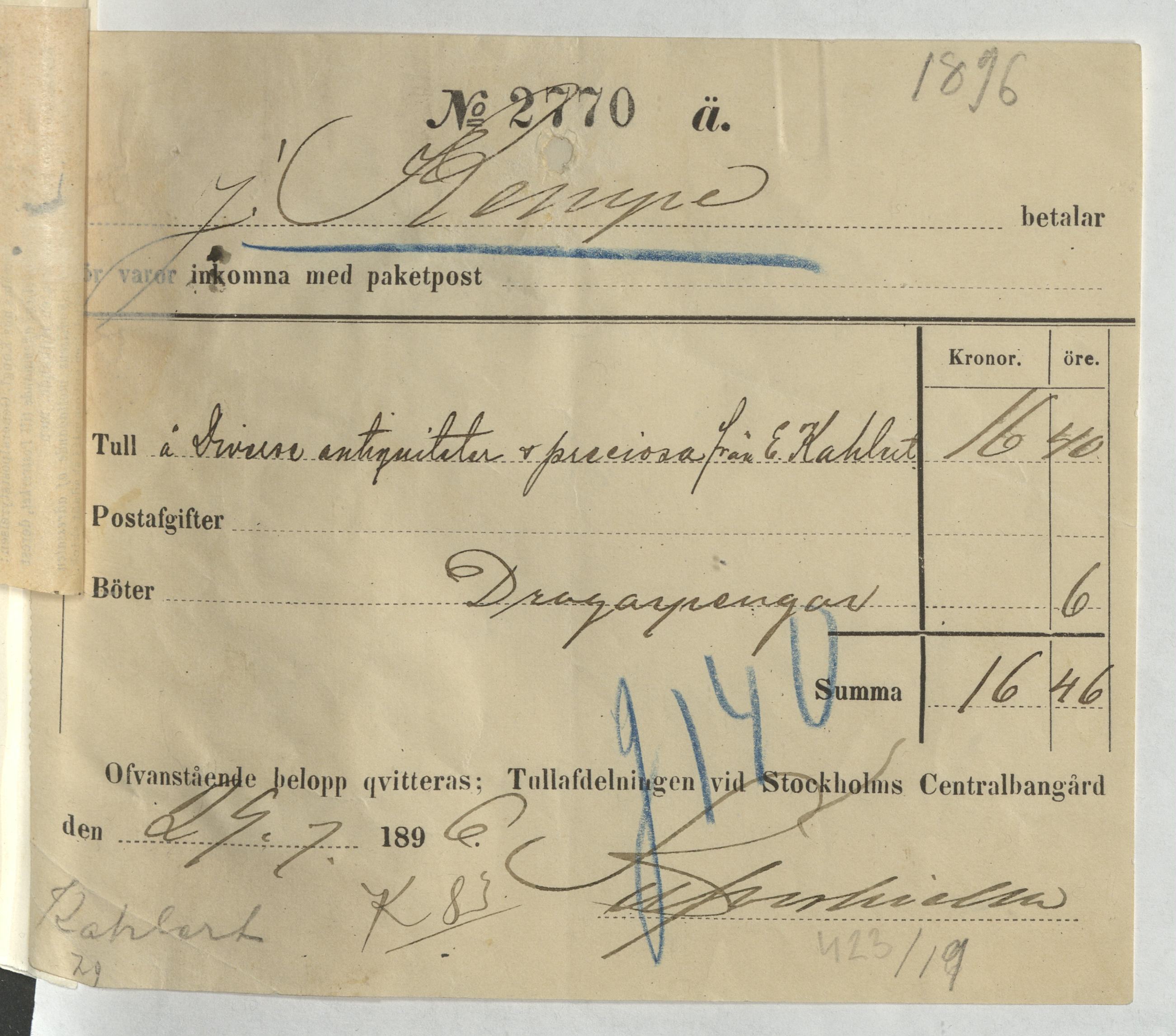 Kvitto från Tullafdelningen vid Stockholms Centralbangård gällande försändelse från Eduard Kahlert. Tull för diverse antikviteter. Stockholm, 1896.