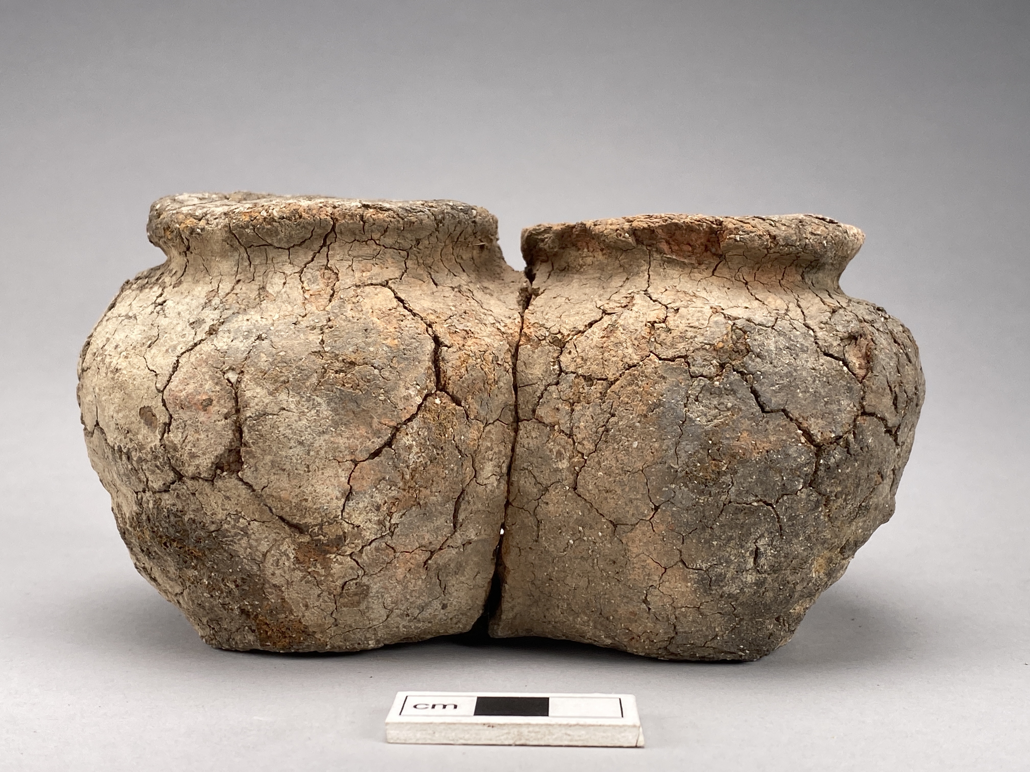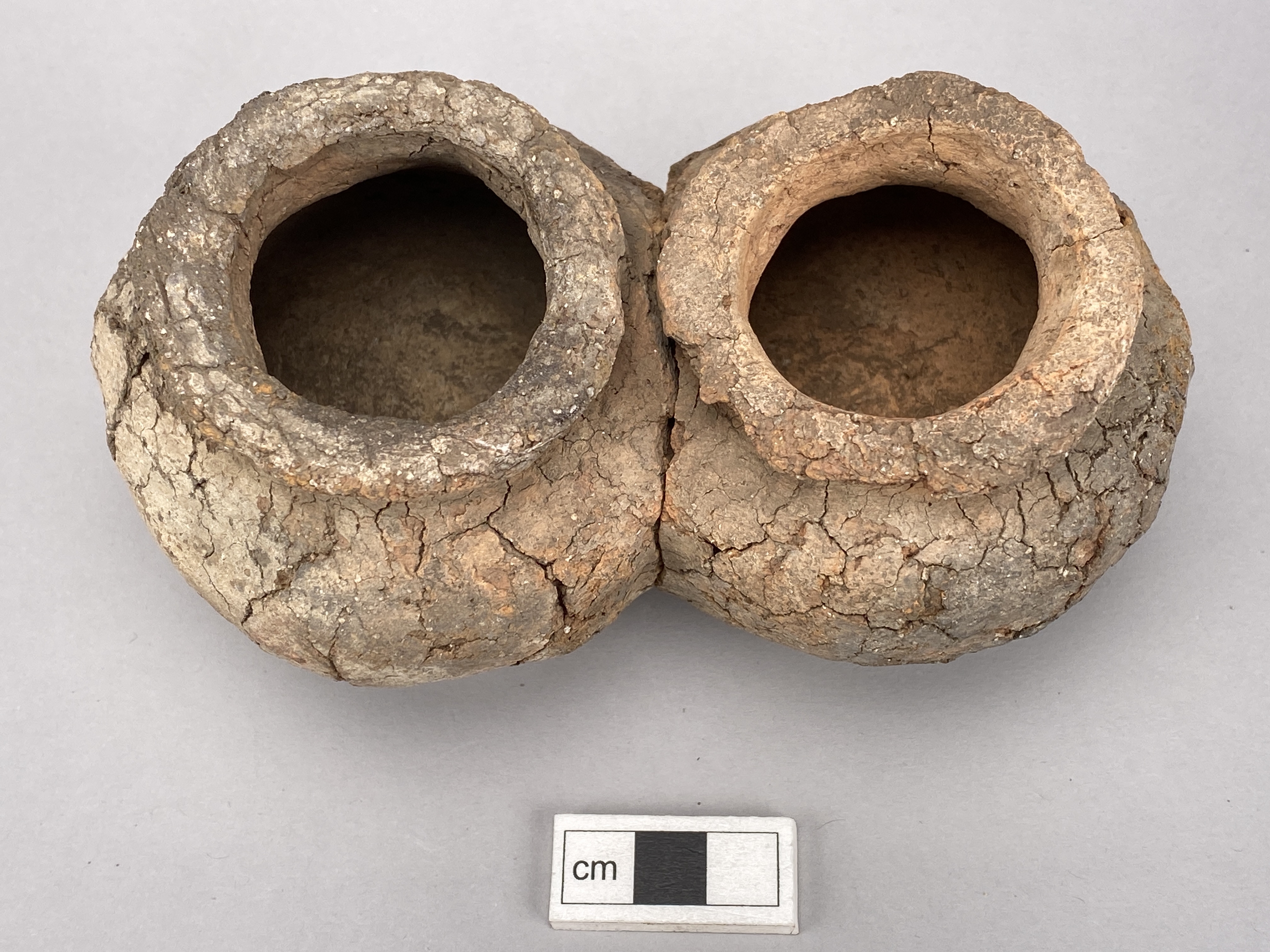 två likstora vaser med starkt indraget mynningsparti. Förtjockad munningsläpp. Sitter ihop sedan tillverkningen vid skuldra-buk. Inget sammanbindande hål mellan kärlen. odekorerade. Starkt sintrade