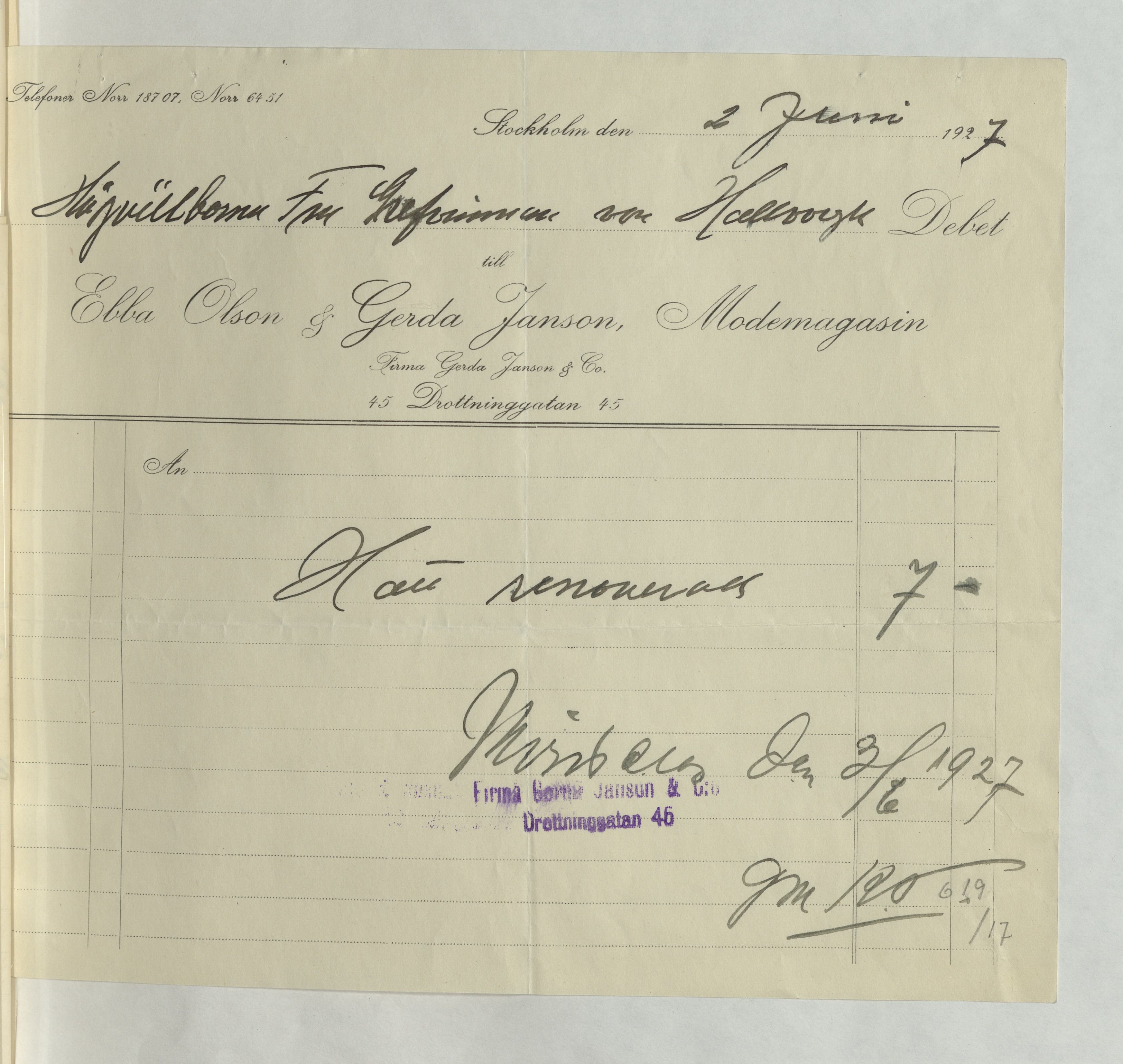 Kvitto från Ebba Olson & Gerda Janson, Modemagasin. Inköpt hatt samt montering, för en totalsumma av 7Kr. Betalt Stockholm 2 januari 1927.