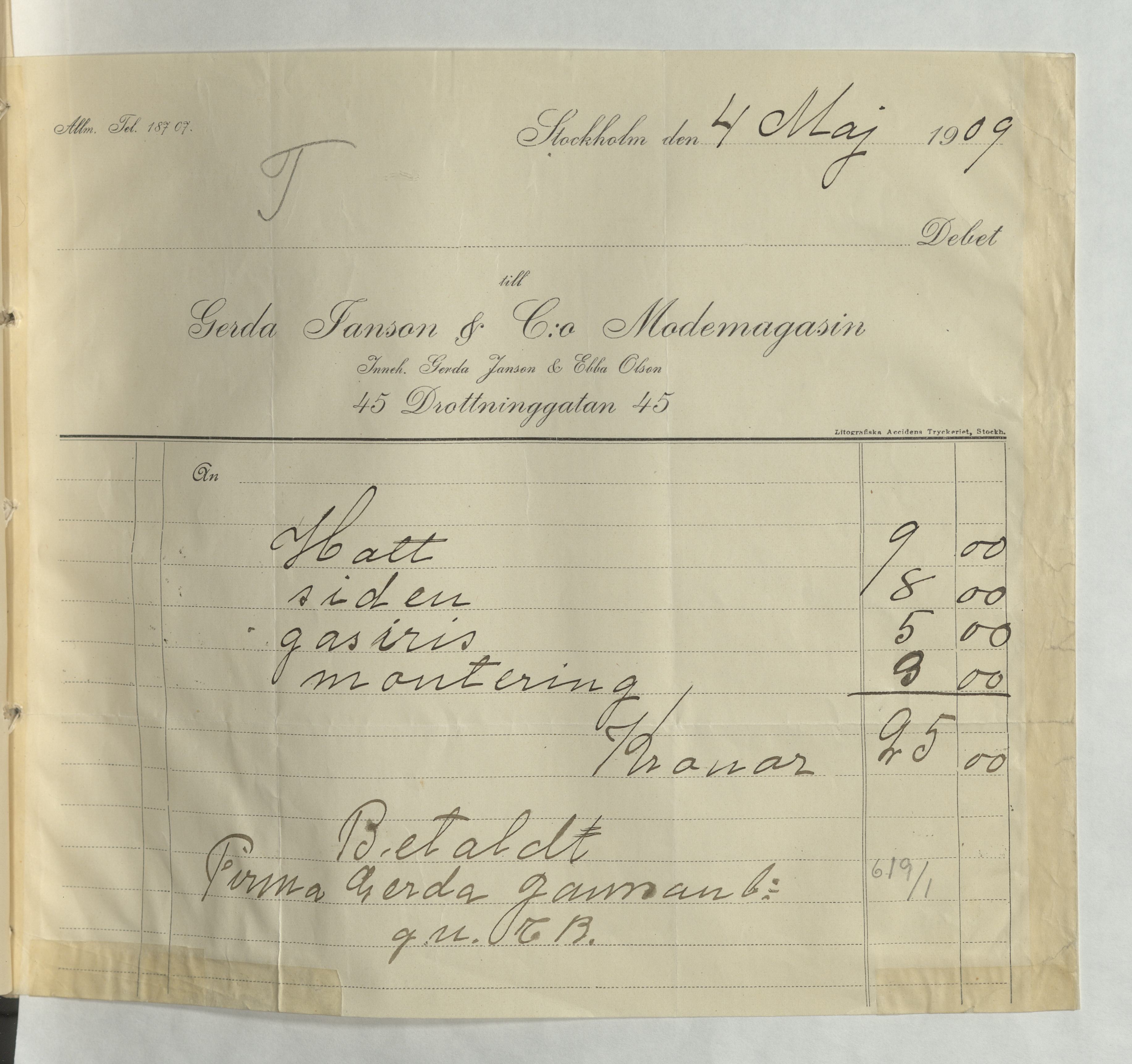 Kvitto från Ebba Olson & Gerda Janson, Modemagasin. Inköpt: Hatt (9kr), med tillhörande siden, gasiris och montering för en totalsumma av 25Kr. Betalt Stockholm 4 maj 1909.