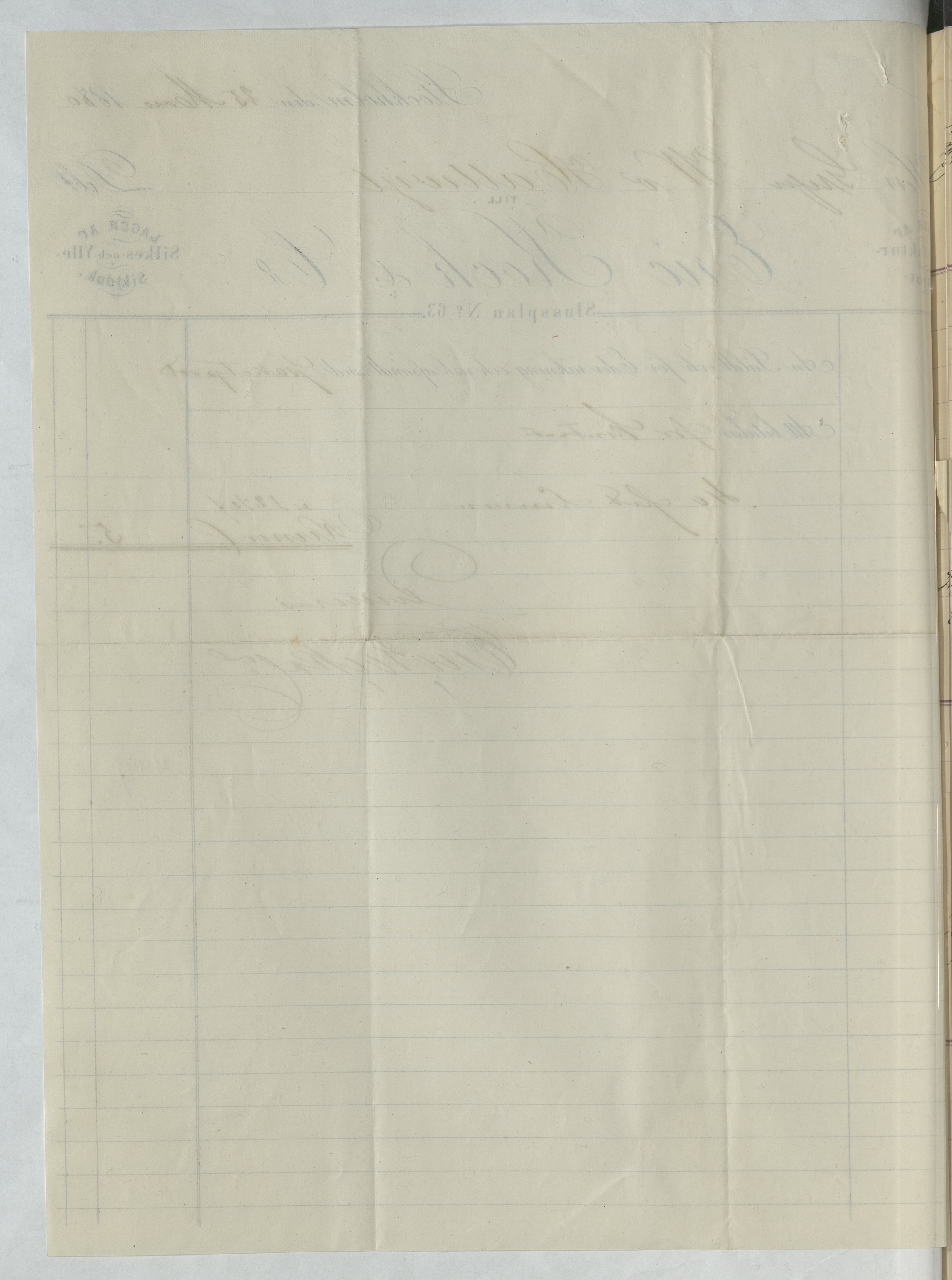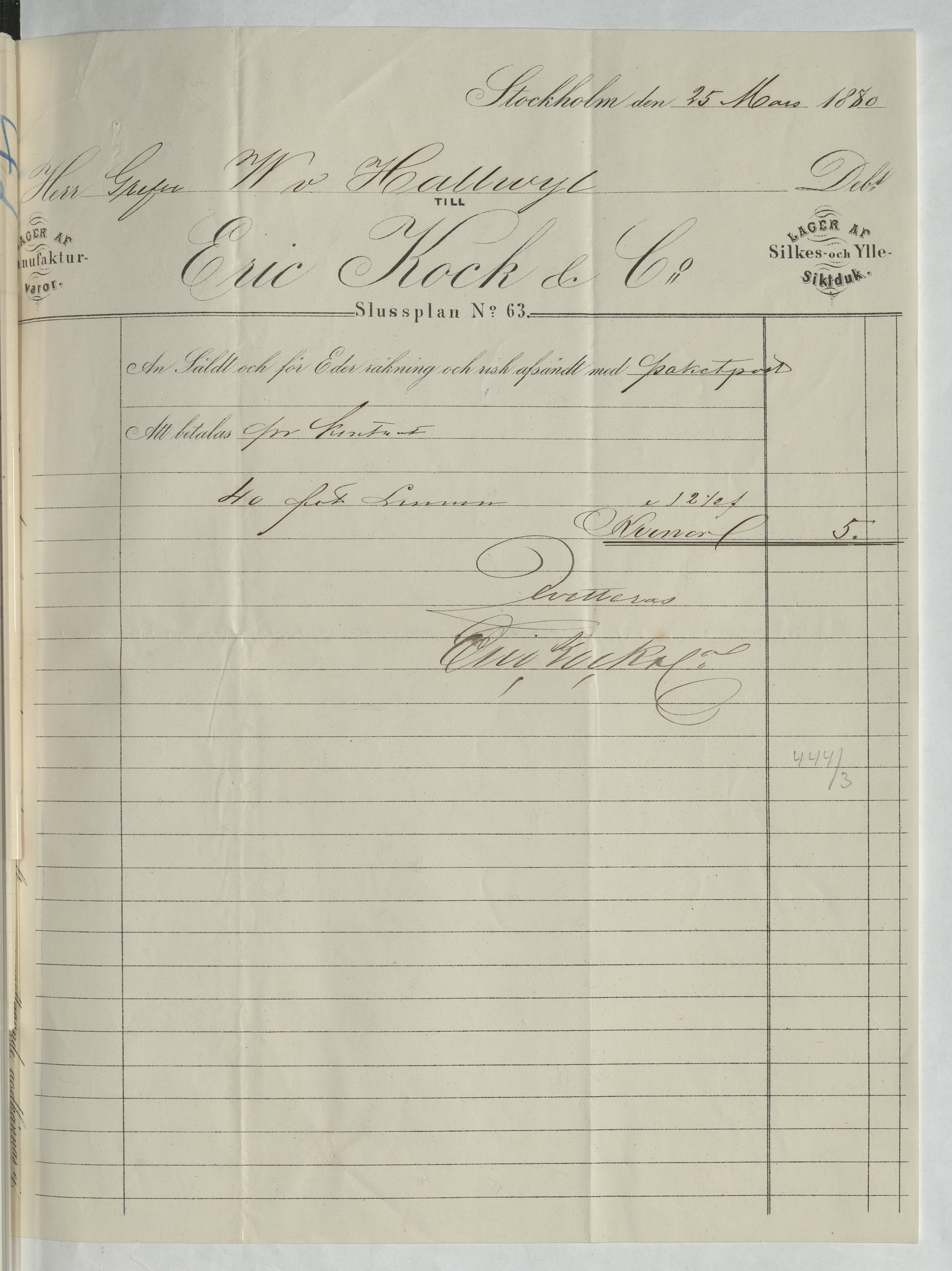 Kvitto från Eric Kock & Co. Alla slags svenska bomullsväfnader, Samt hvita och kulörda filtar till fabrikspris. Stockholm, 1880.