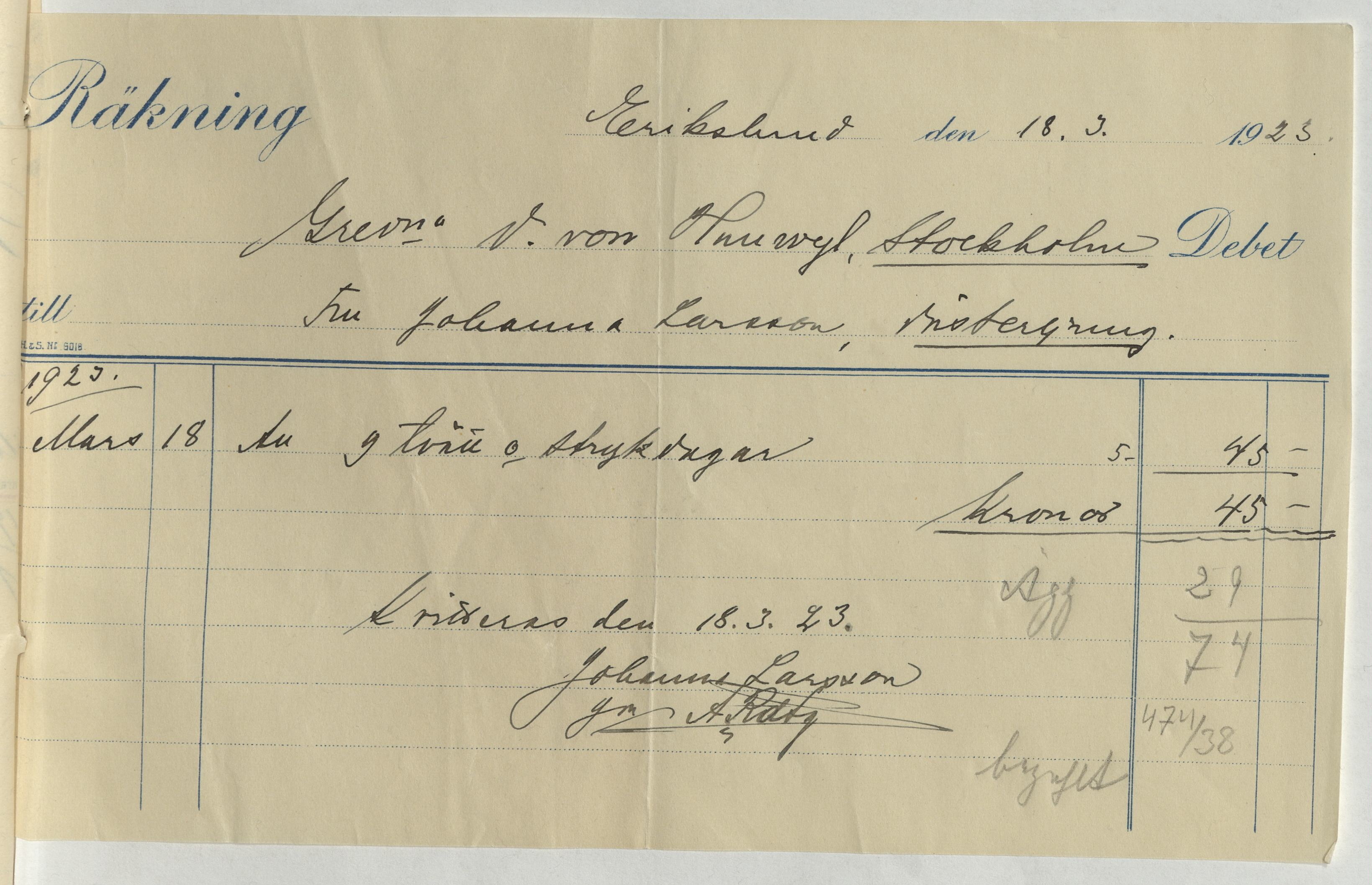 Kvitto från Johanna Larsson vid Erikslund. Gällande 9 tvätt- och strykdagar samt inköp av ägg. Erikslund, 1923.