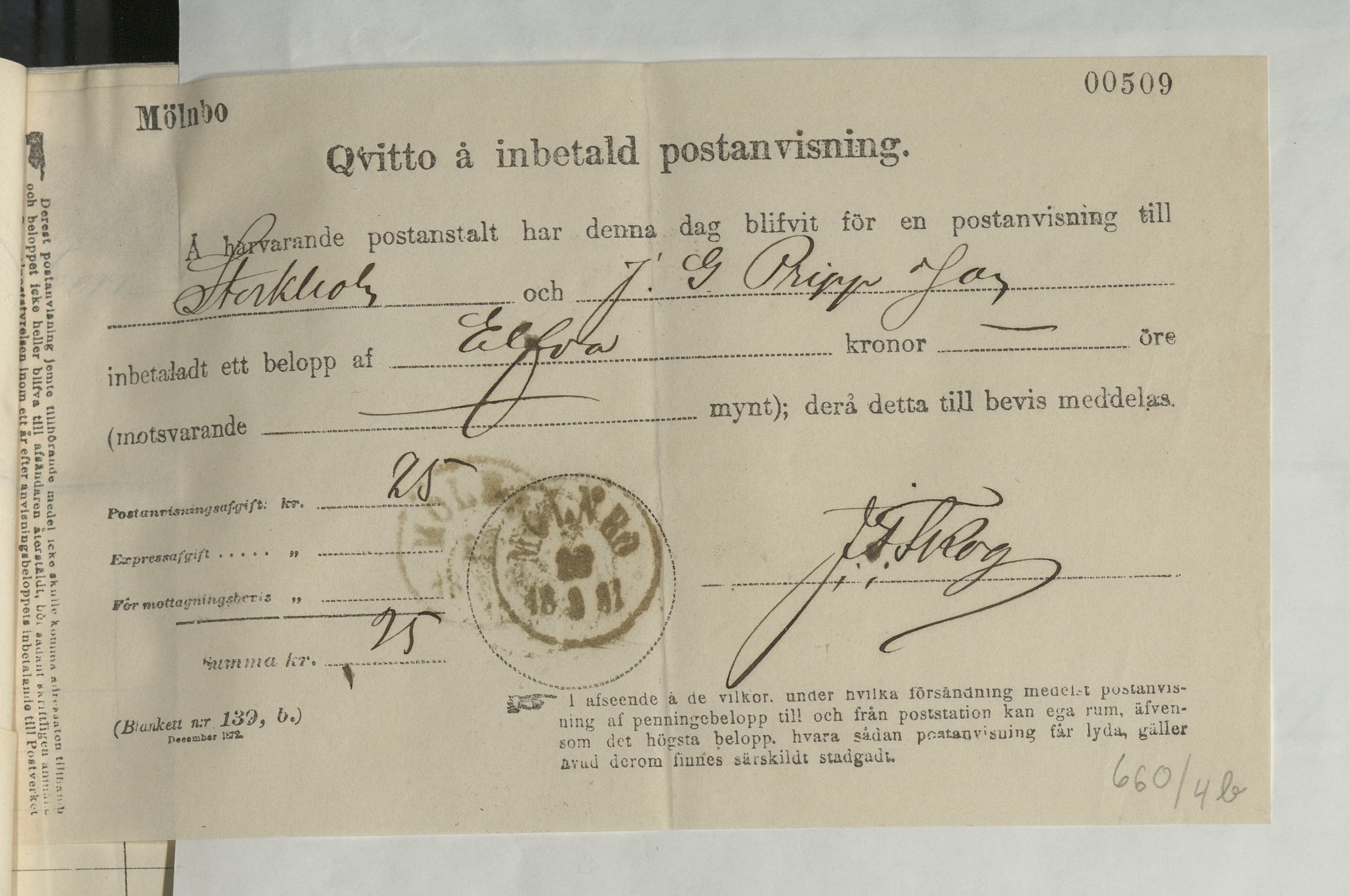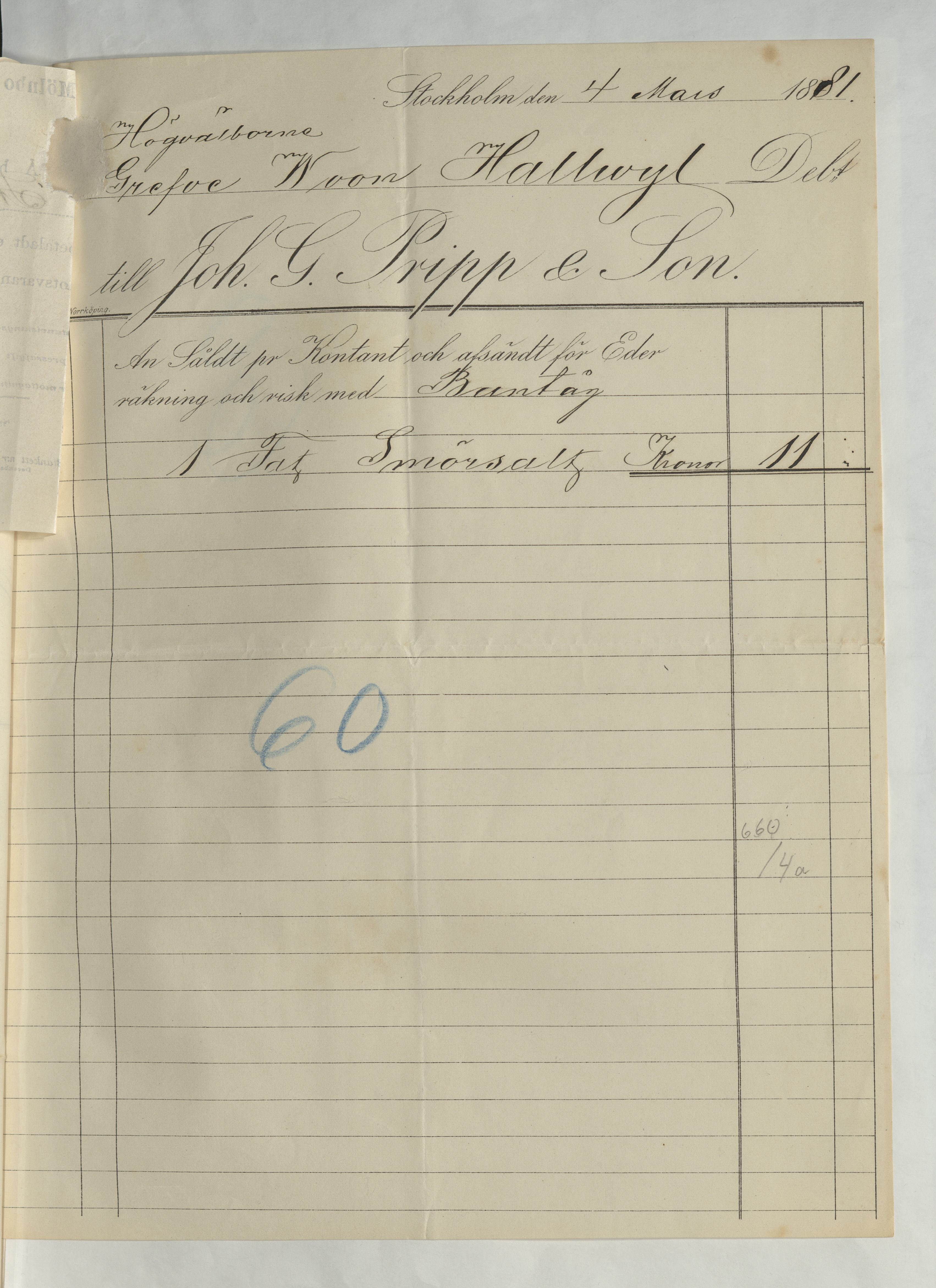 Kvitto från John. G. Pripp & Son till Greve W. von Hallwyl. 11Kr betalt, 4 mars 1881.