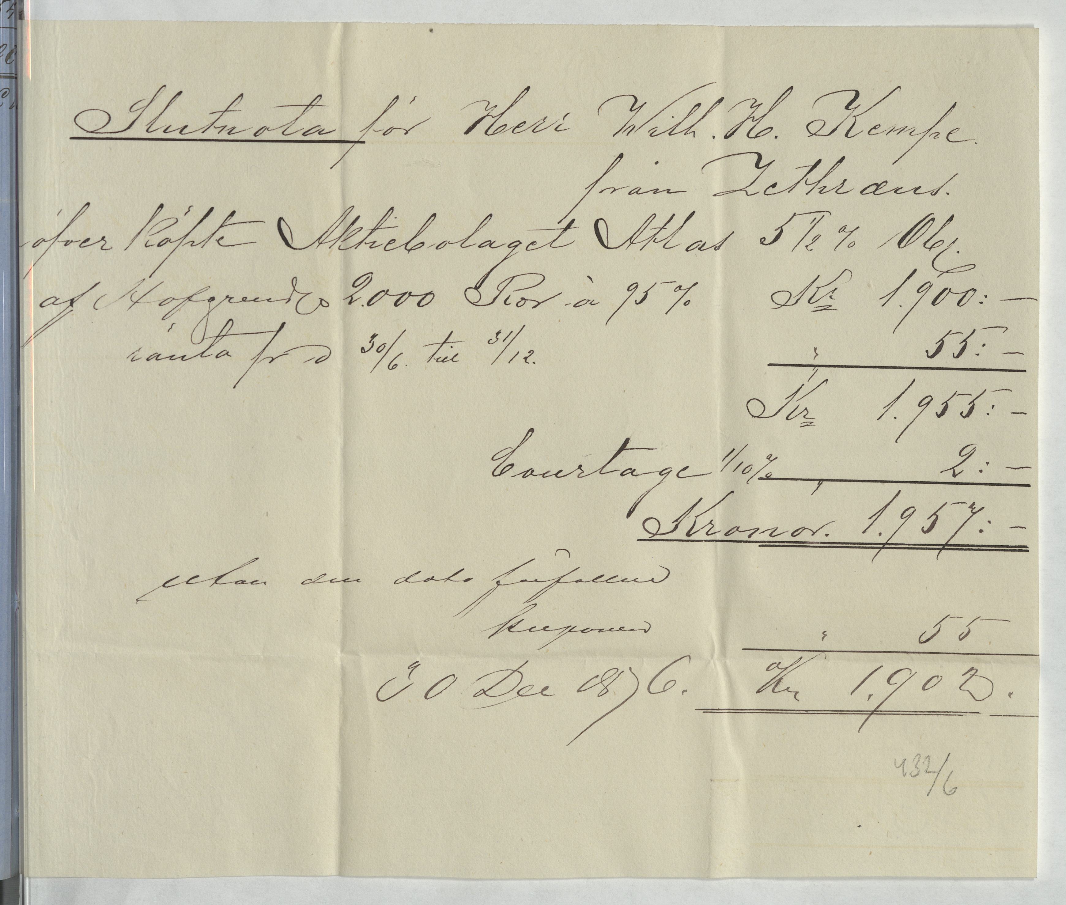 Kvitto rörande Wilhelm H. Kempe som delar av Aktiebolaget Atlas 1876.