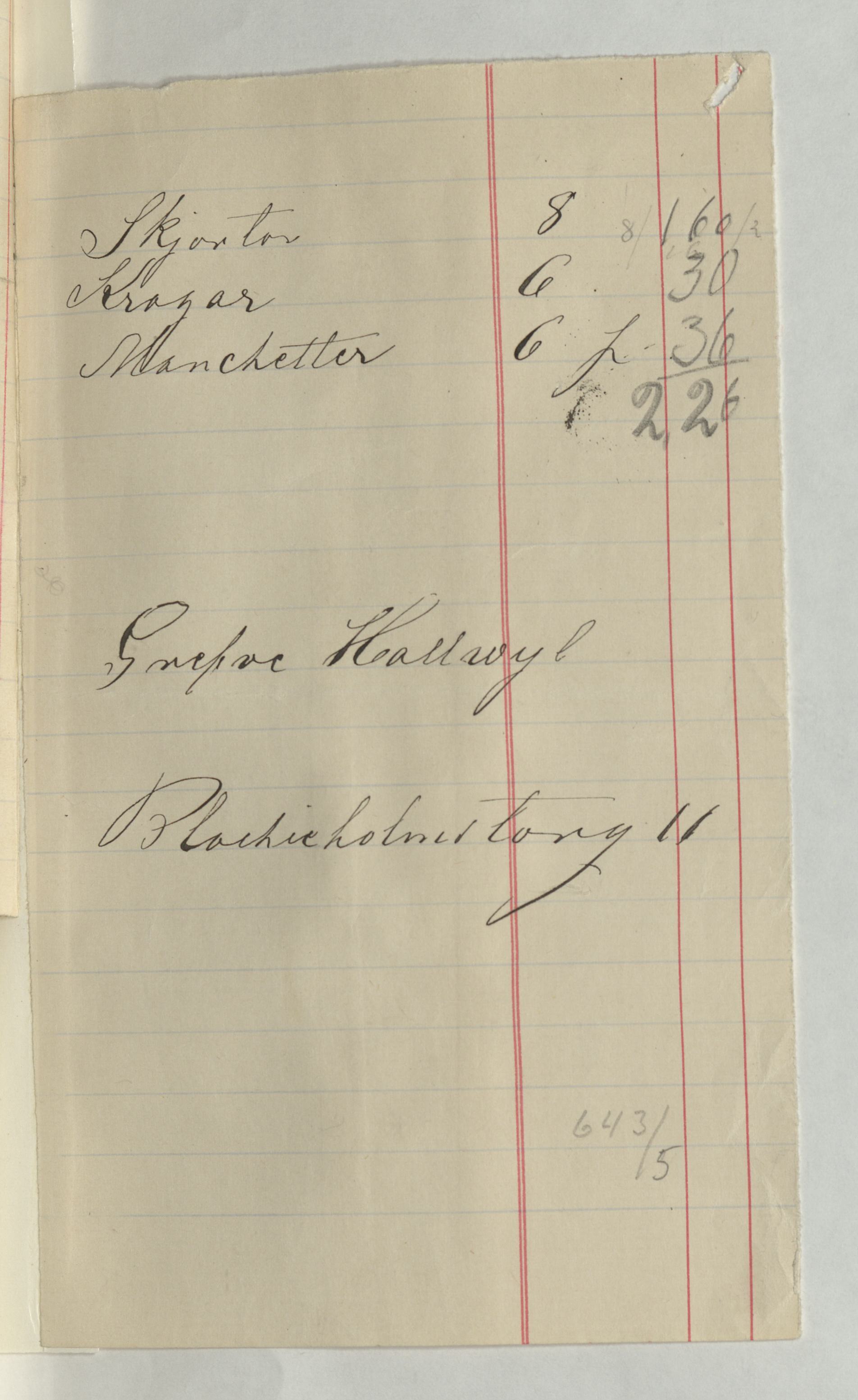 Kvitto från Fru Pettersson, Skjorttvätt, för 8st skjortor, 6 manchetter och 6 kragar. 226Kr betald av Greve Hallwyl. Odat.