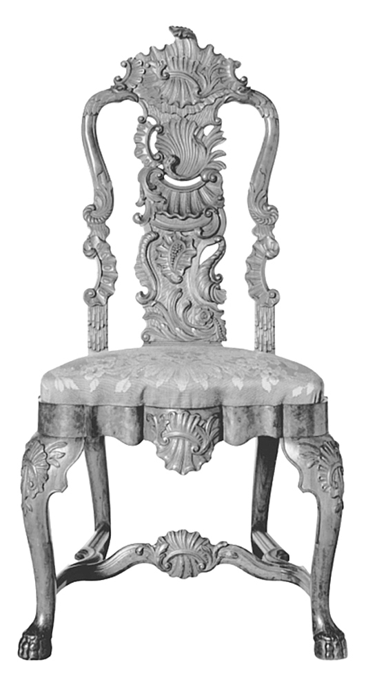 STOL. Sannolikt nederländskt arbete från 1700-talets mitt. En av sex stycken likadana inköpta hos konsthandlaren H Bukowski i Stockholm 1887. Av valnötsträ med höga och rikt skurna ryggar. Stolarna inköptes vid auktion efter byggmästare E.A.Bohman i Stockholm 1887. Tidigare proveniens från slottet Hesselby i Uppland. Ur Bukowskis auktionskatalog november 1887: "Stolar af björk, 6 st, rikt skulpterade med höga inåt svängda ryggar, prydda med rik skulptur i mönster övergående till barockstil. Vackert holländskt arbete från 1700-talets början. Från Hesselby, gammal egendom i Bondeslägten." Utgör del av möbeluppsats VI:II:A.a.08. bestående av en soffa, sex länstolar och sex stolar.